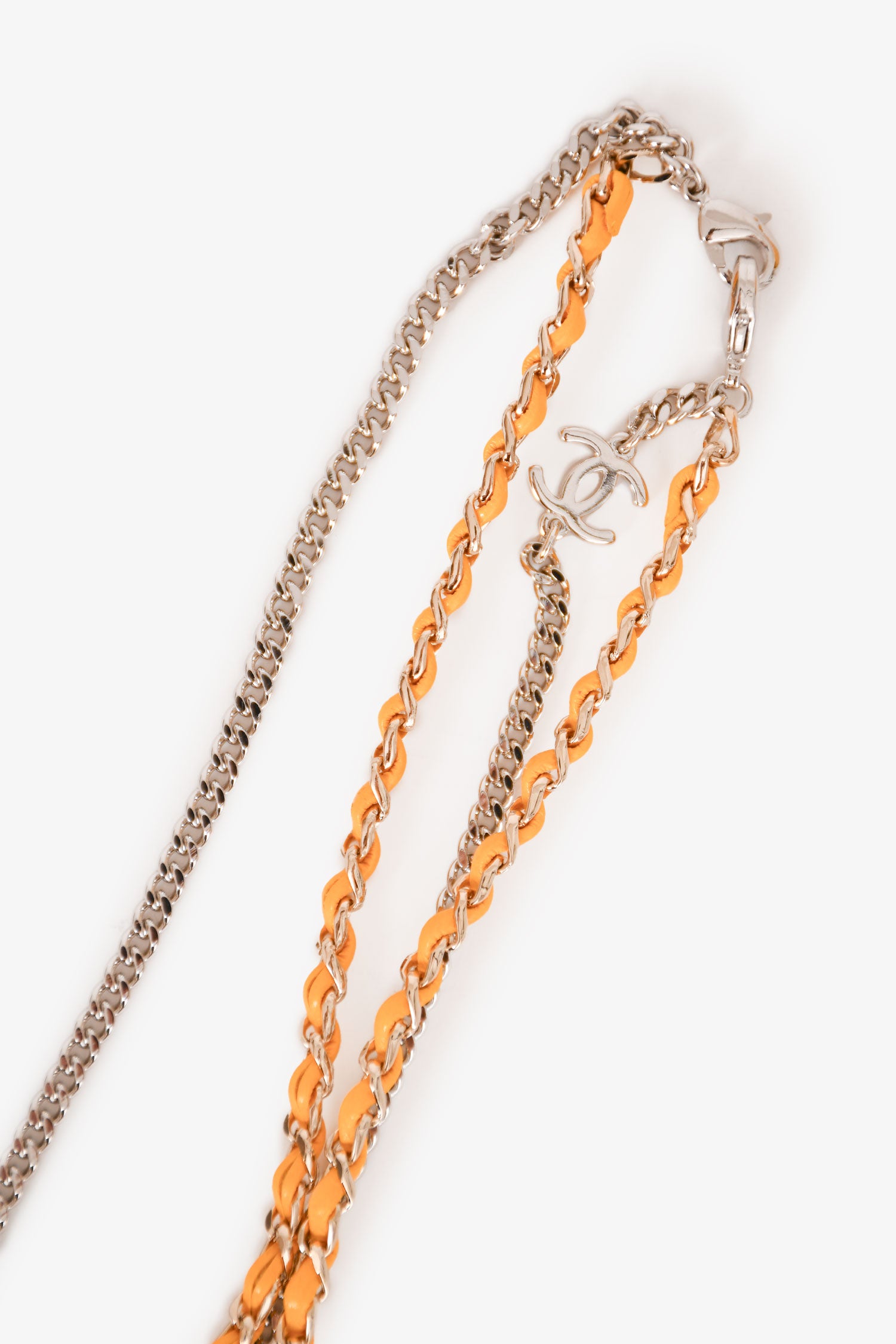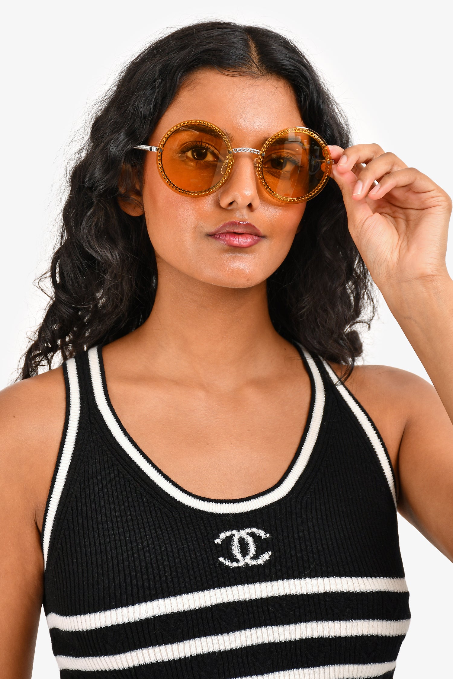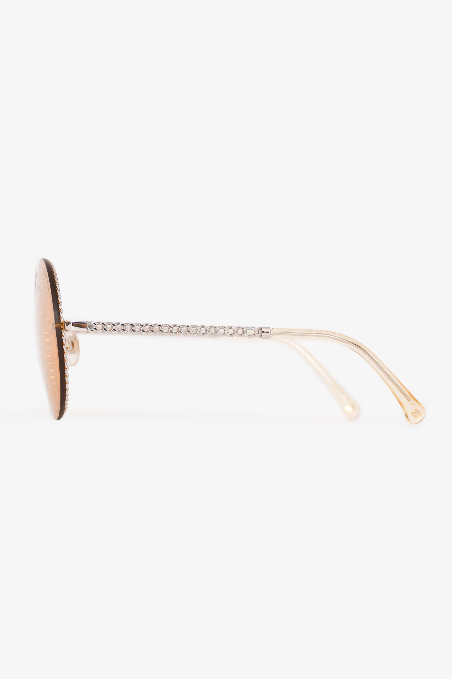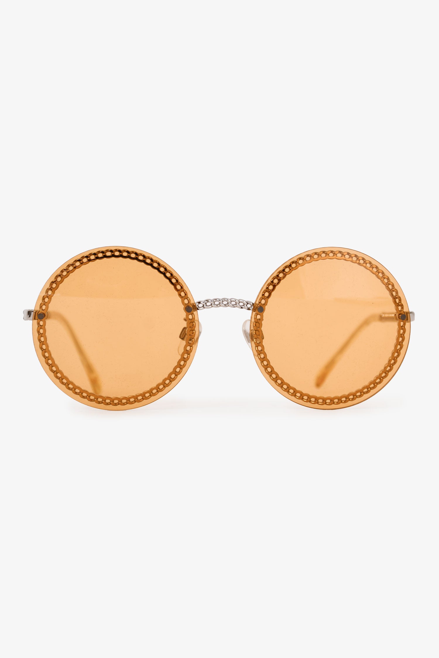 Refresh availabilityPre-Loved Chanel™ Silver-Tone/Yellow Round Framed Sunglass with Chain. Round Detachable leather link chain with logo detail. Adjustable nose pads.
