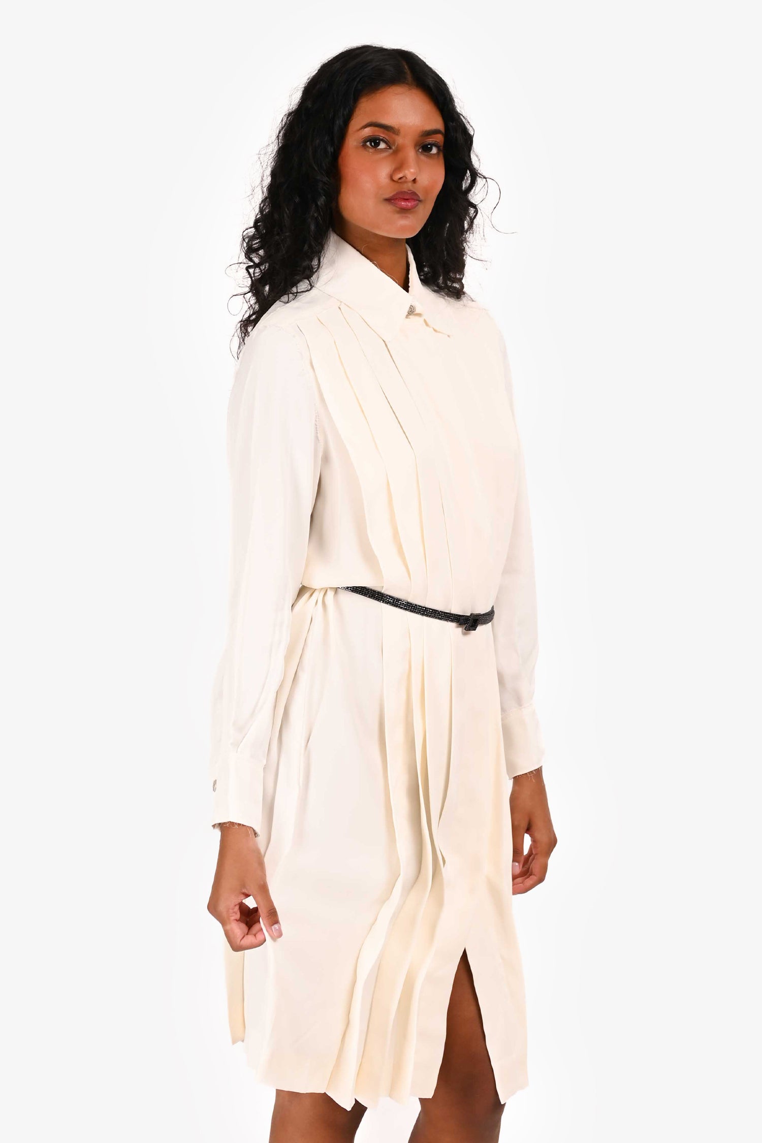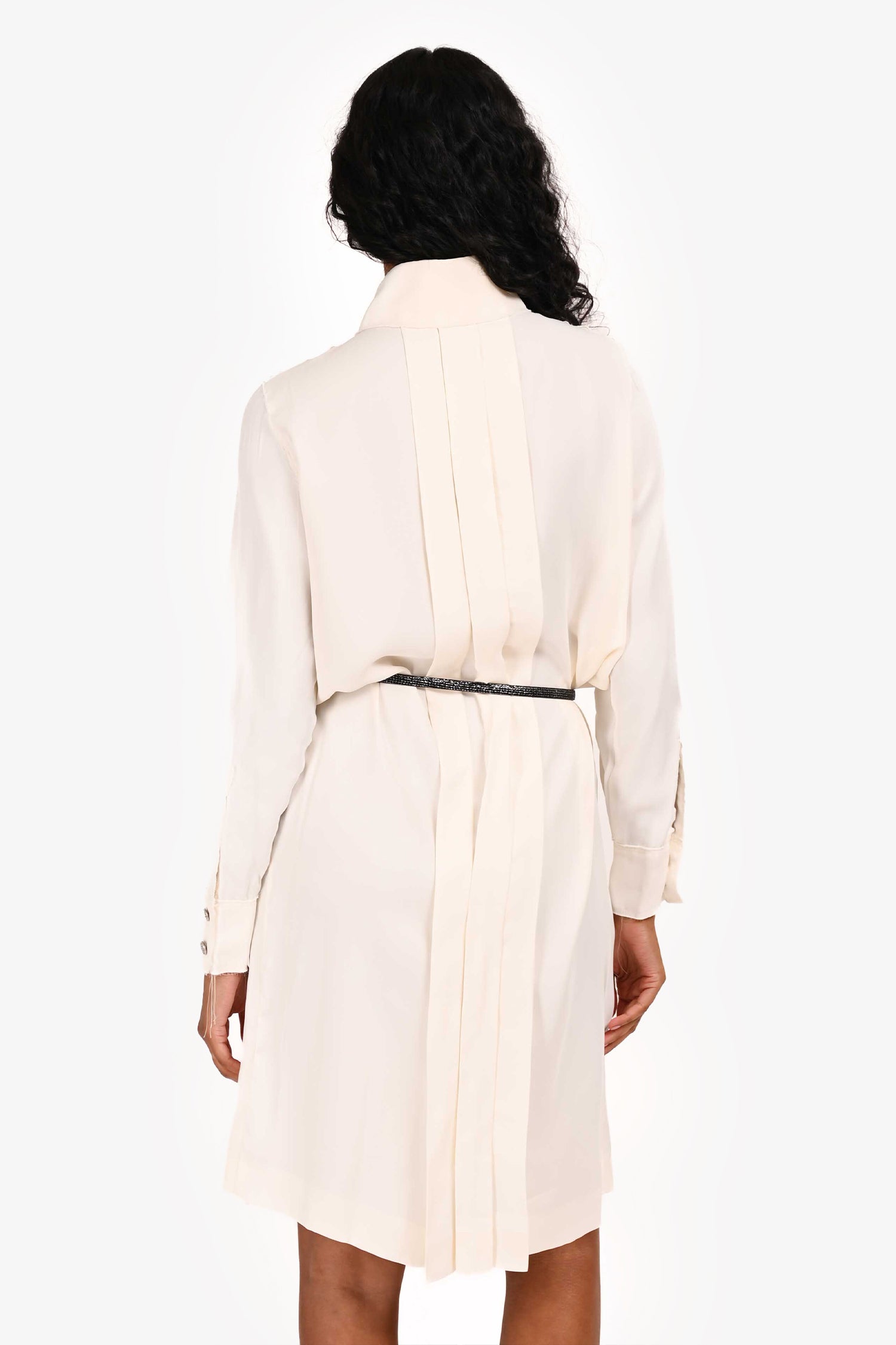 Pre-Loved Chanel™  White Distressed Detailed Plated Shirt Dress. Slip-on. Classic point collar. Front button closure. Long sleeves with buttoned cuffs. Distressed detailing throughout with pleated skirt construction. Fraying design along the edges. Removable belt at waistline with tie-up closure. Tonal stitching.