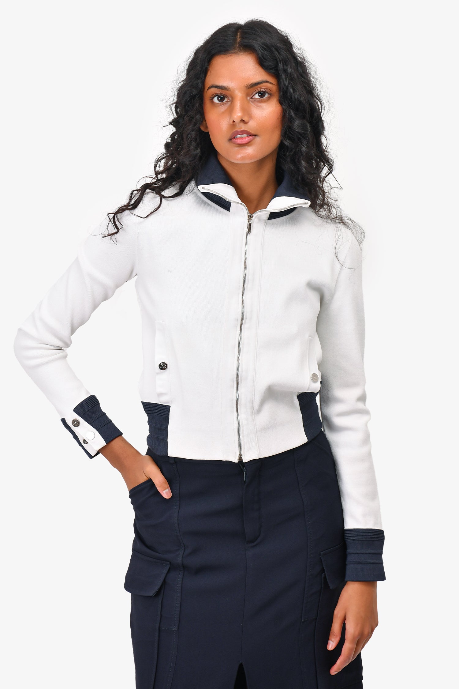 Pre-Loved Chanel White/Navy Trim Collared Zip Up Sweater. Front zip-up closure. Silver-tone hardware. Two front pockets with snap-on button closure. Tonal stitching.