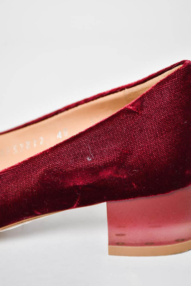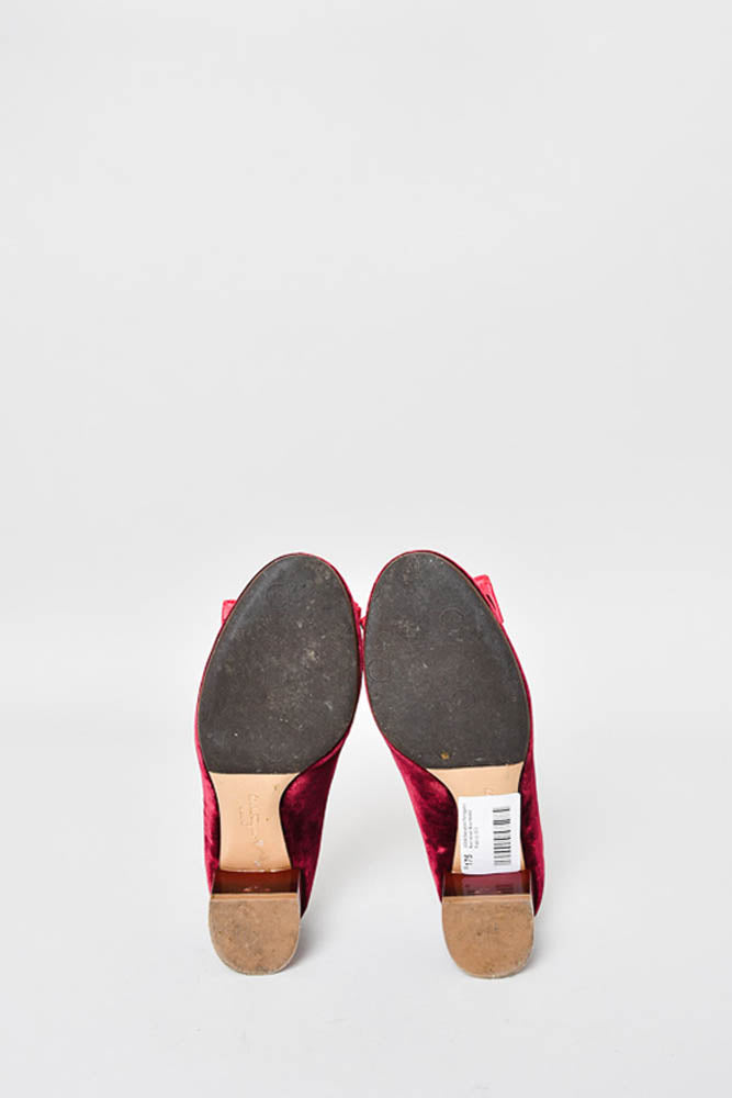 Refresh availabilitySalvatore Ferragamo Red Velvet Bow Heeled Flats. Round toe. Slip-on. Block heel. Tonal stitching. Topy soles.