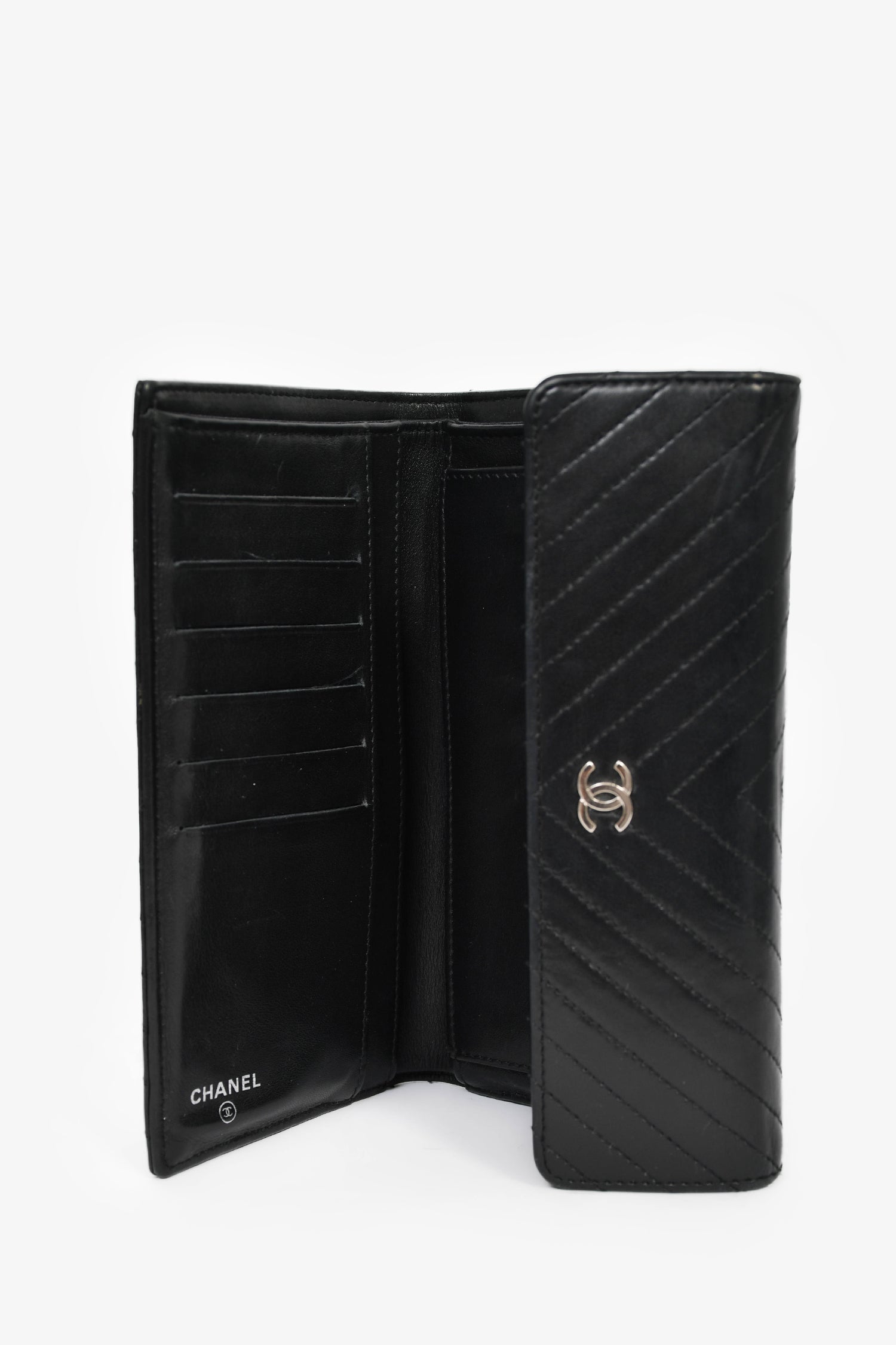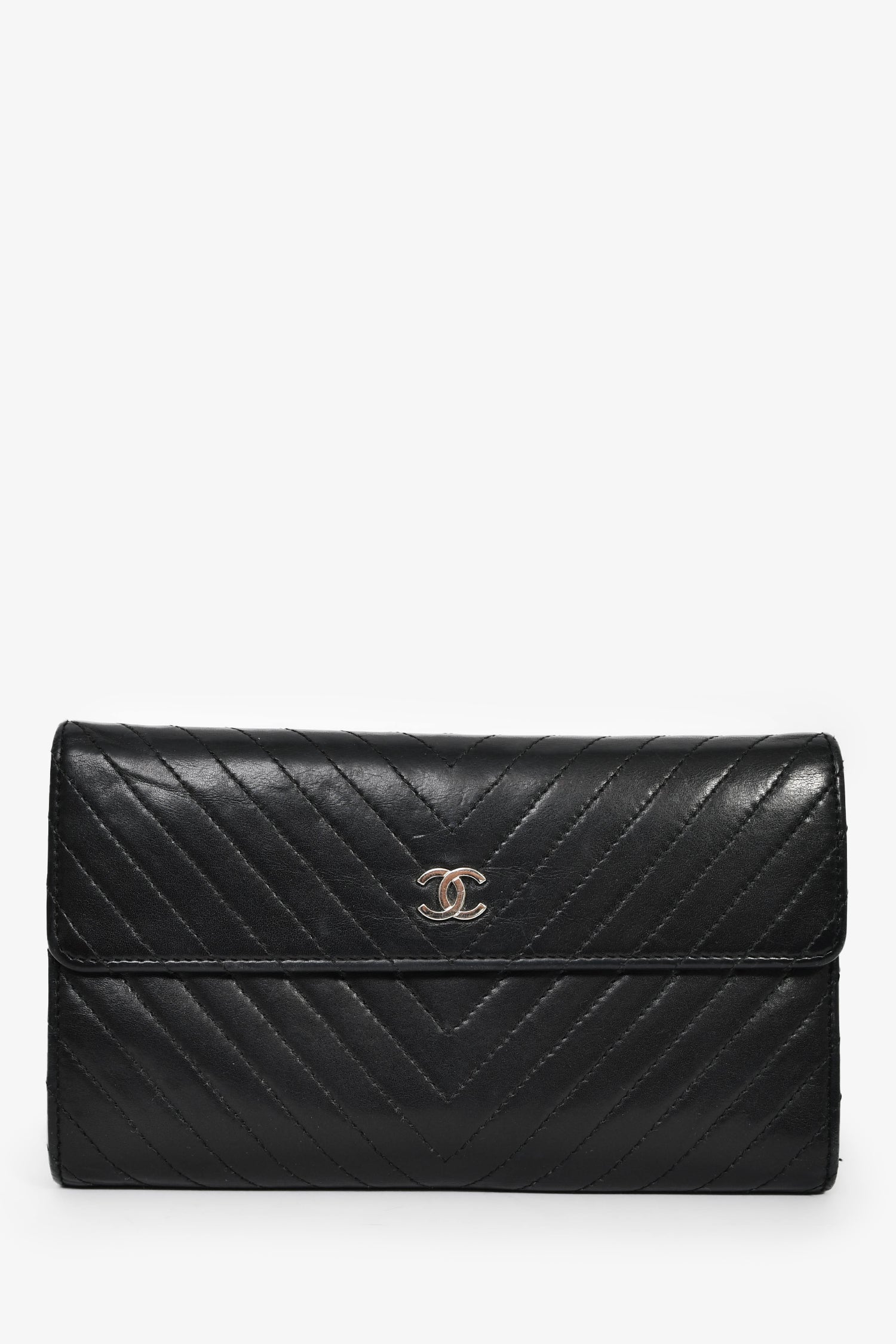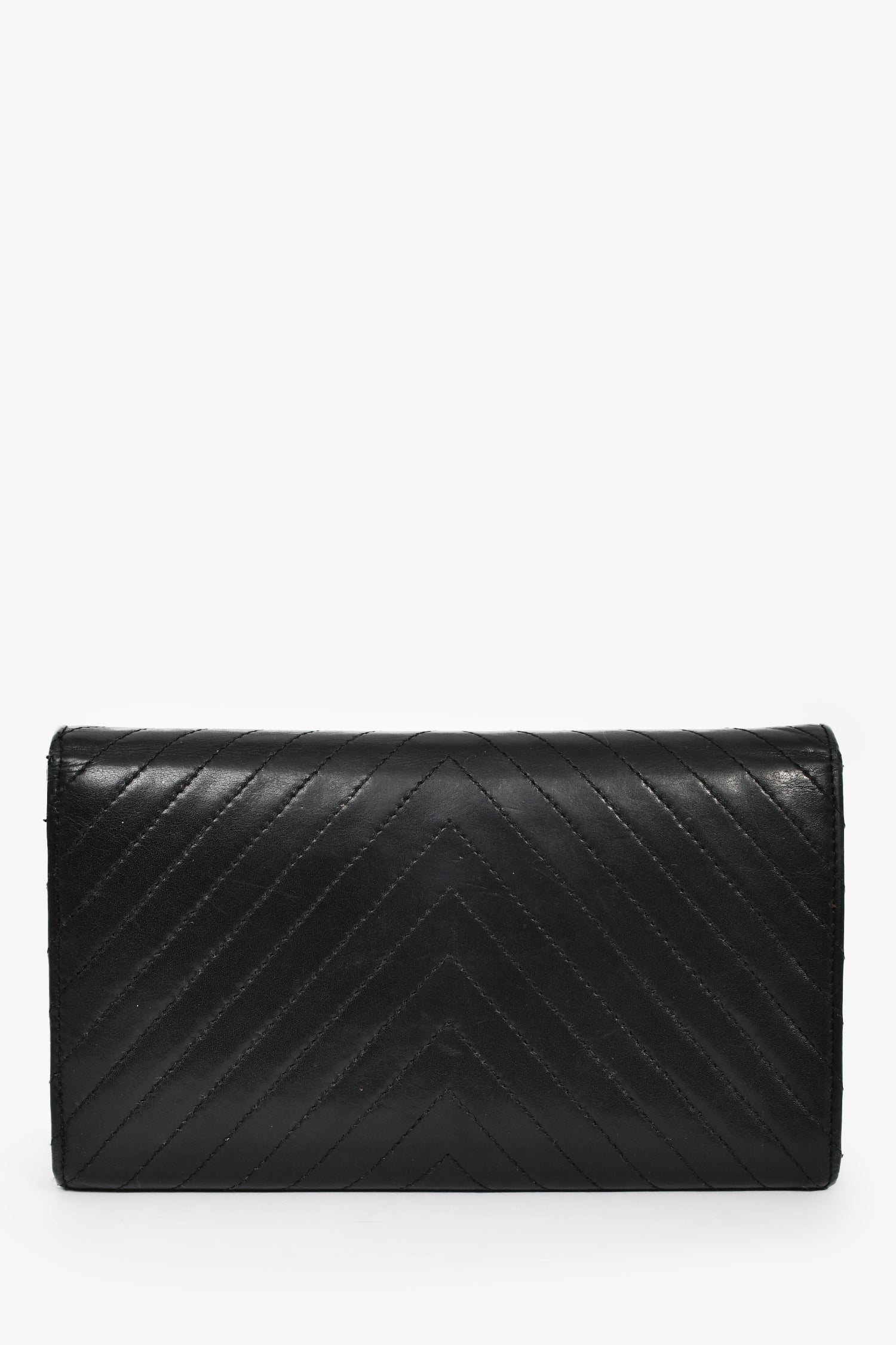 Refresh availabilityPre-Loved Chanel™ 2006-08 Black Chevron Leather Long Wallet. Front fold-over flap with snap-button closure. 6 card slots. 5 billfold compartments. 1 coin compartment with fold-over flap and snap-button closure. Silver-tone hardware. Tonal stitching.