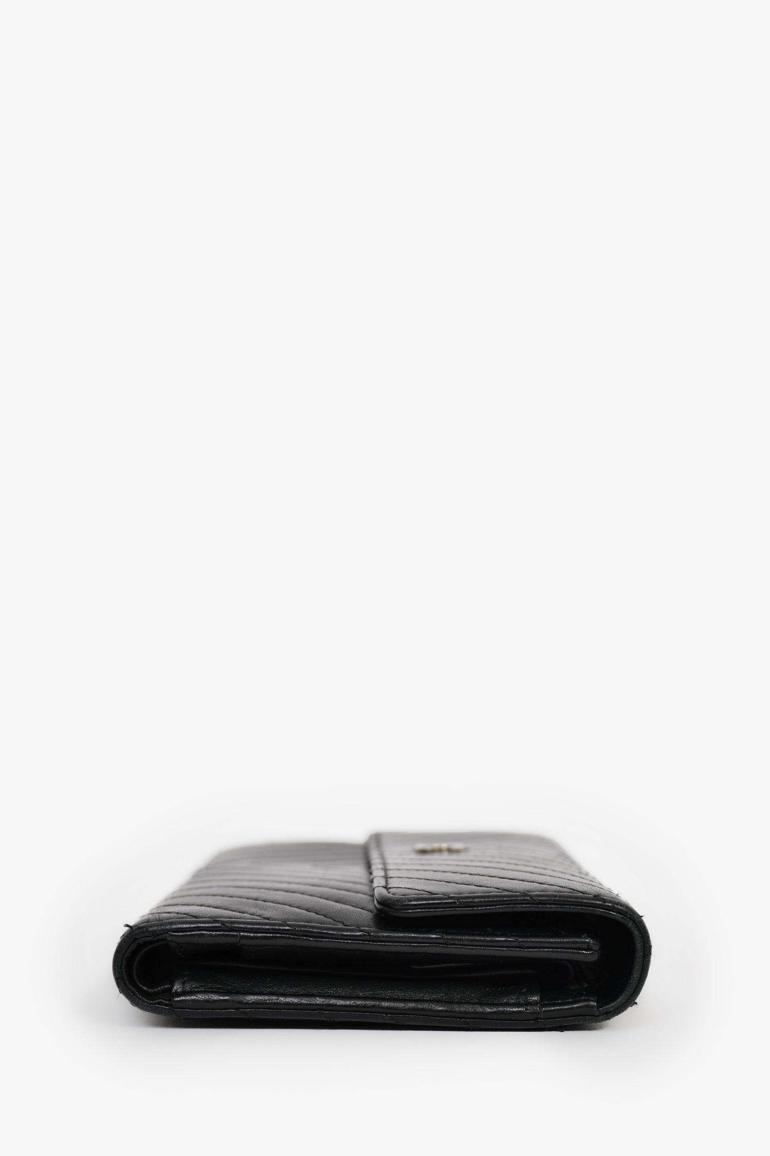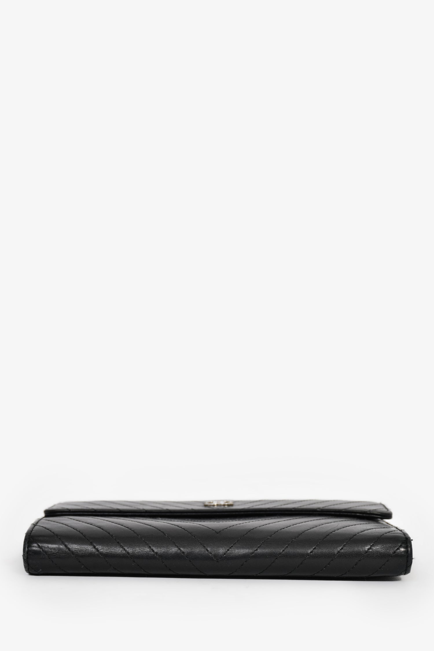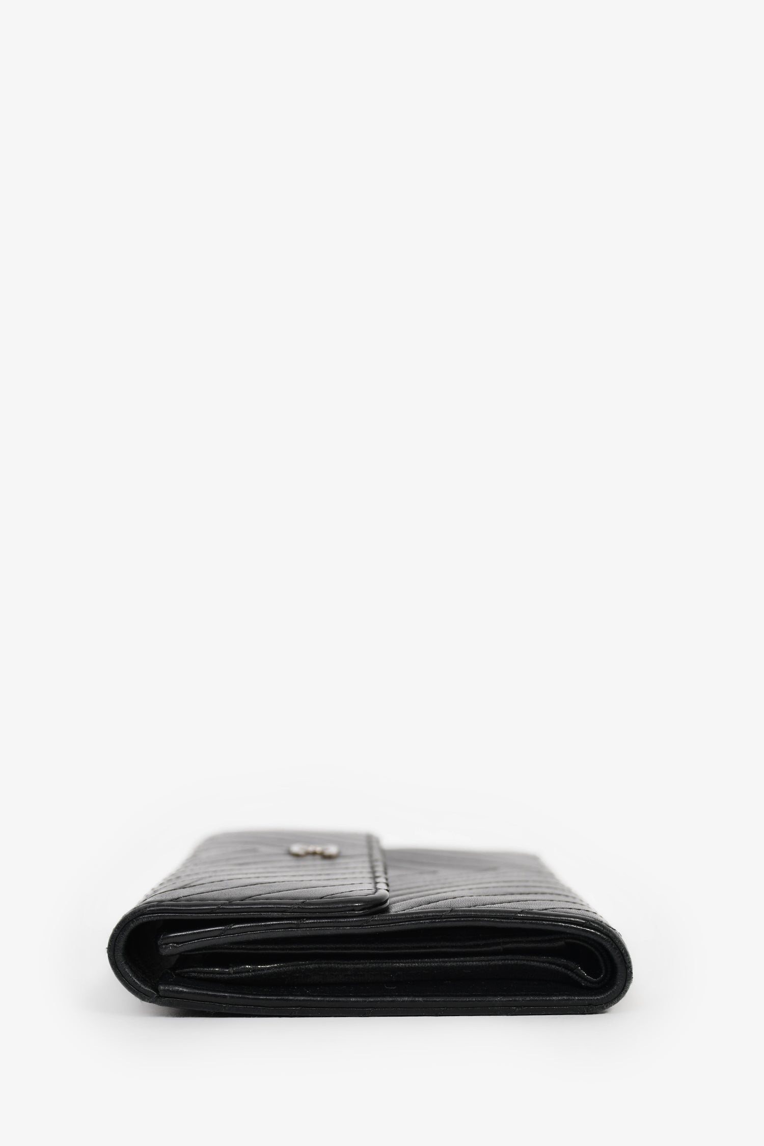 Refresh availabilityPre-Loved Chanel™ 2006-08 Black Chevron Leather Long Wallet. Front fold-over flap with snap-button closure. 6 card slots. 5 billfold compartments. 1 coin compartment with fold-over flap and snap-button closure. Silver-tone hardware. Tonal stitching.