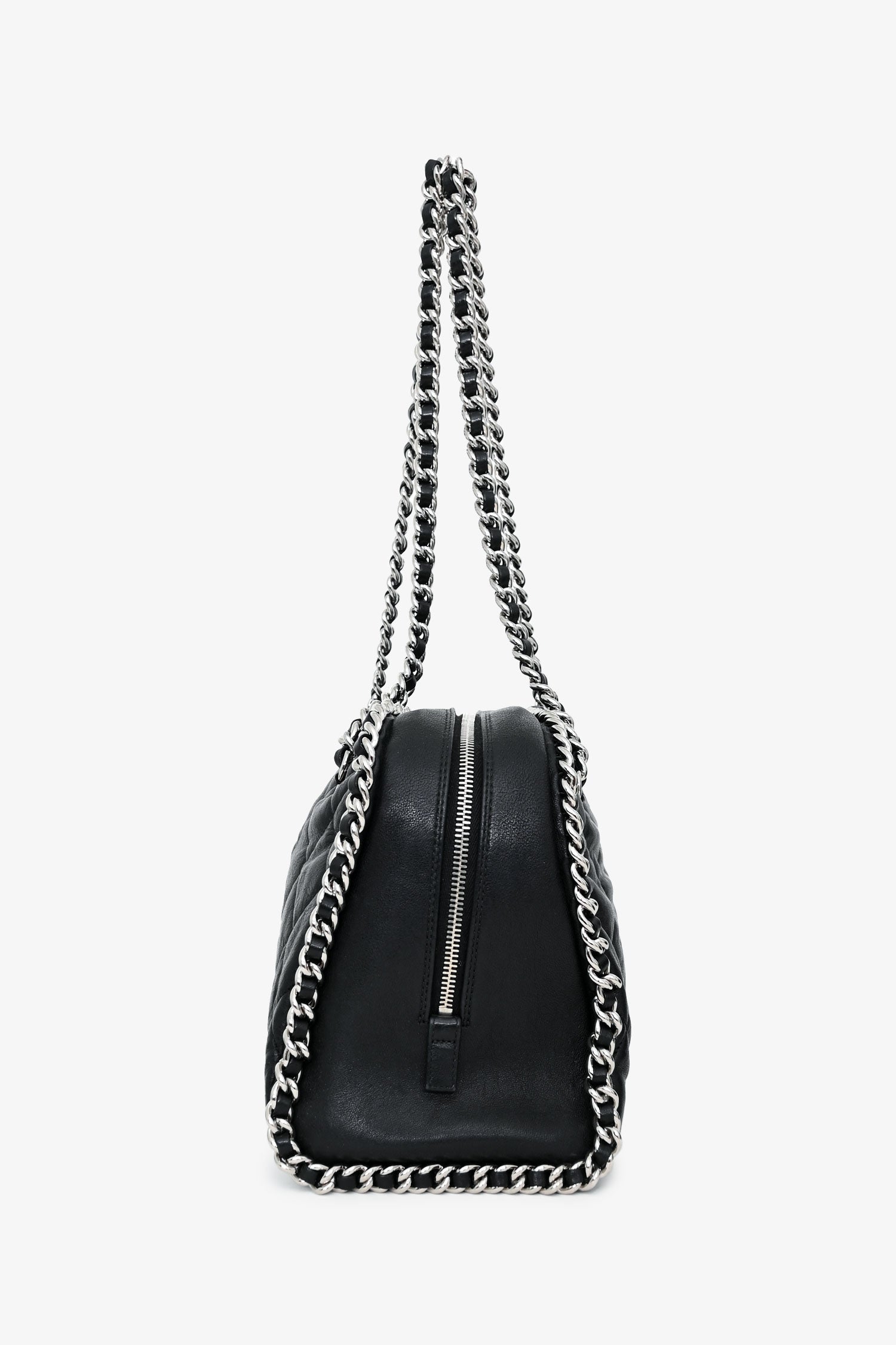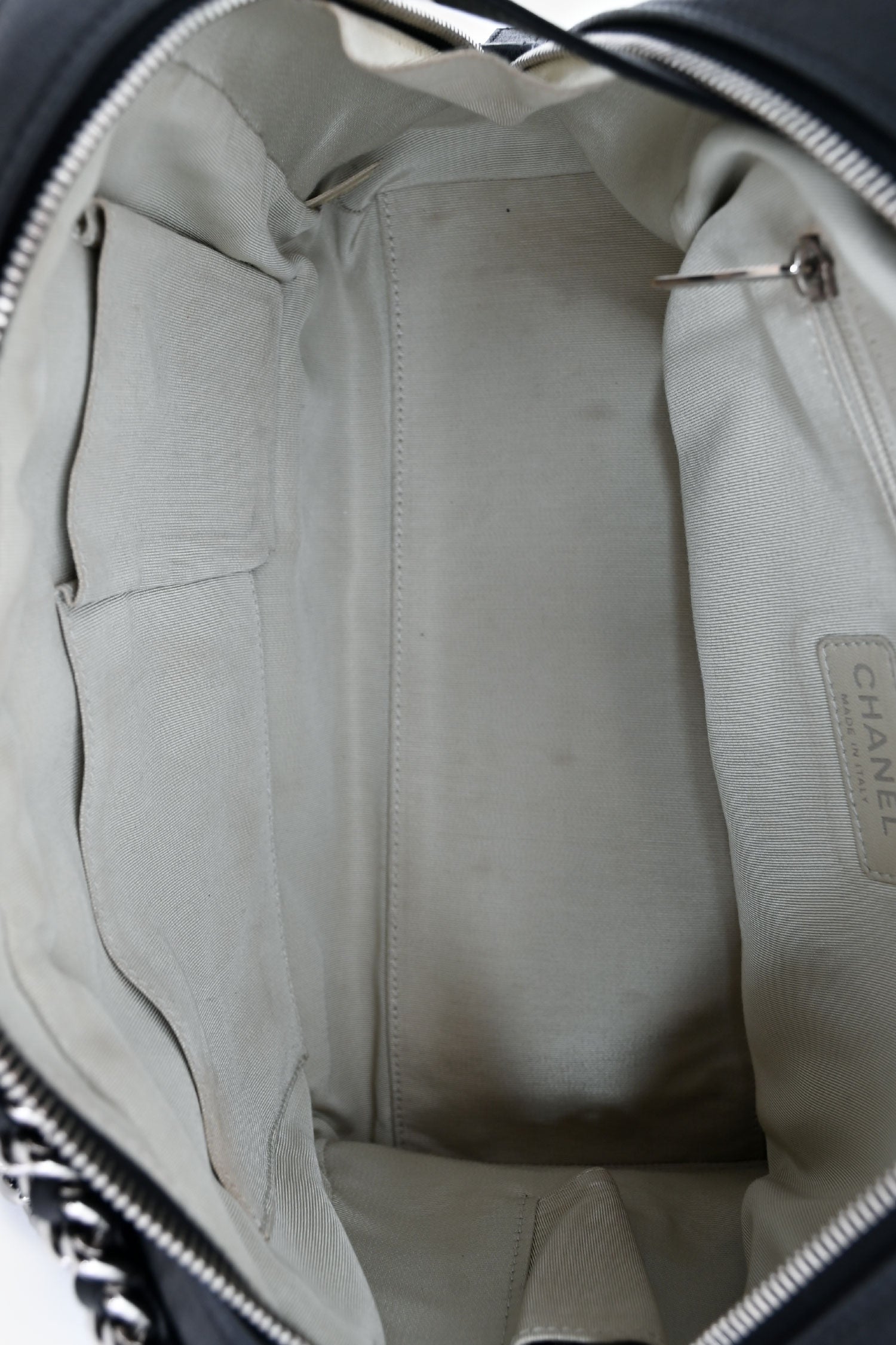 Refresh availabilityPre-Loved Chanel™ 2011/2012 Black Lambskin Chain Around Bowler Bag. Dual chain handles with leather trims. Top zip closure. Protective base studs. Lined interior. 3 interior pockets; 2 slip and 1 with zip closure. Silver-tone hardware. Tonal stitching.