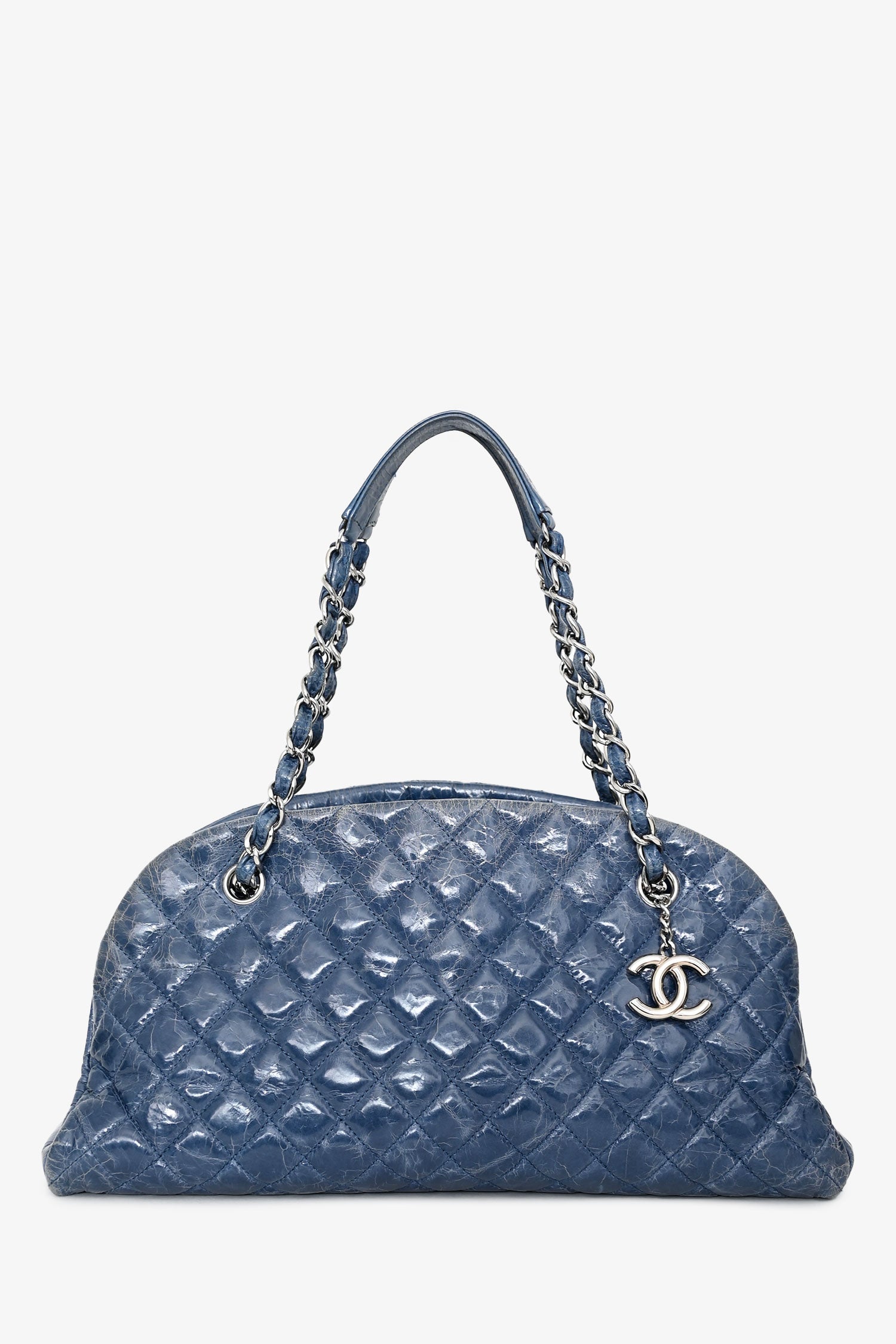 Refresh availabilityPre-Loved Chanel™ 2011/2012 Navy Blue Medium "Just Mademoiselle" Bowling Bag. Open top. Dual chain and leather handles with shoulder rests. Exterior bag charm. 1 interior compartment with clasp closure; 1 interior zip pocket; 1 interior slip pocket. Fabric lining. Silver-tone hardware. Tonal stitching.