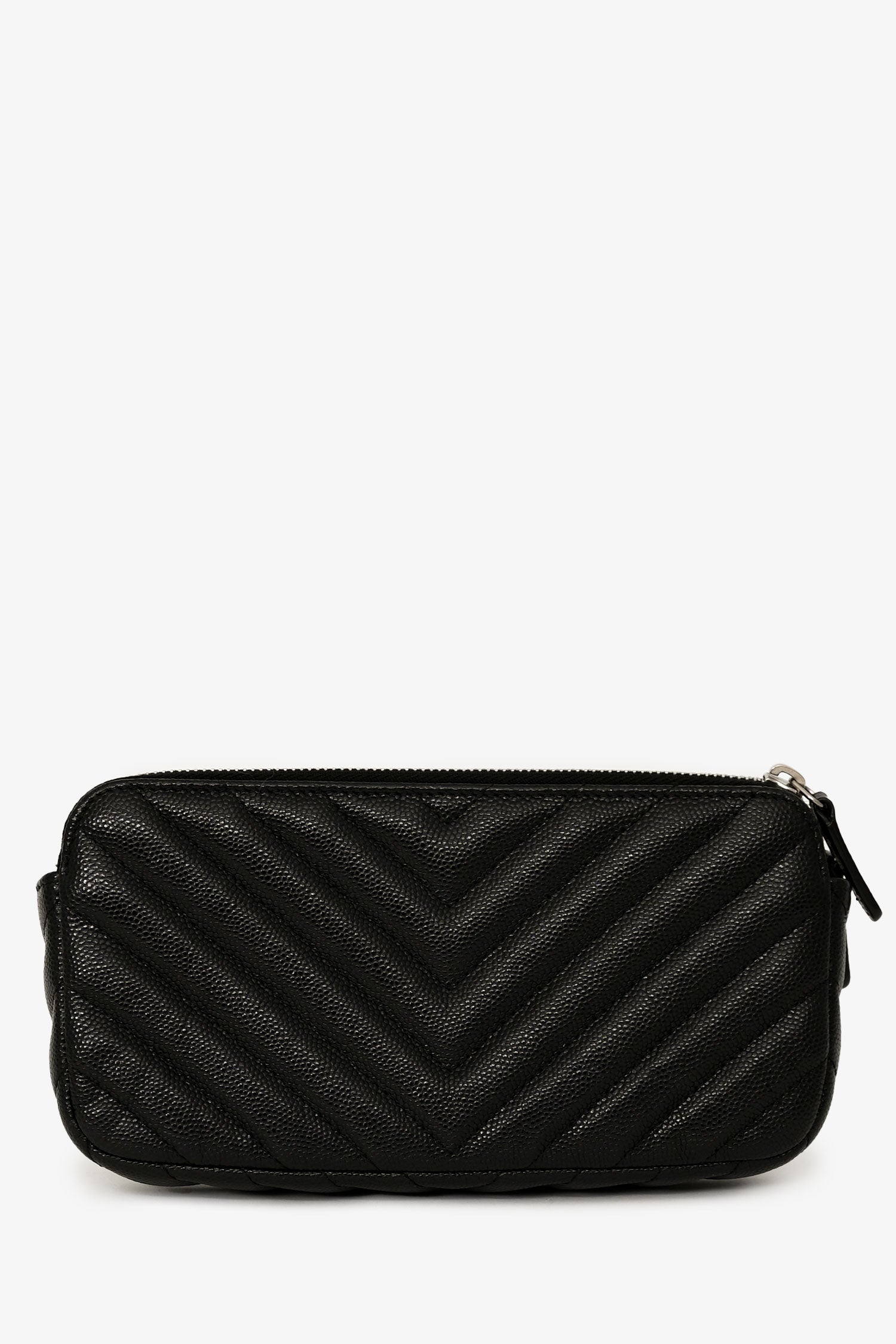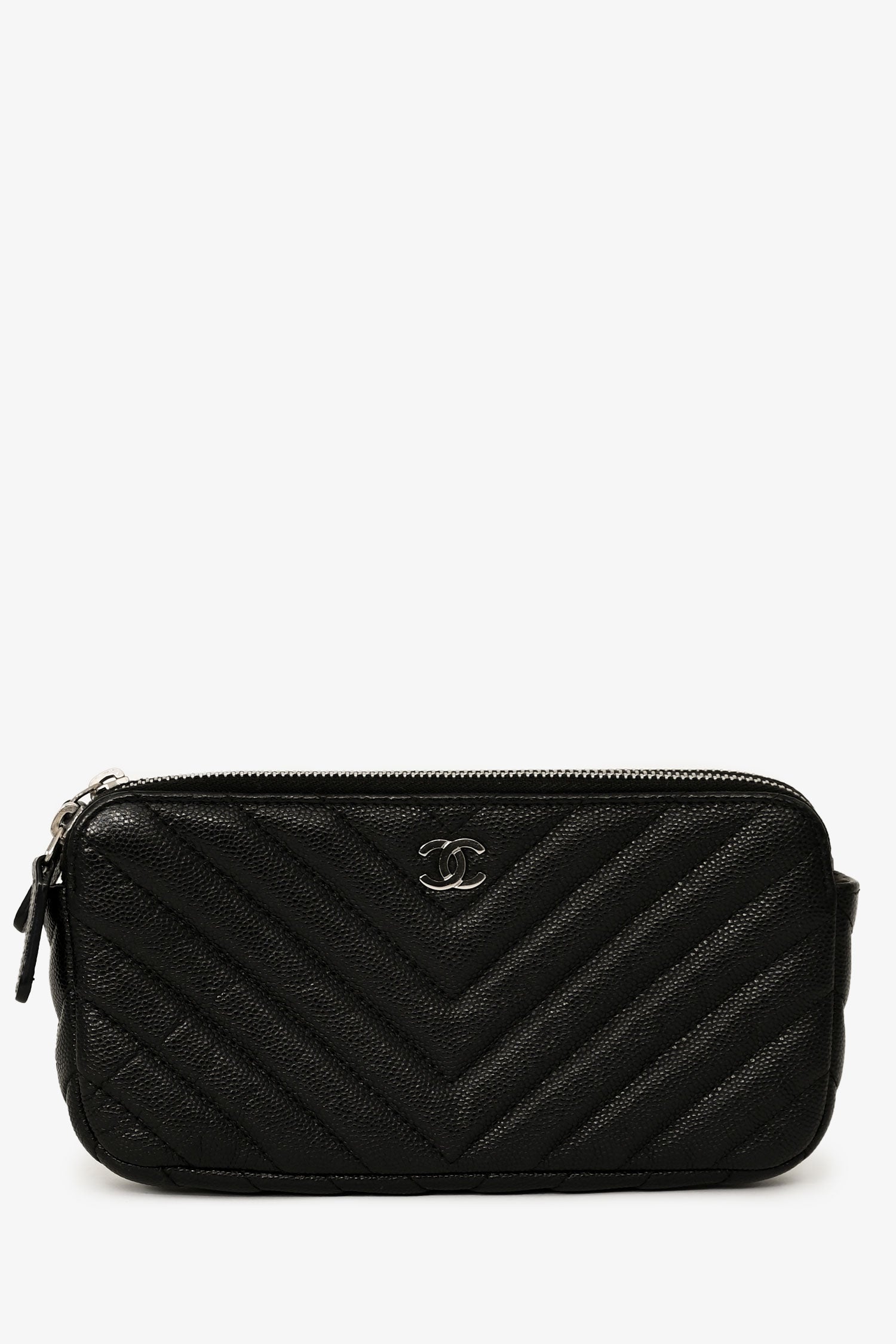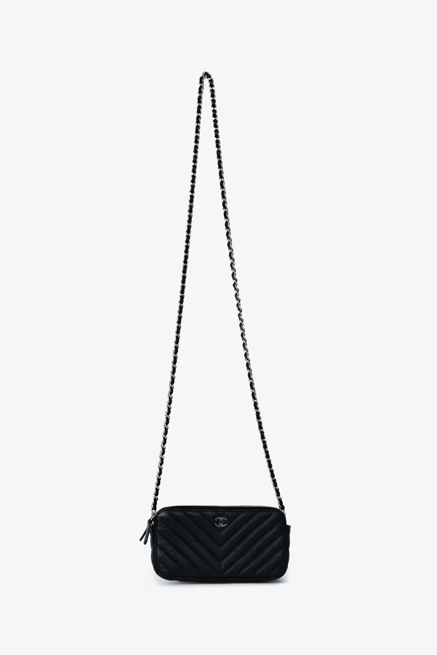 Refresh availabilityPre-Loved Chanel™ 2017/18 Black Caviar Chevron Double Zip Wallet On Chain. Top double zip closures. Chain-link crossbody strap. 3 interior compartments with 6 card slots. Silver-tone hardware. Tonal stitching.