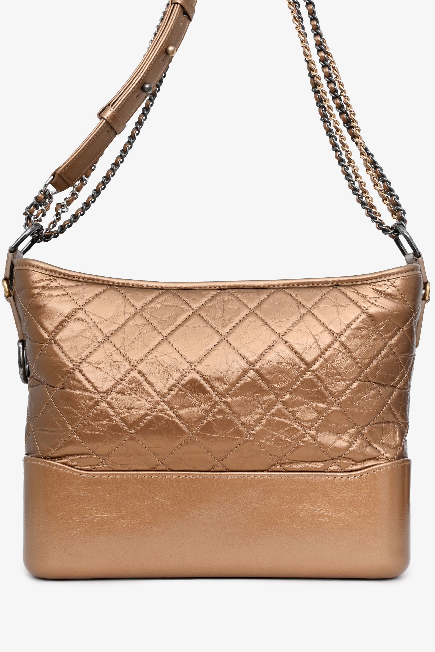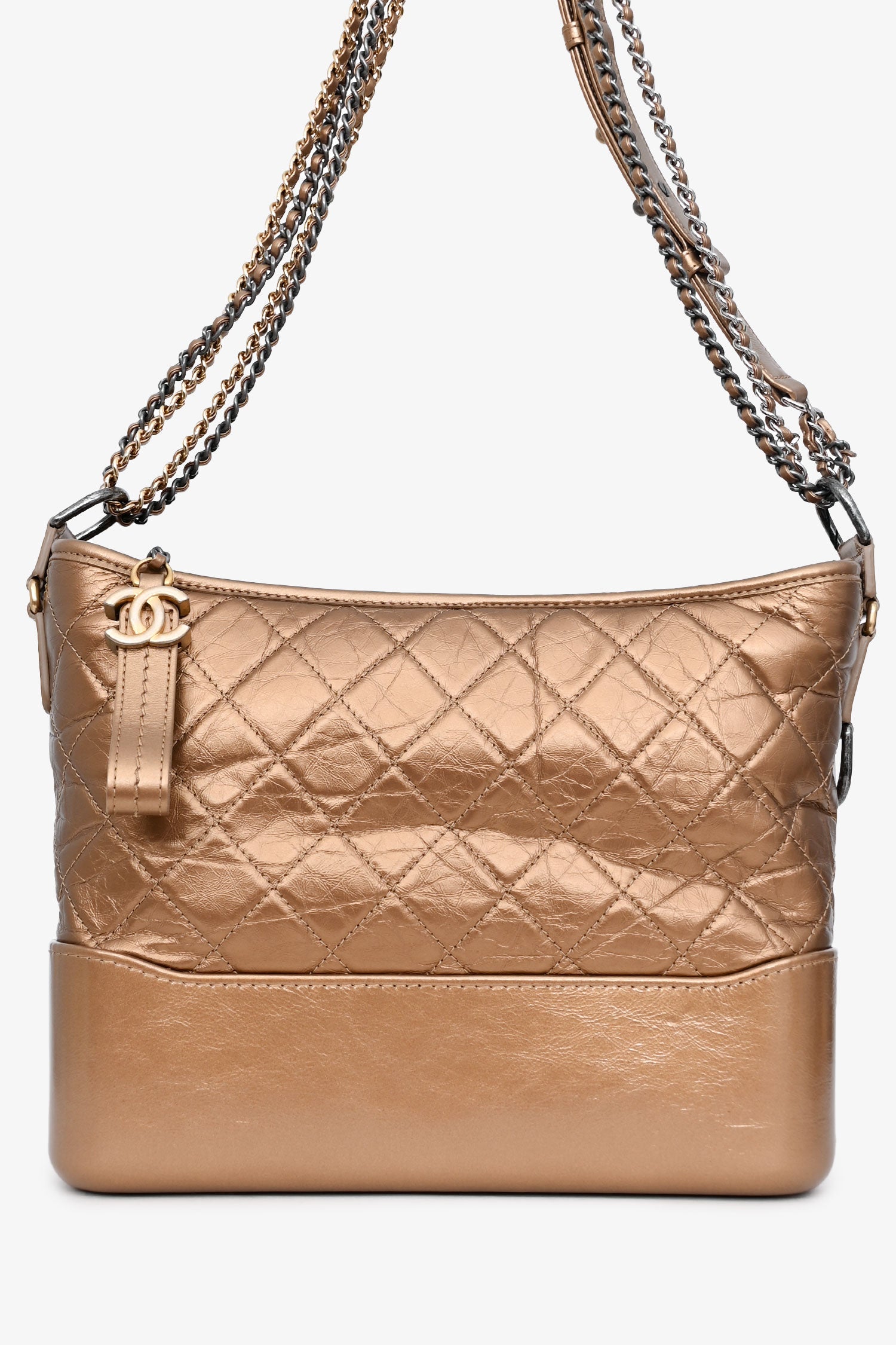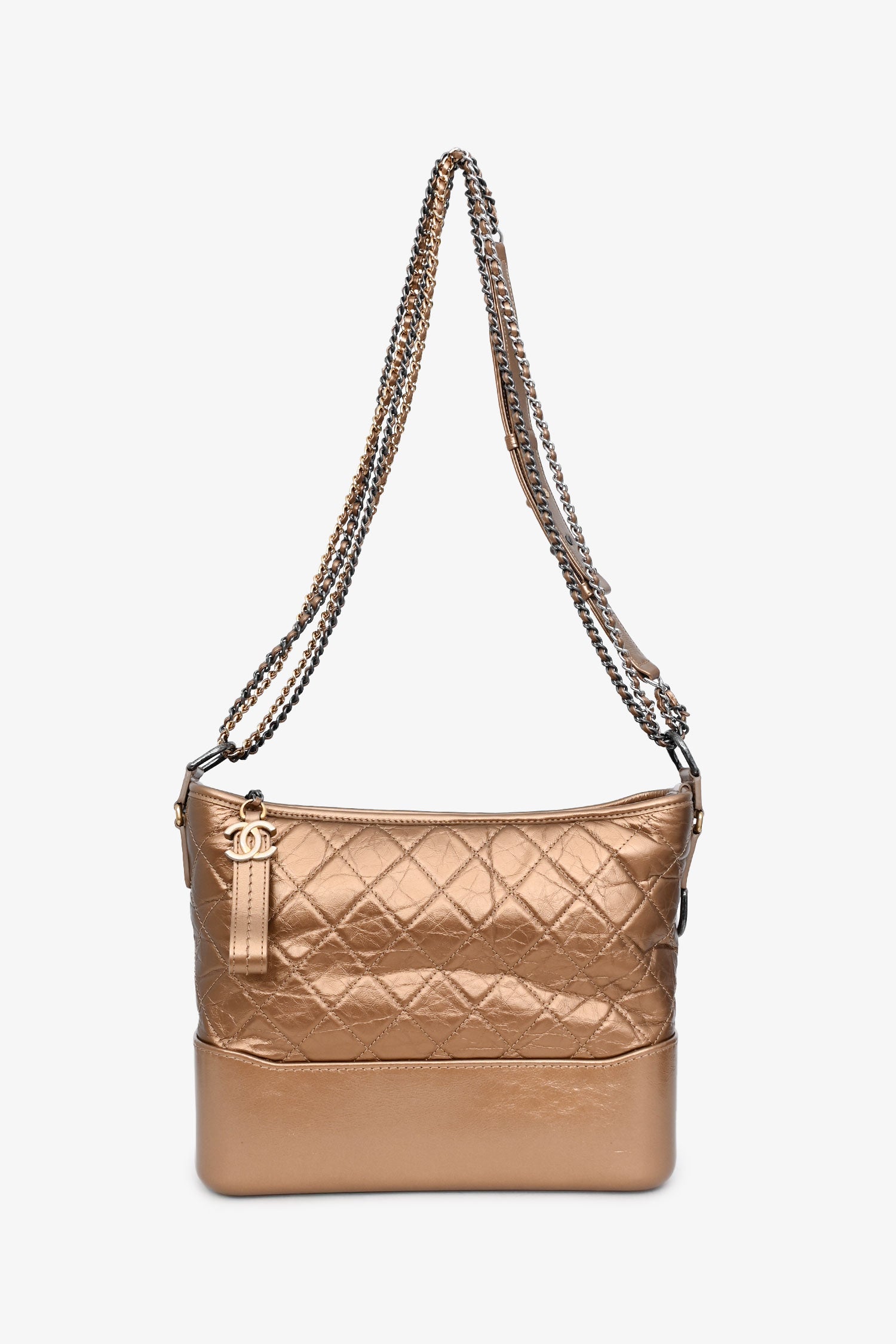 Refresh availabilityPre-Loved Chanel™ 2017-18 Gold Medium Gabrielle Hobo. Top zipper closure with chain and logo detailing. Chain strap with adjustable leather strap detail. Lined interior. Interior pocket with zipper closure and two interior slip pockets. Interior leather key tether. Gold and silver-tone hardware. Tonal stitching.