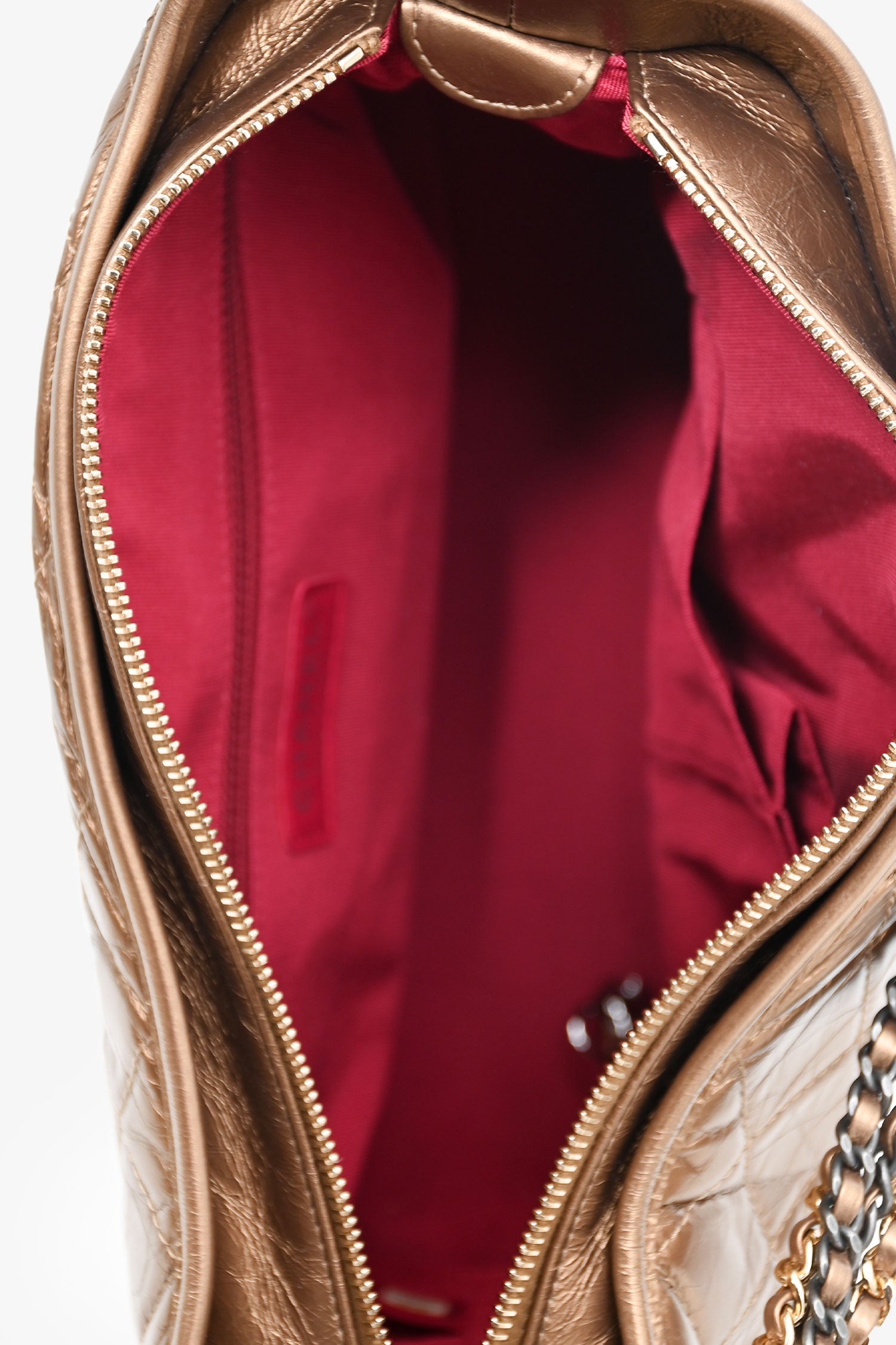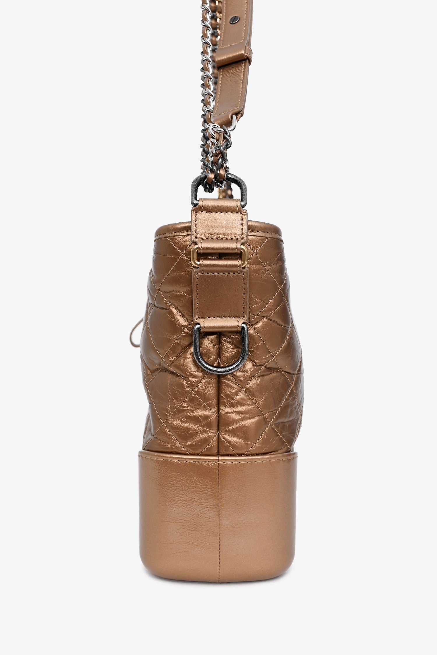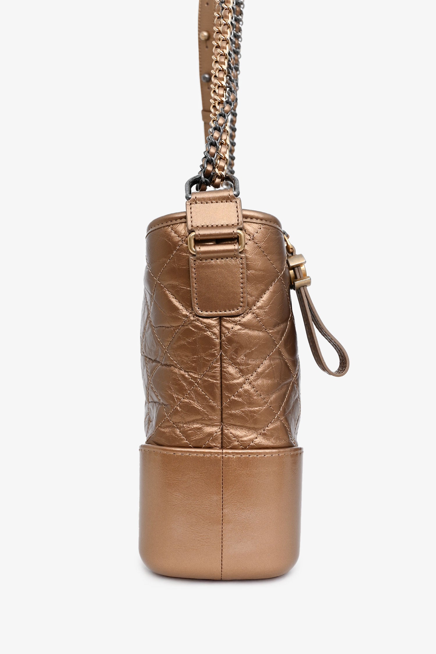 Refresh availabilityPre-Loved Chanel™ 2017-18 Gold Medium Gabrielle Hobo. Top zipper closure with chain and logo detailing. Chain strap with adjustable leather strap detail. Lined interior. Interior pocket with zipper closure and two interior slip pockets. Interior leather key tether. Gold and silver-tone hardware. Tonal stitching.