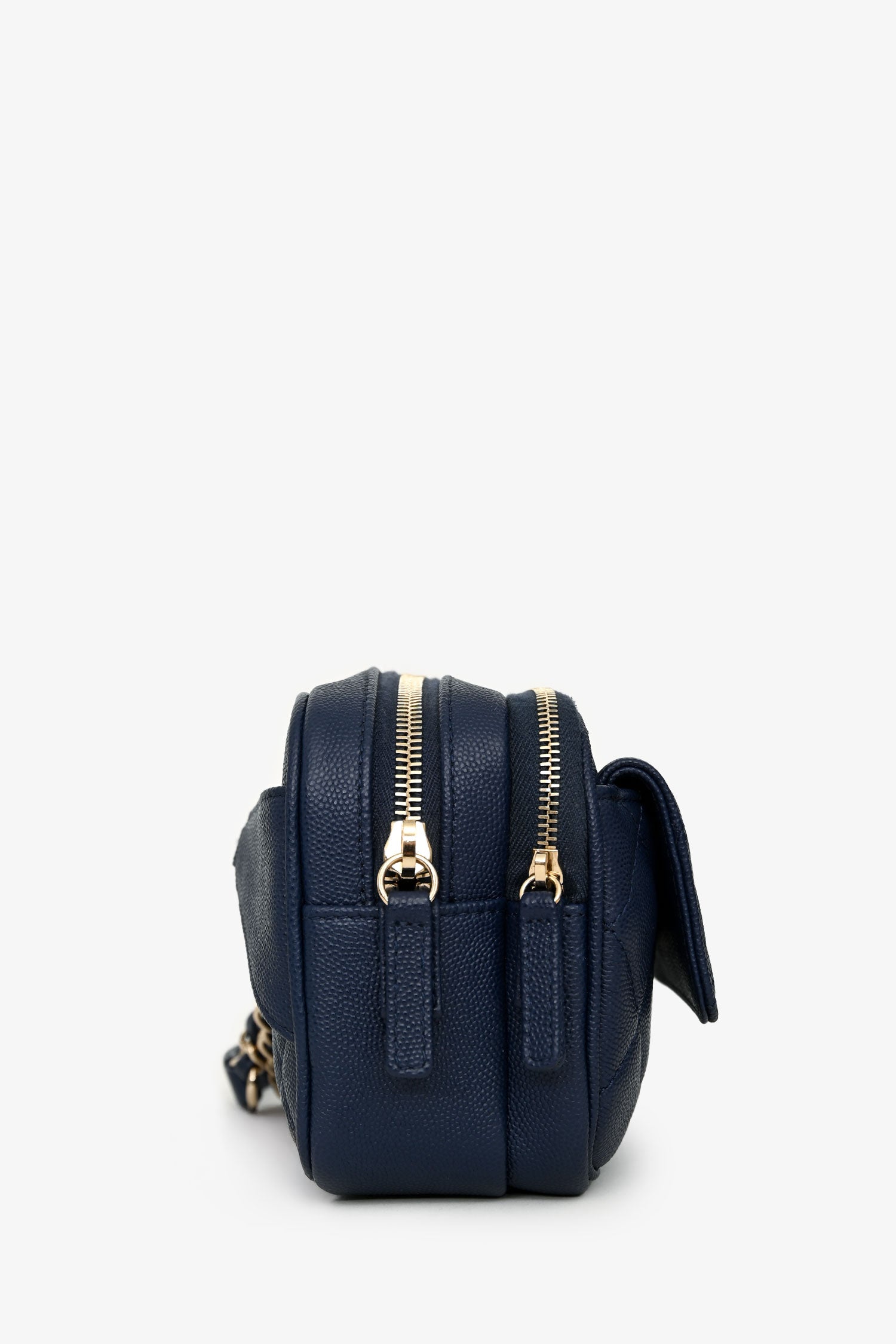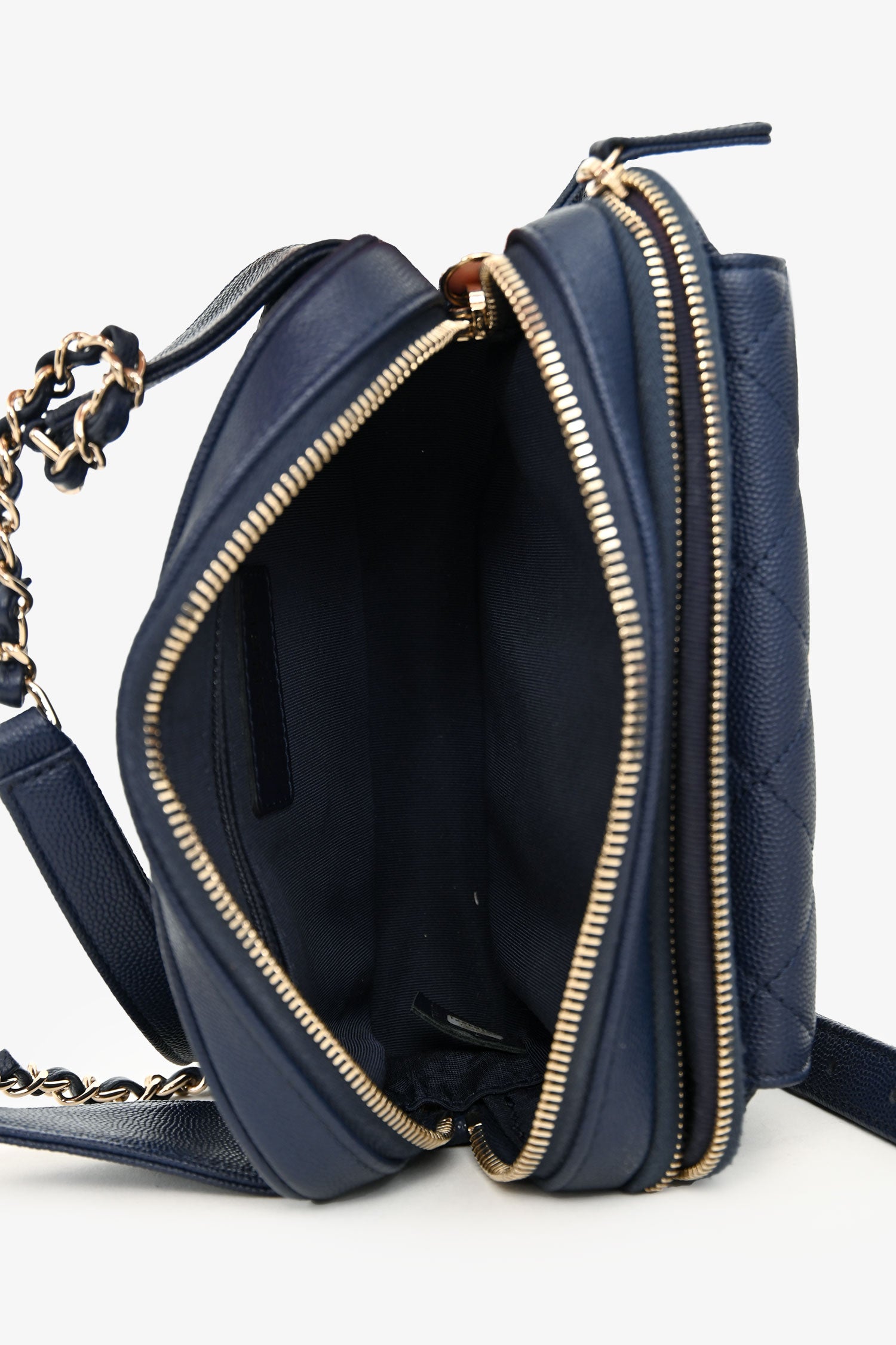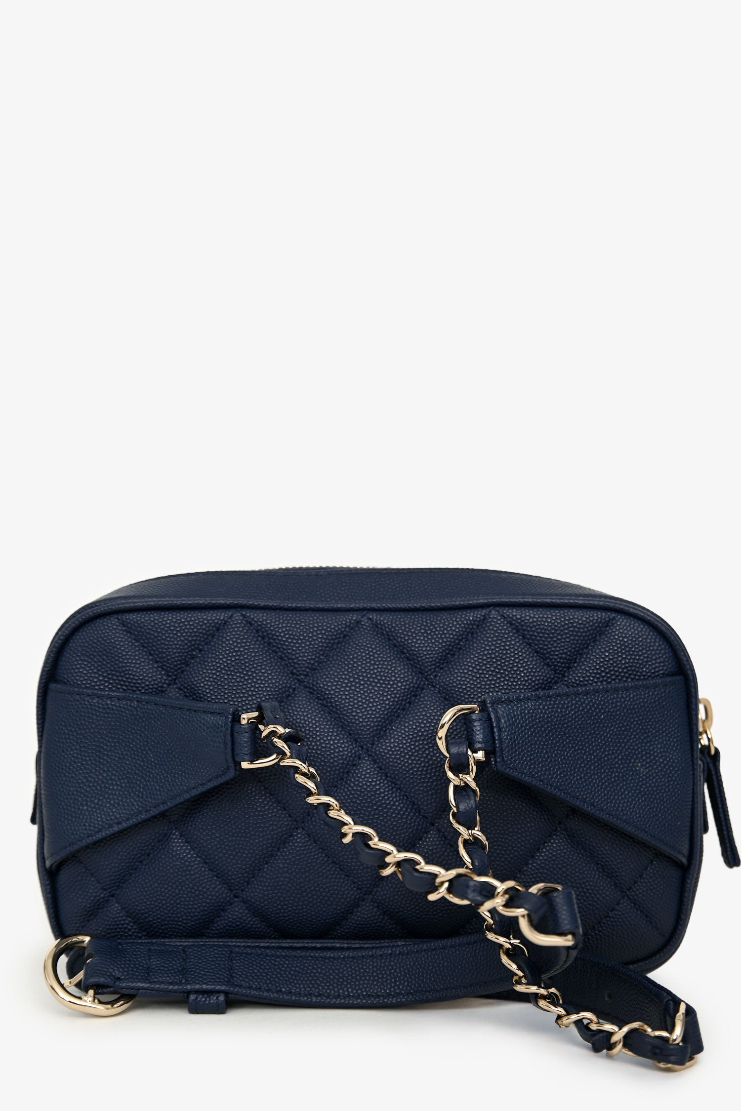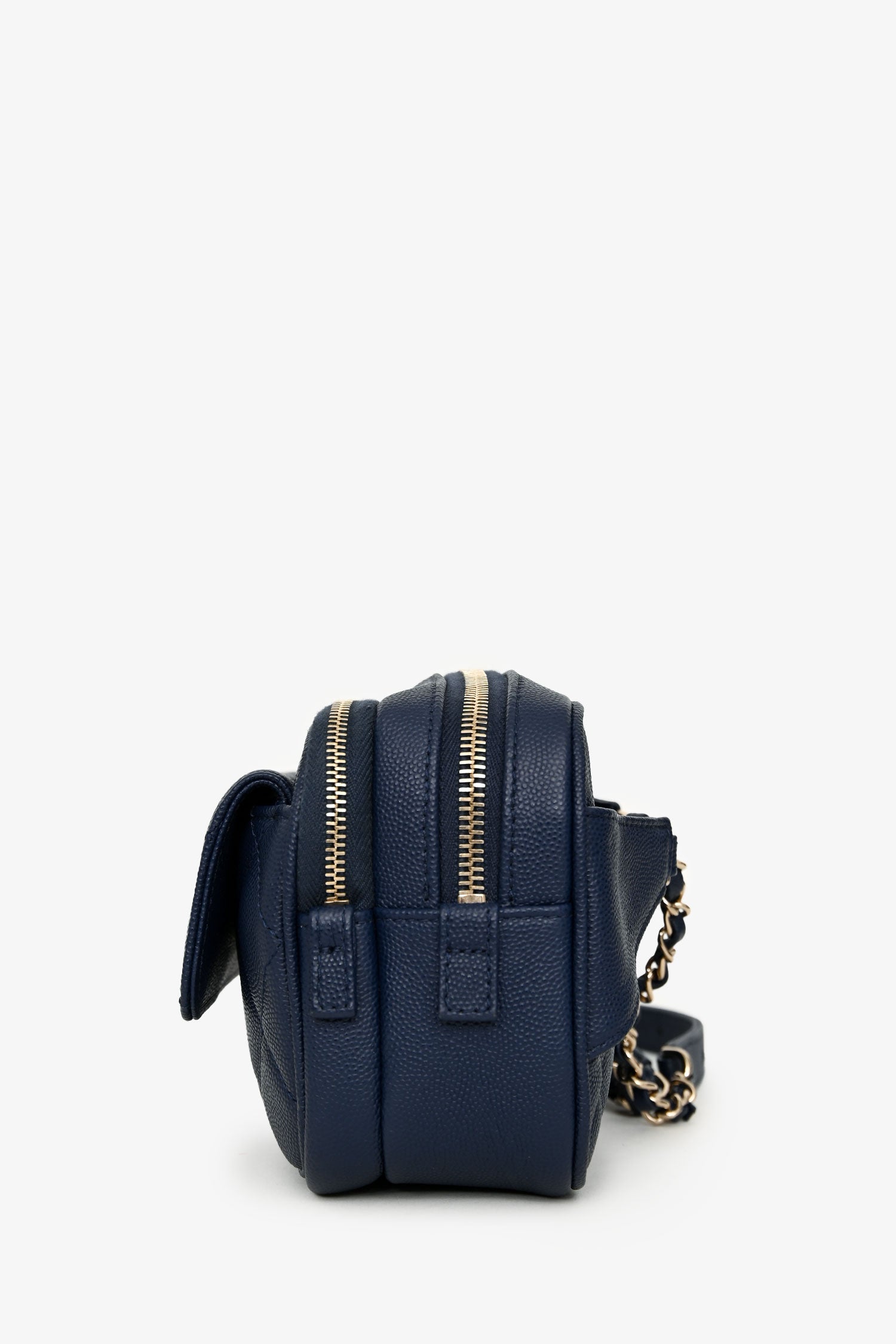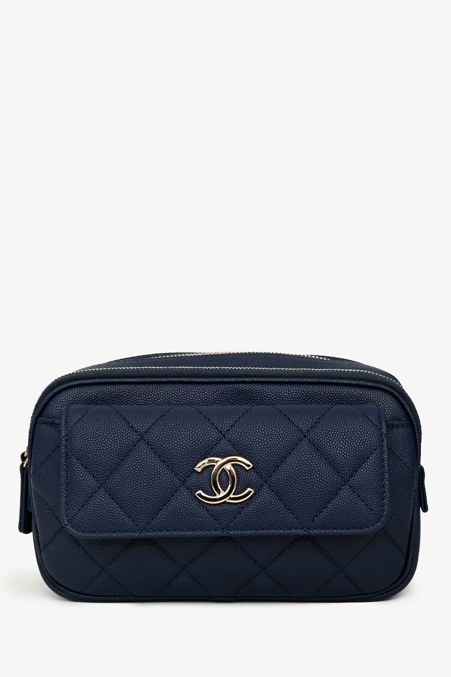 Refresh availabilityPre-Loved Chanel™ 2019-20 Navy Caviar Leather Casual Trip Belt Bag with Insert. Top zip closure. Adjustable chain link strap with buckle closure. Single slip pocket in the front. 2 interior compartments with zip closure. Single wall slip pocket with a zip. Includes removable insert. Gold-tone hardware. Tonal stitching.