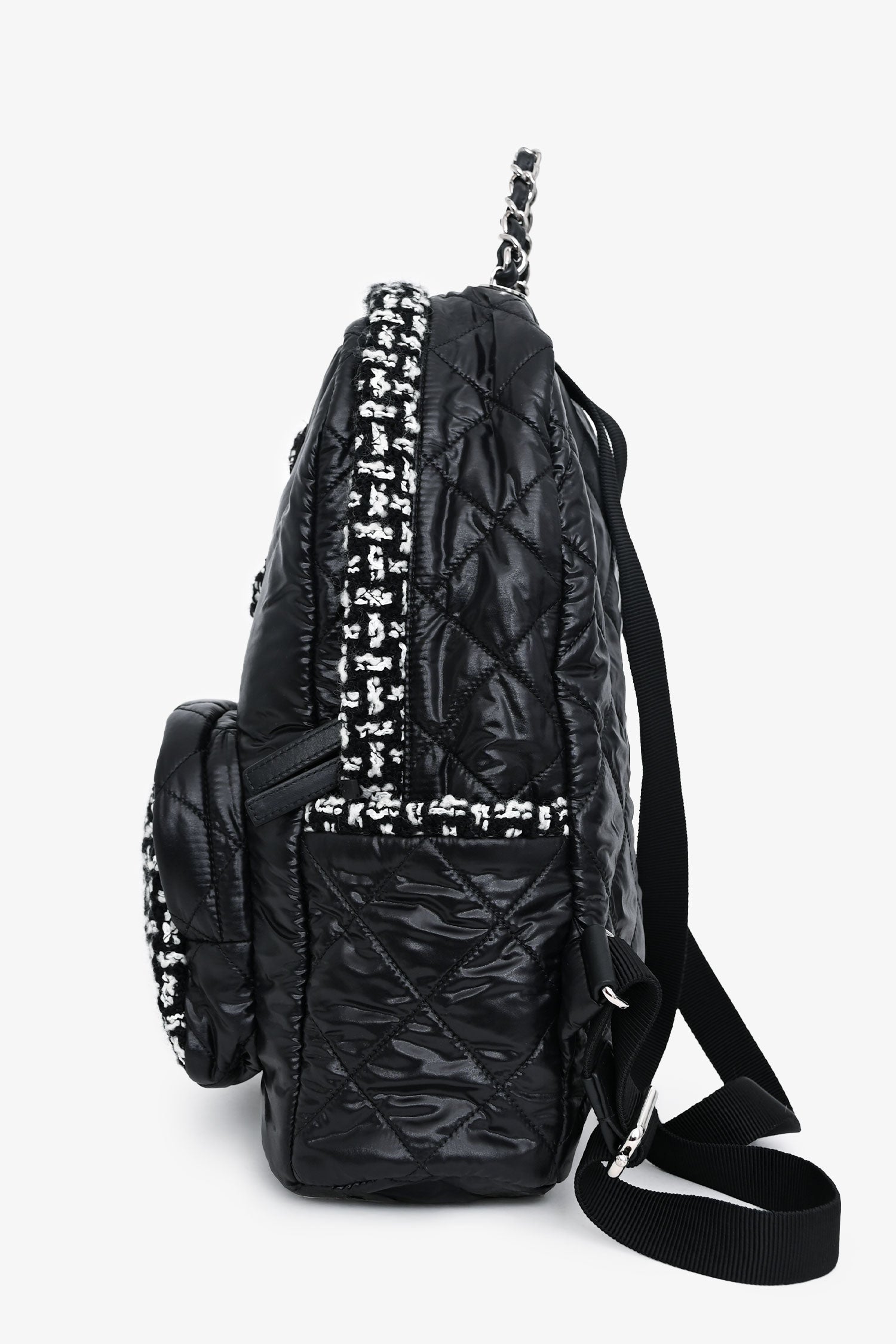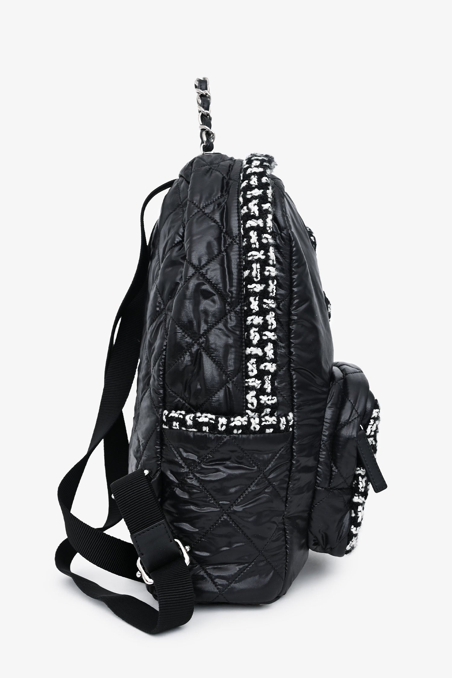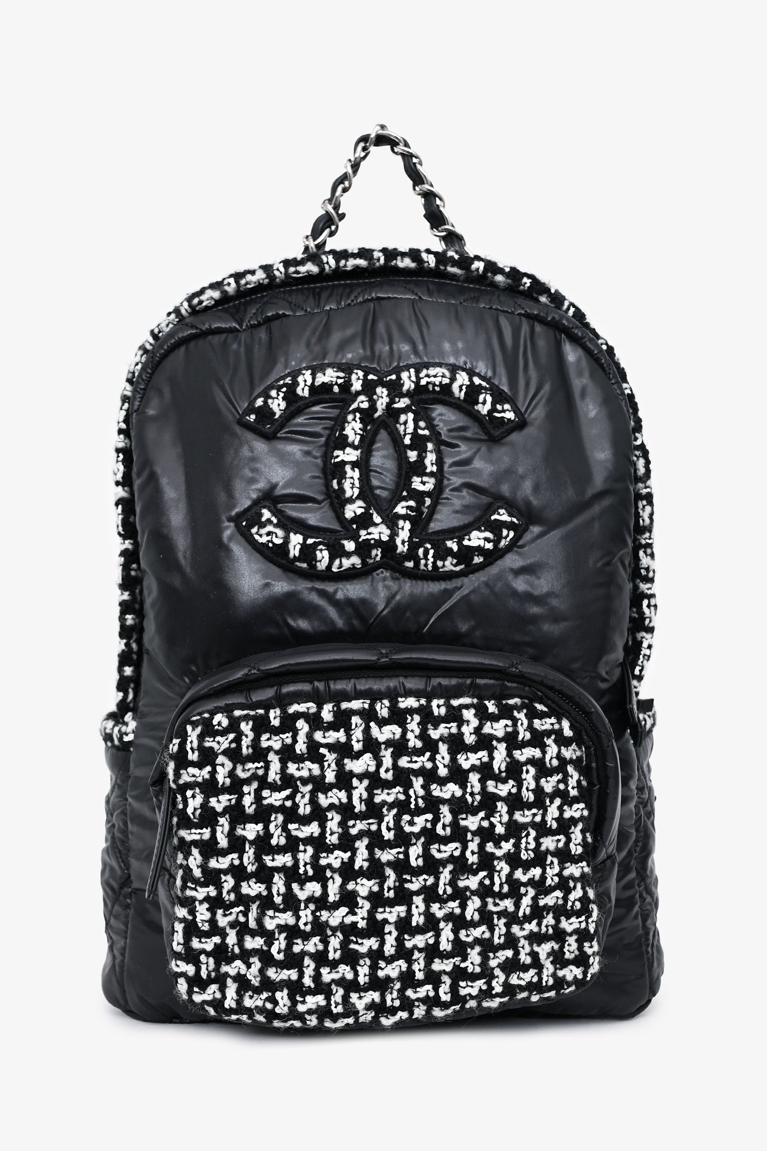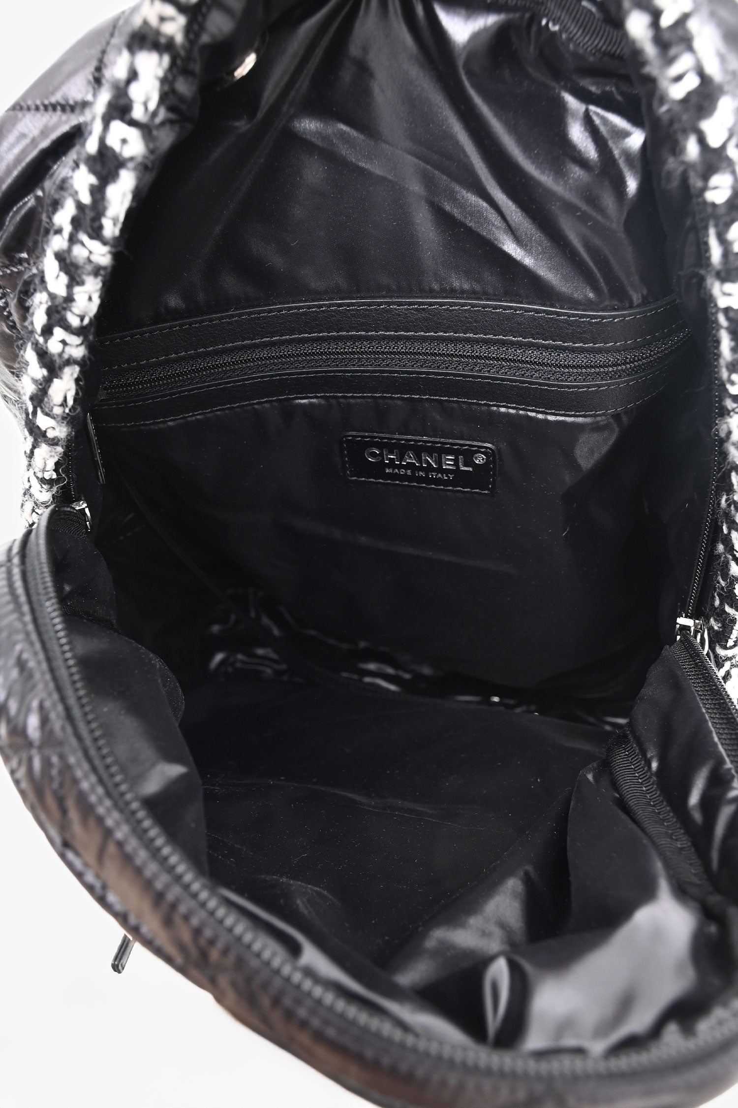 Refresh availabilityPre-Loved Chanel™ 2020 Black Nylon/Tweed Backpack. Backpack zipper closure. Front pocket with zipper closure. Two side slip pockets. Signature Pre-Loved Chanel™ chain handle drop. Two over-the-shoulder backpack straps. Interior logo detailing. Interior pocket with zipper closure. Interior security strap with a lobster clasp. Silver-tone hardware. Tonal stitching.