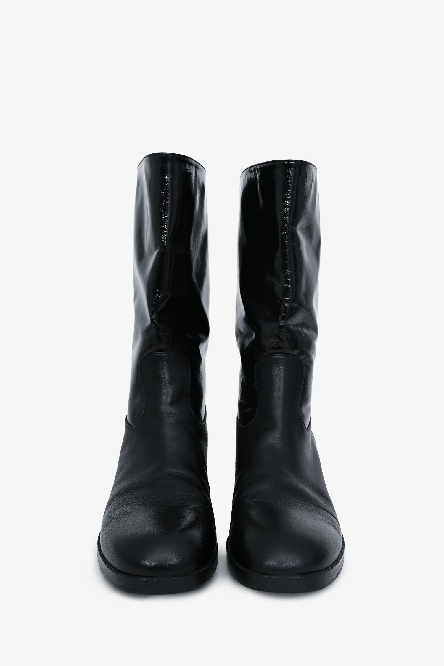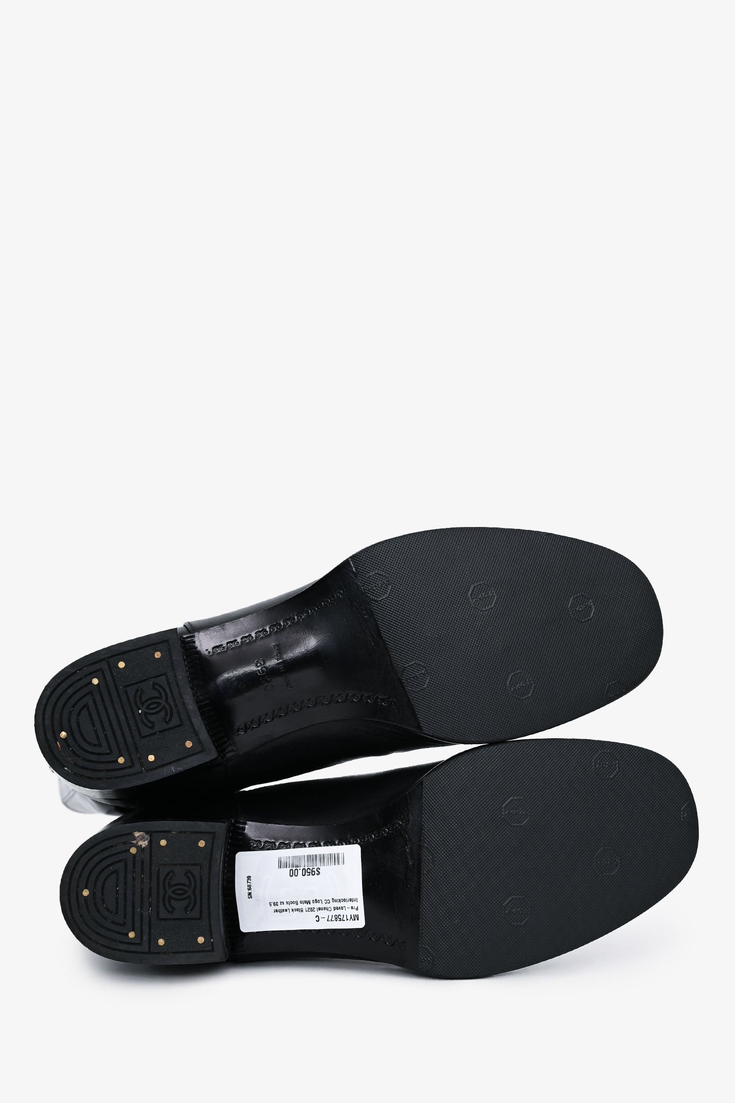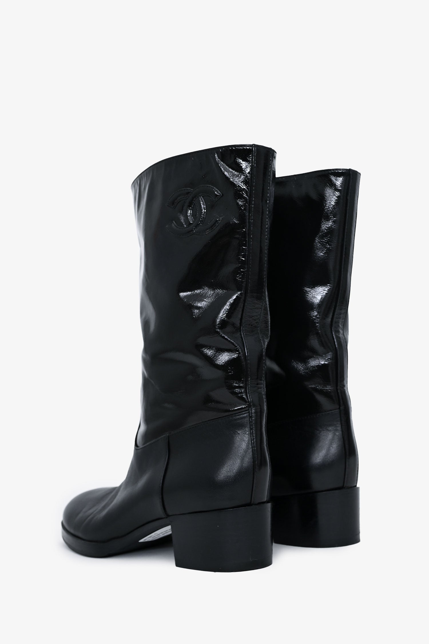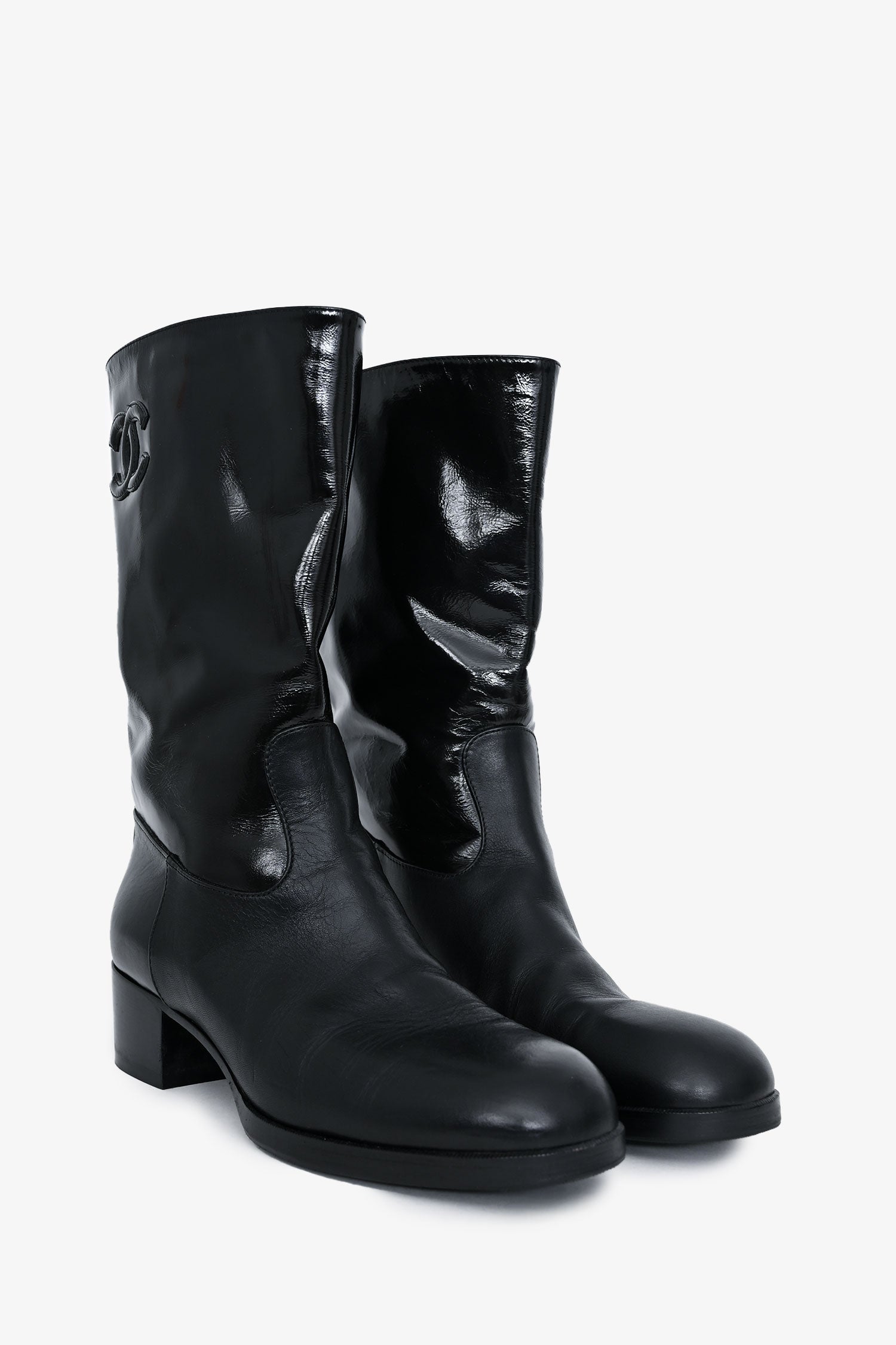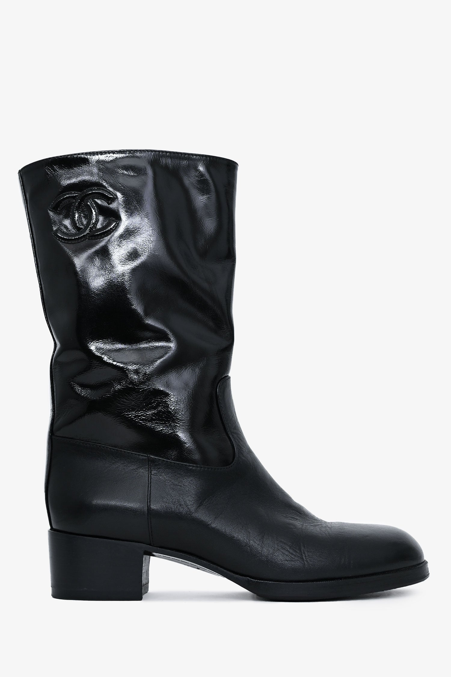Refresh availabilityPre-Loved Chanel 2021 Black Leather Interlocking CC Logo Moto Boots. Pull-on. Round toe. Logo at exterior shaft. Tonal stitching.