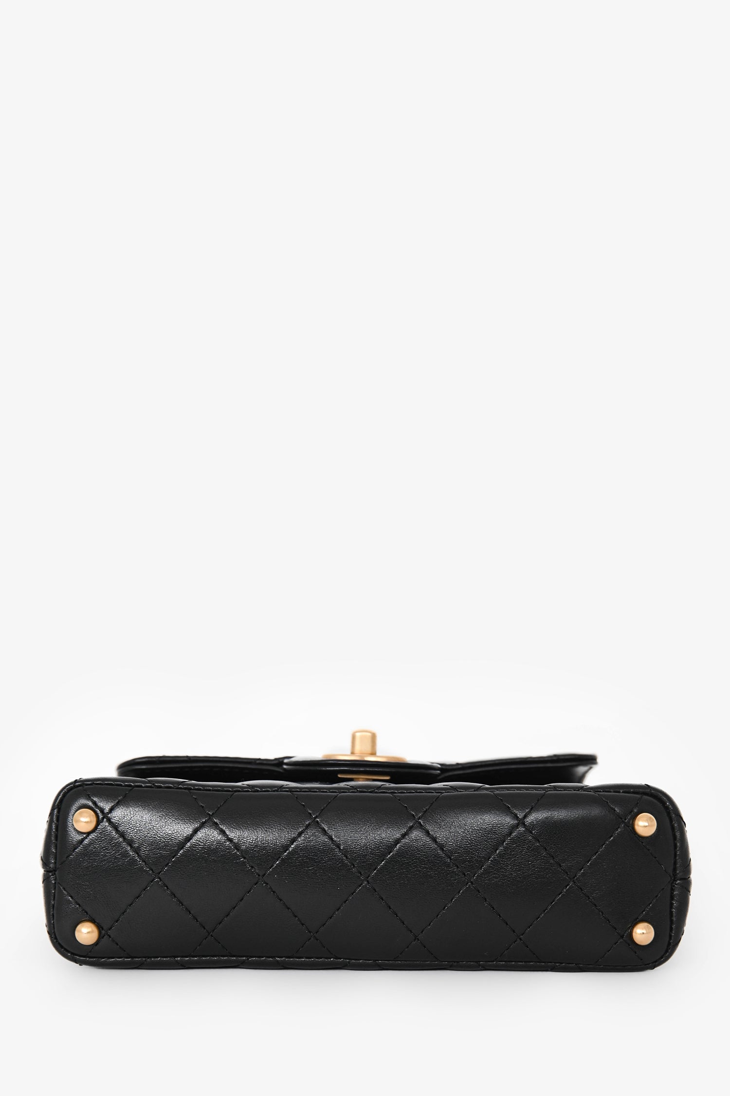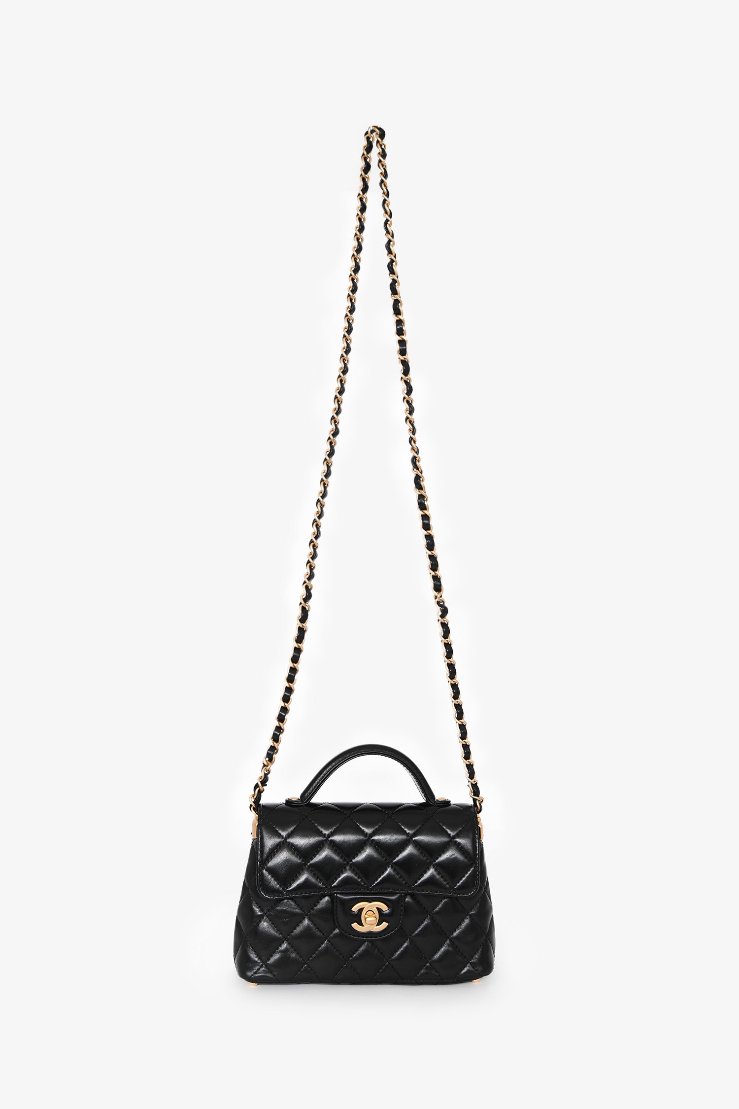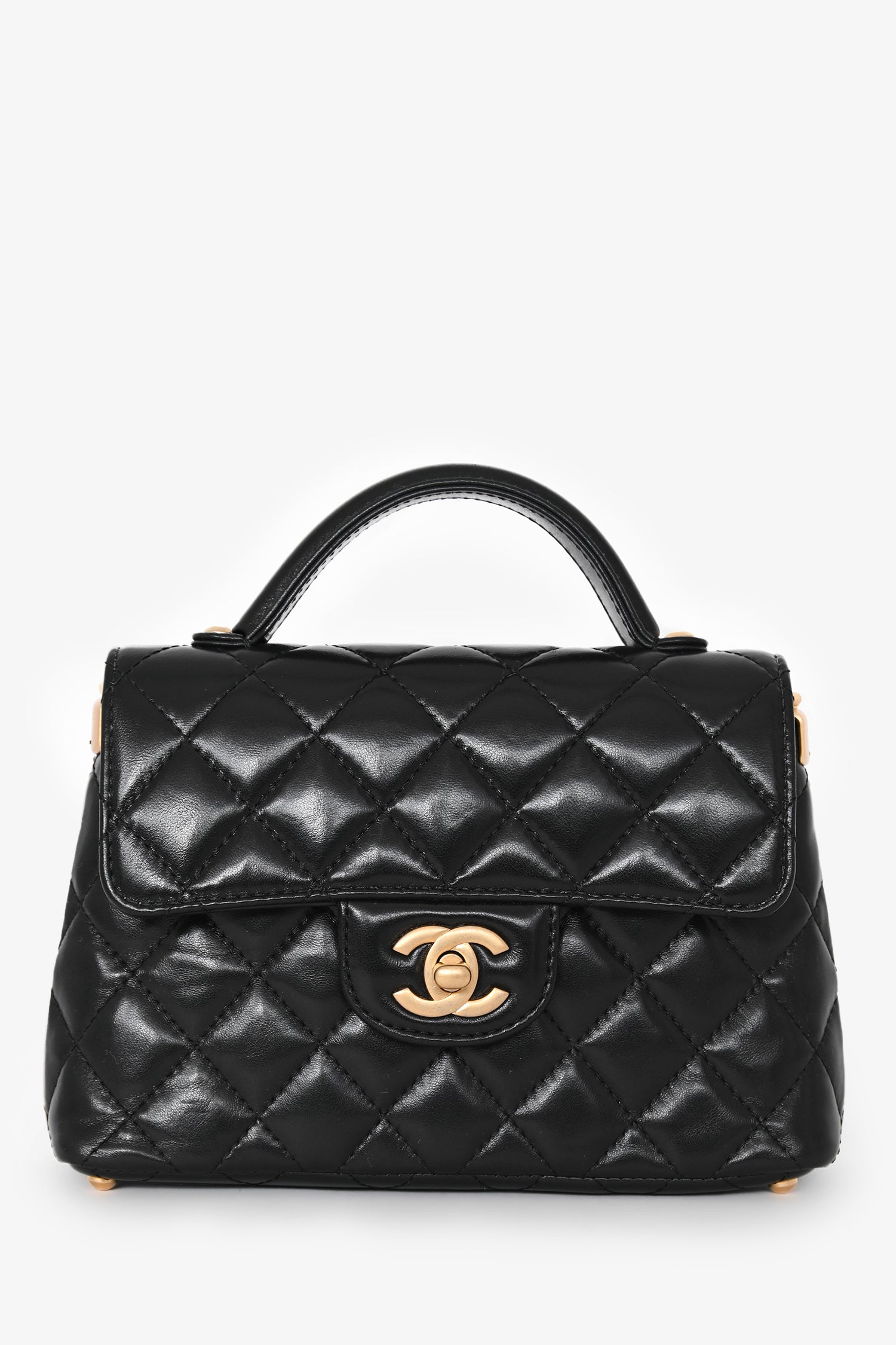 Refresh availabilityPre-Loved Chanel™ 2025 Black Lambskin Mini Top Handle Chain Bag. Front fold-over flap with turn-lock closure. Attached chain-strap. Protective base studs. Single interior wall slip pocket. Gold-tone hardware. Tonal stitching.