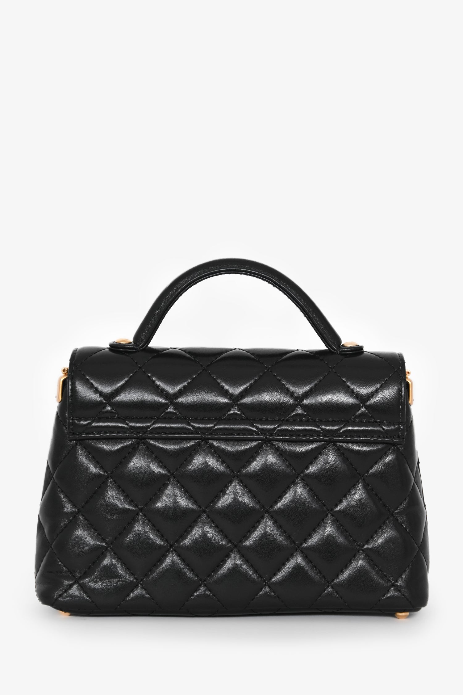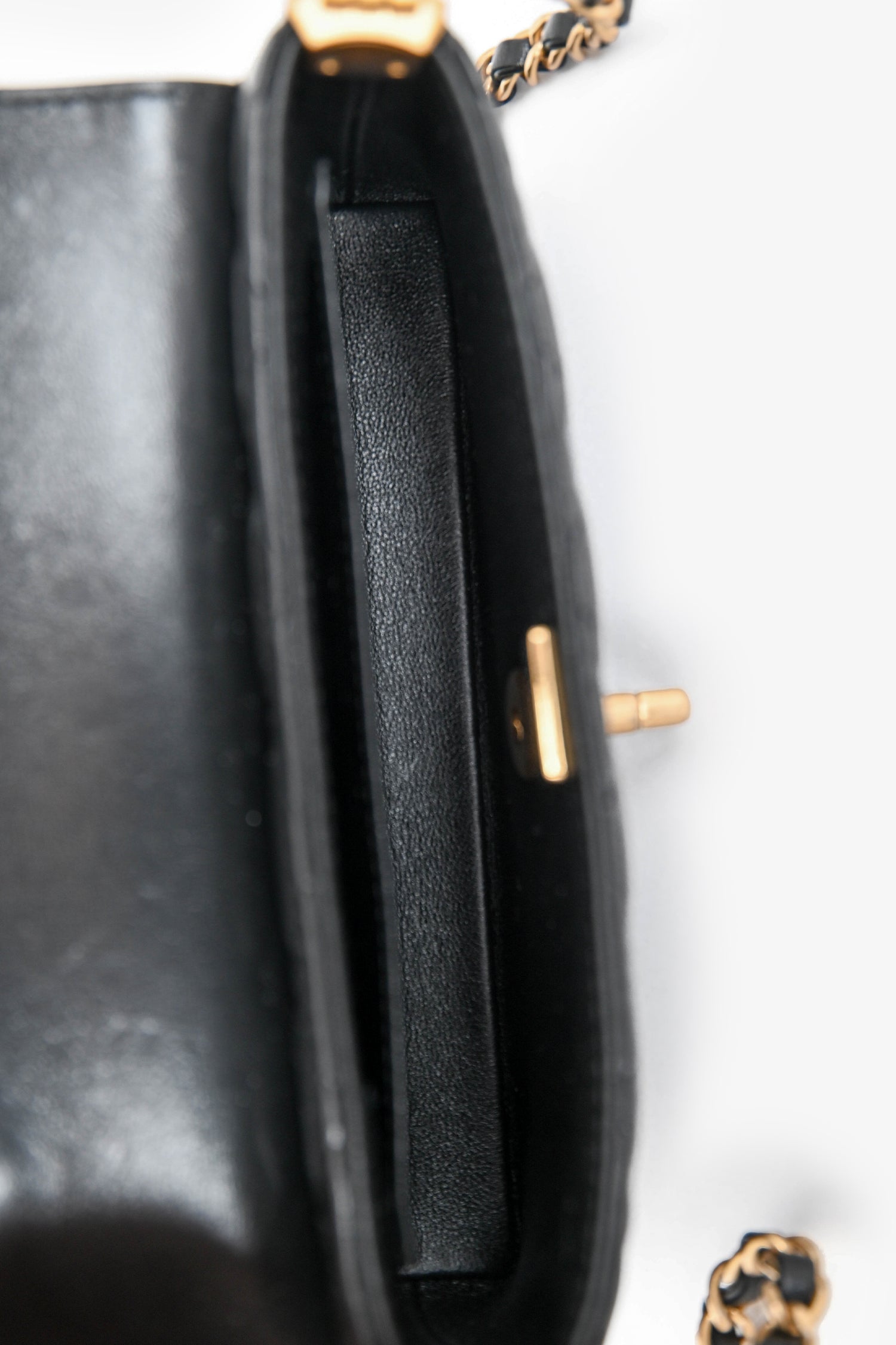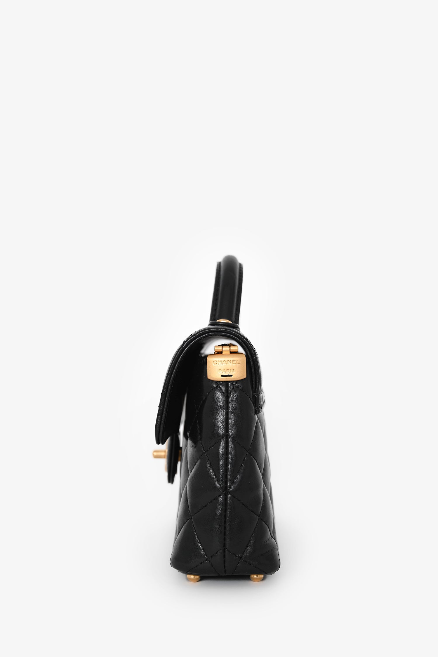 Refresh availabilityPre-Loved Chanel™ 2025 Black Lambskin Mini Top Handle Chain Bag. Front fold-over flap with turn-lock closure. Attached chain-strap. Protective base studs. Single interior wall slip pocket. Gold-tone hardware. Tonal stitching.