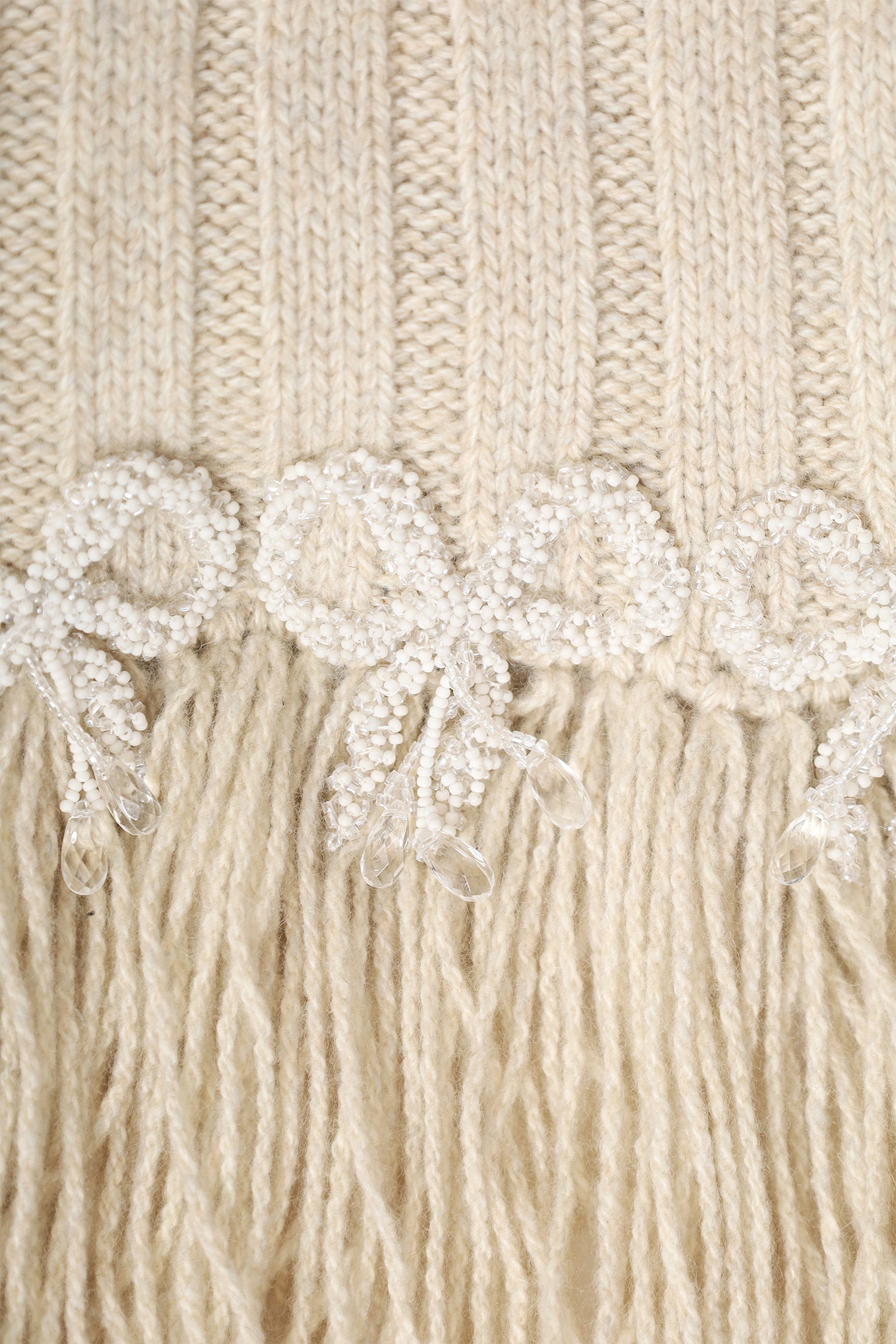 Refresh availabilityPre-Loved Chanel™ Beige Cashmere Beaded Scarf. Pull-on. Fringe detail. Tonal stitching. Gold and silver-tone hardware.