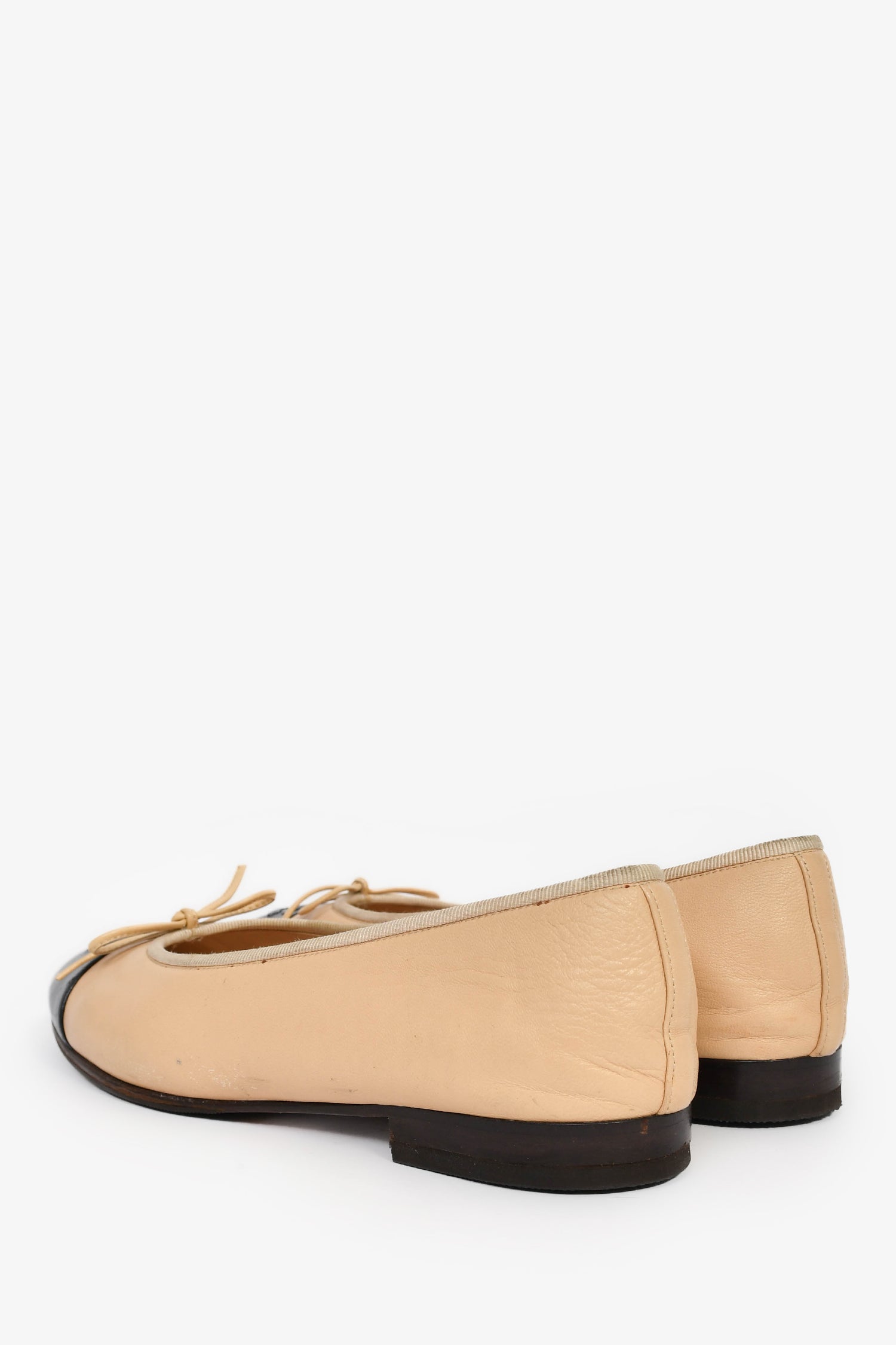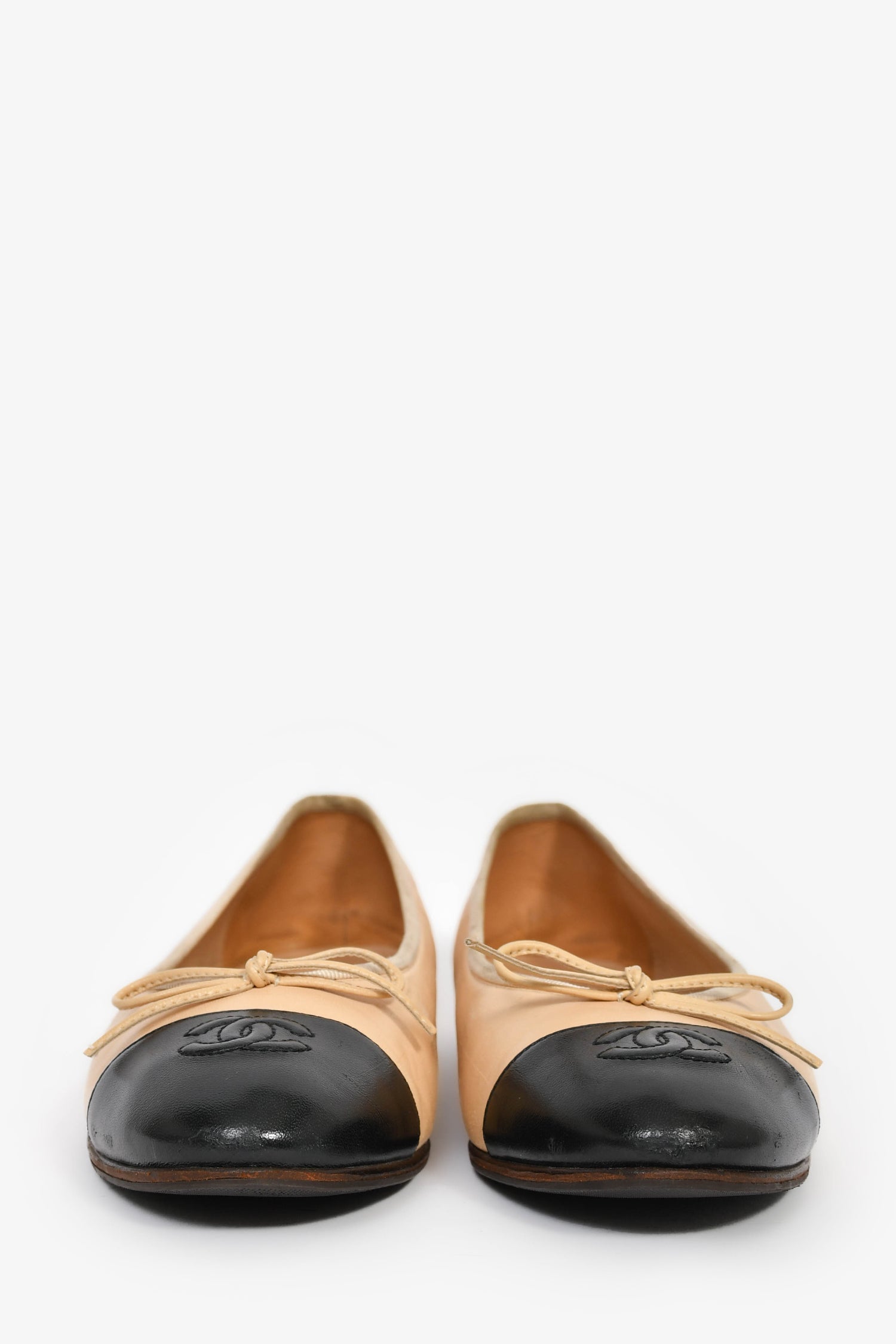 Refresh availabilityPre-Loved Chanel™ Beige/Black Leather Cap Toe CC Ballet Flats. Slip-on. Bow detail at the upper. Tonal stitching.