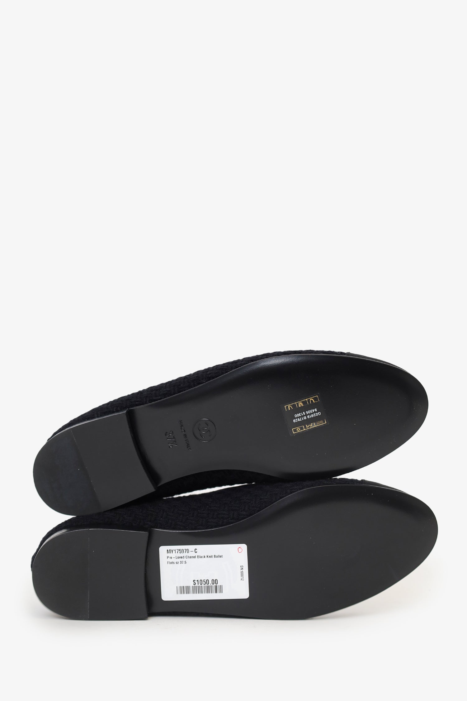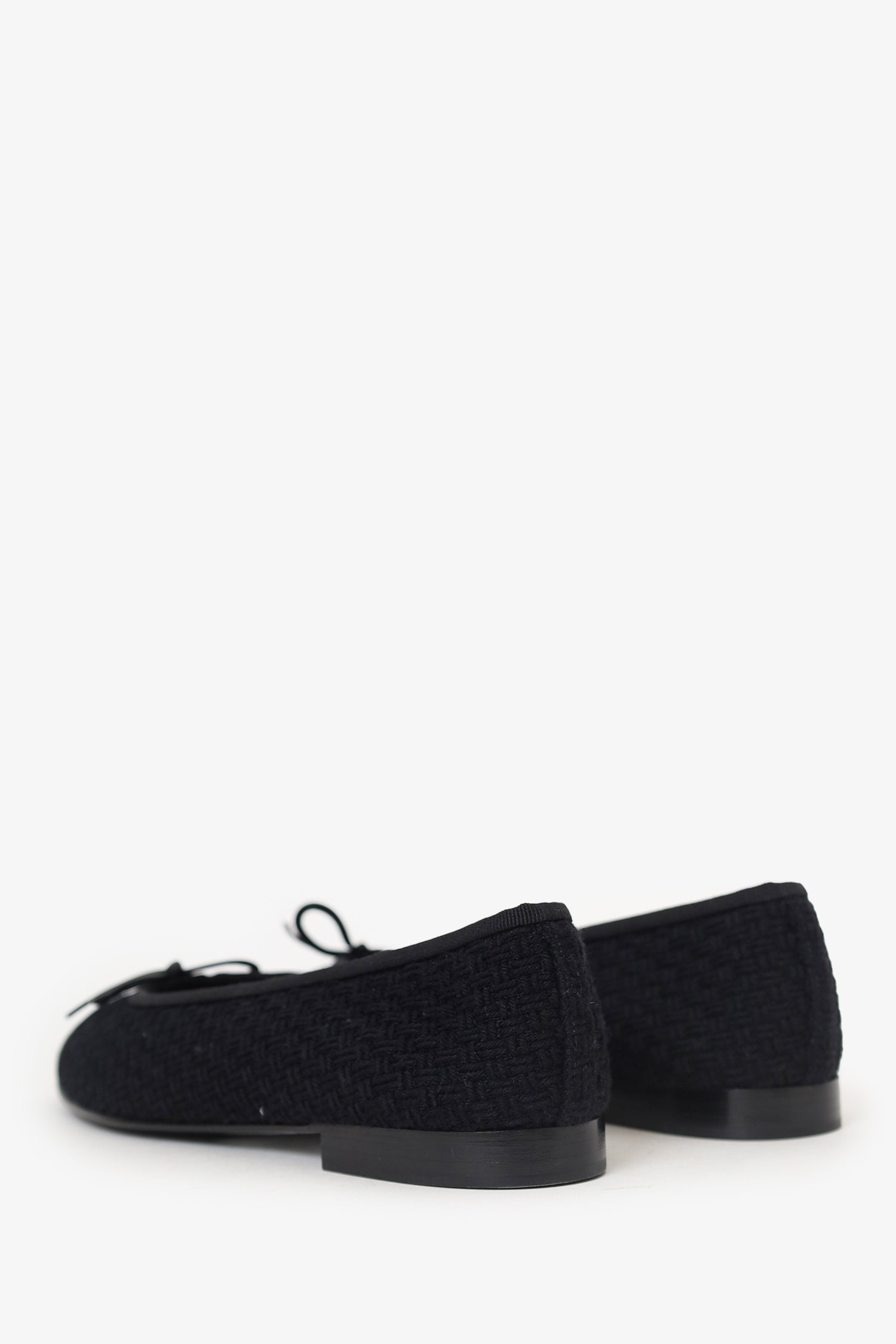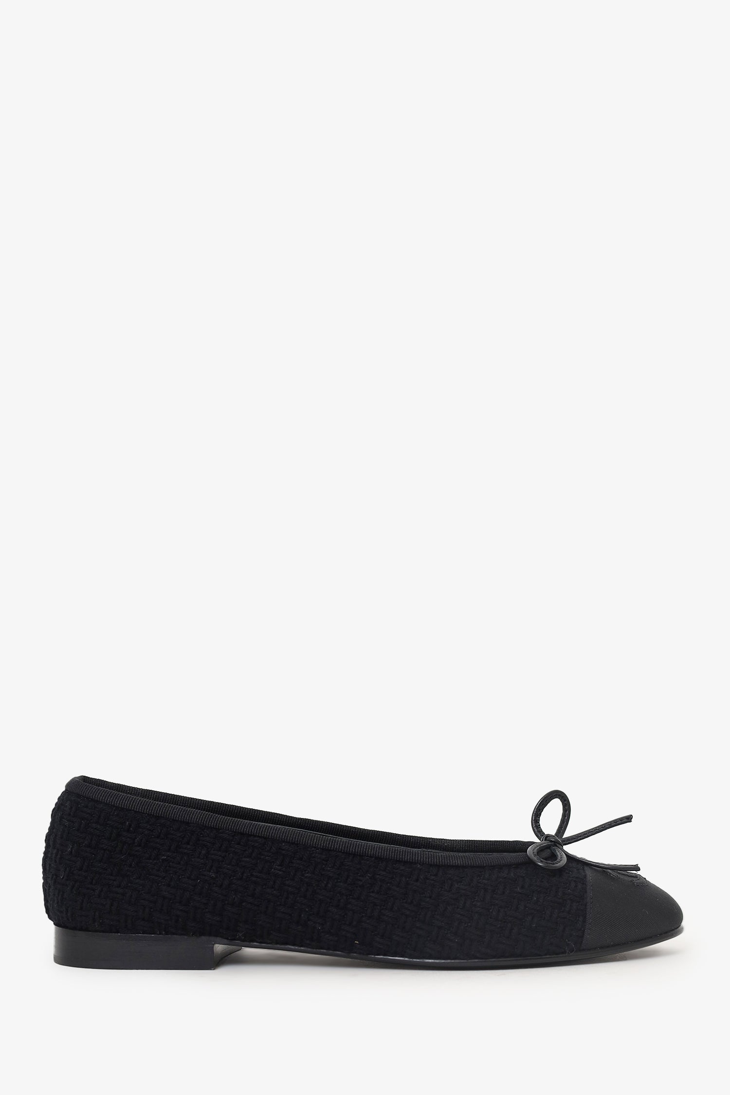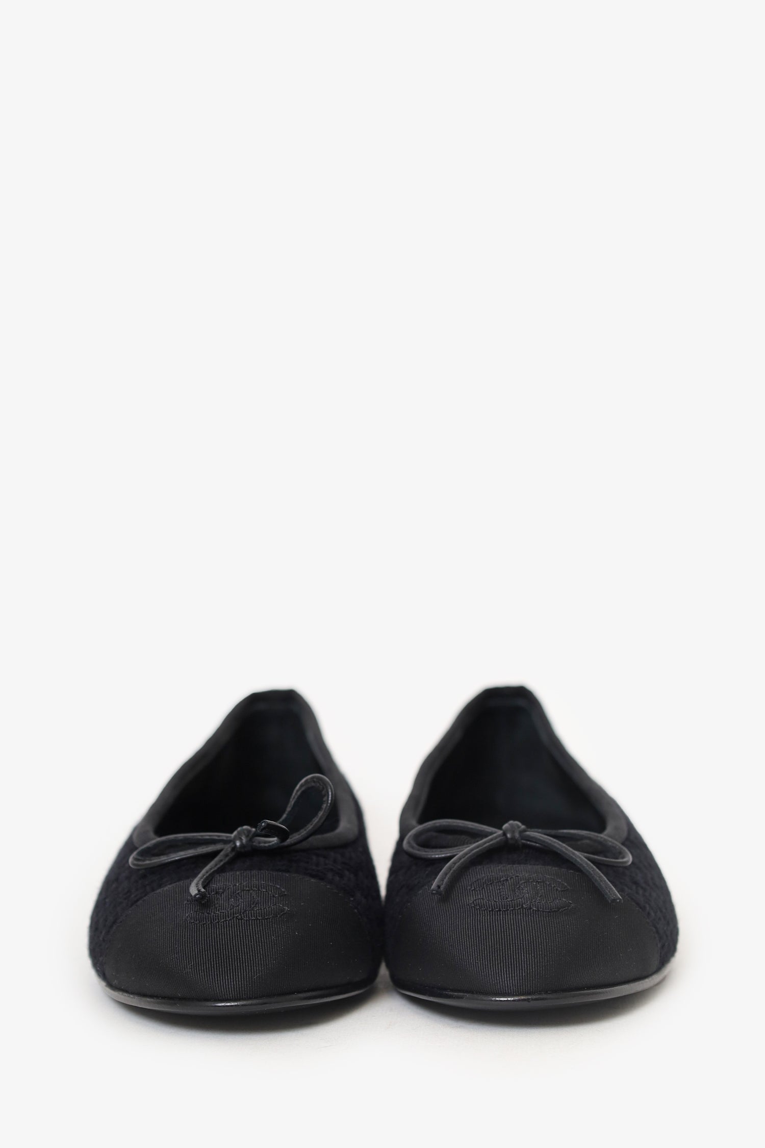 Refresh availabilityPre-Loved Chanel™ Black Knit Ballet Flats. Slip-on. Round toe. Bow detail to front. Logo embellishment at toe box. Lined interior. Tonal stitching.