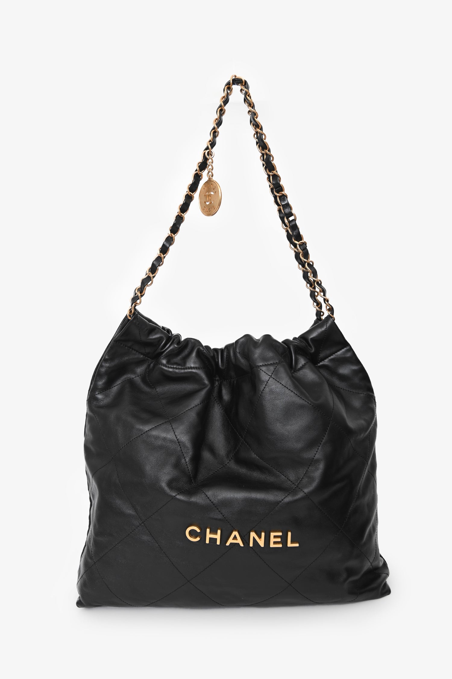 Refresh availabilityPre-Loved Chanel™ Black Lambskin Leather 22 Small Hobo Shoulder Bag GHW. Open top. Leather-and-chain shoulder straps with charm detail. Magnetic snap closure. Snap closures on the sides. Fabric lined interior. 1 interior compartment with 1 interior zip pocket. Interior strap. Gold-tone hardware. Tonal stitching.