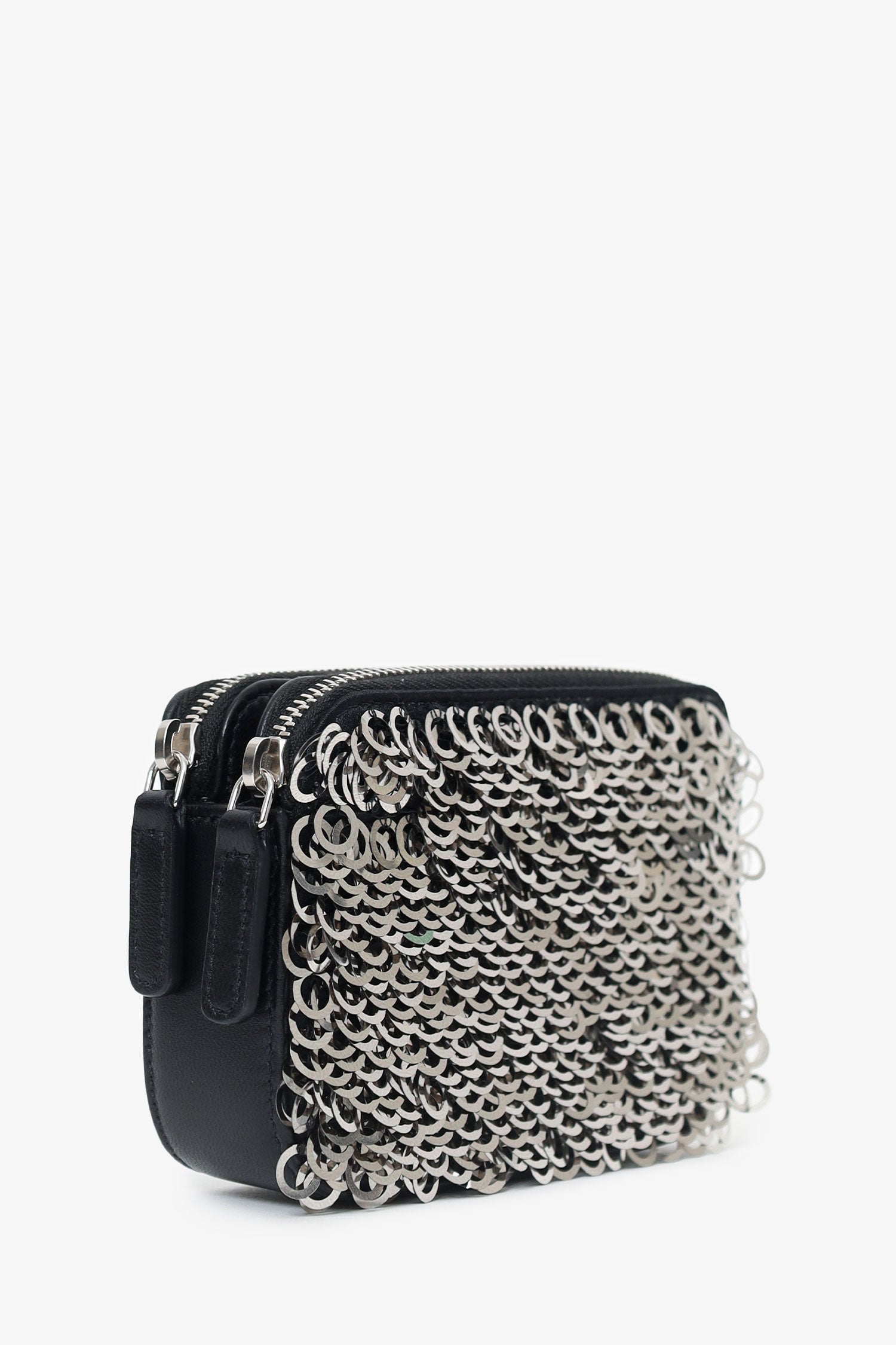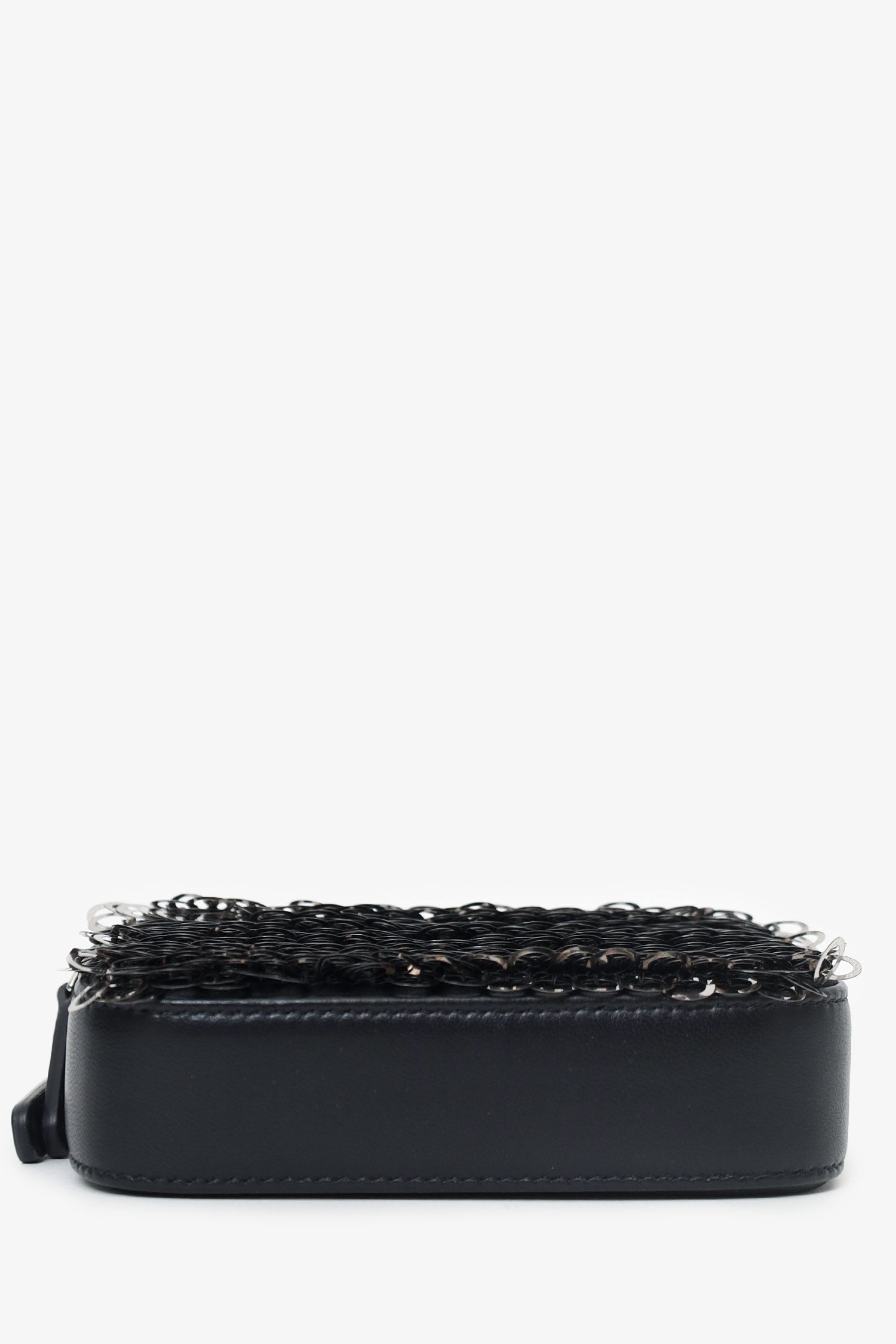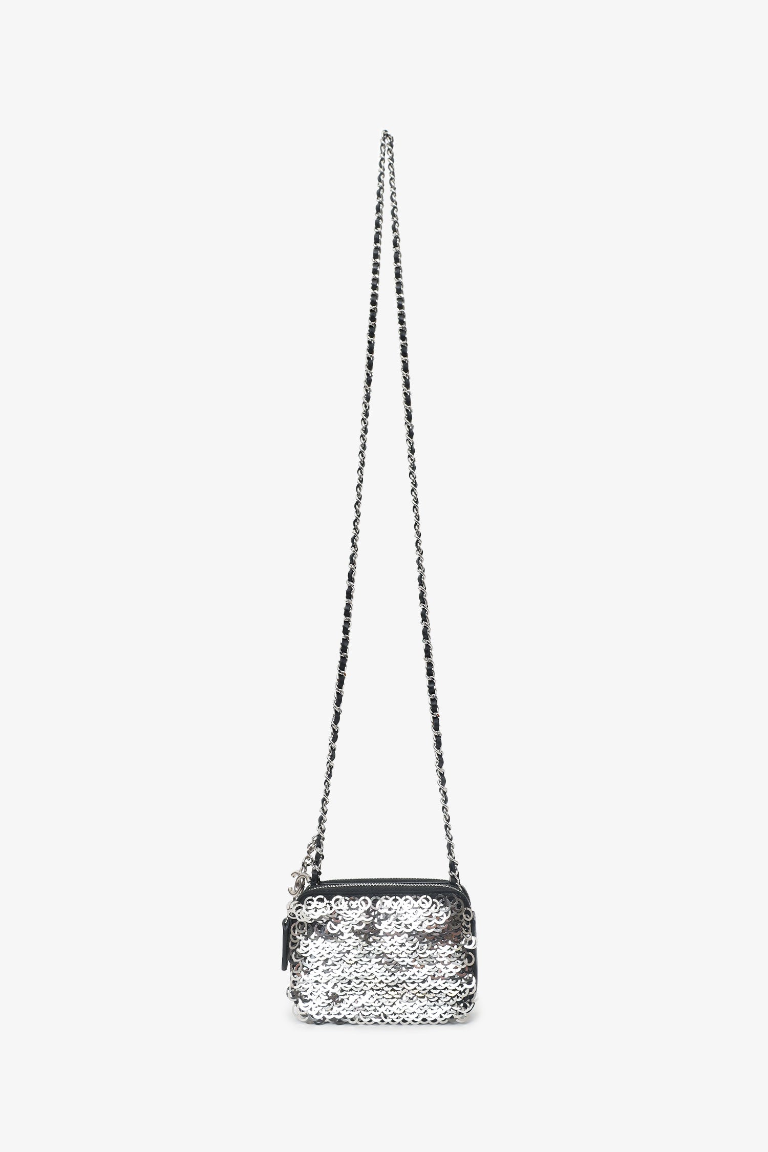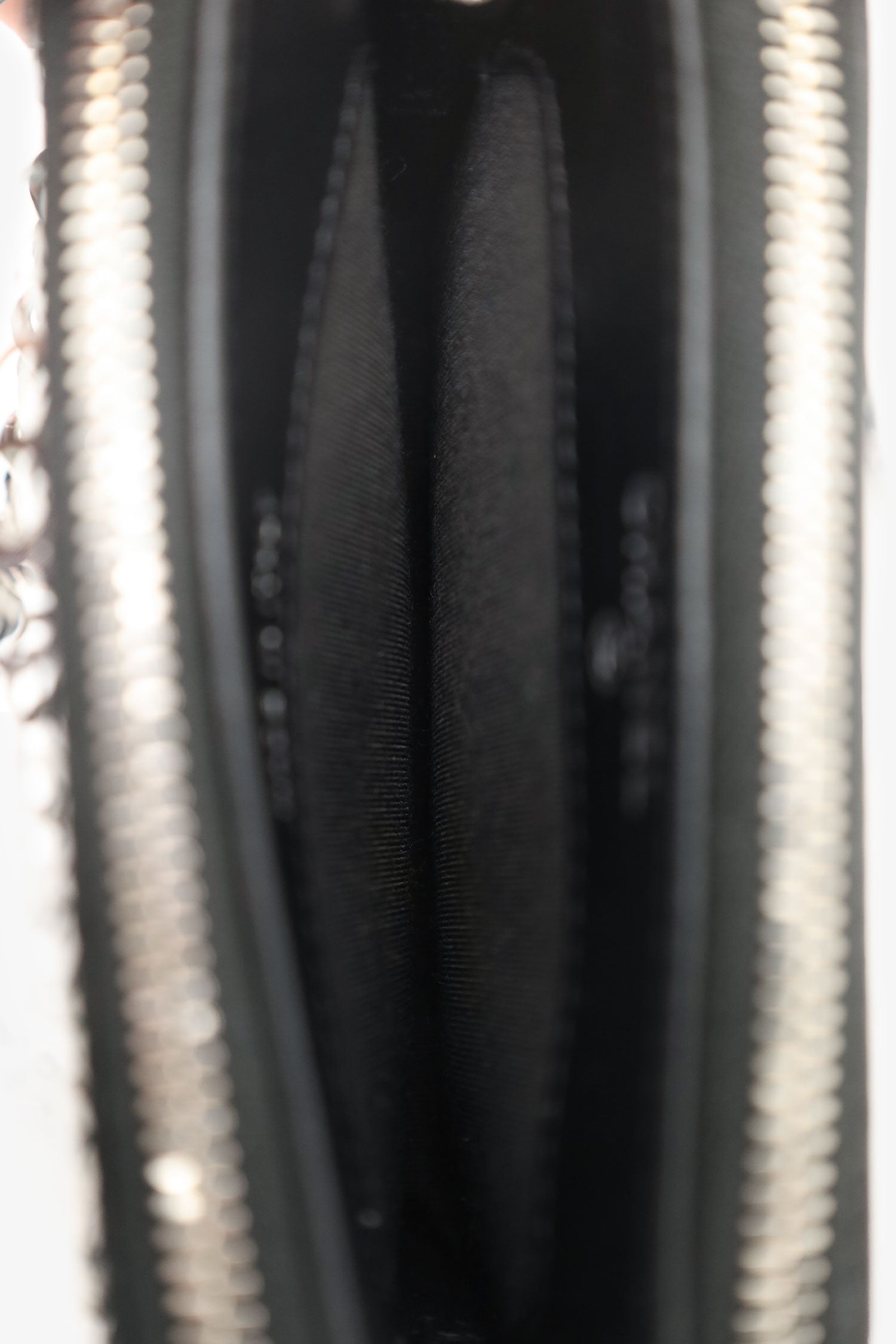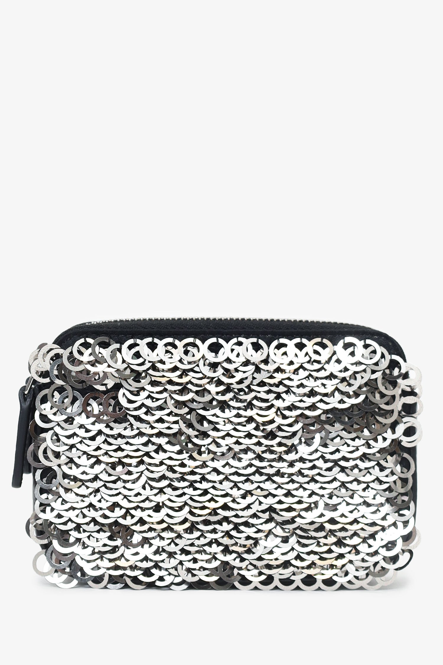 Refresh availabilityPre-Loved Chanel™ Black Sequin Double Zip Clutch. 2 top zip closures. Removable chainlink and leather strap with lobster clasp closure. Lined interior. 3 interior compartments; front contains 3 card holders, middle contains 1 slip pocket, and rear contains 3 card holders. Silver-tone hardware. Tonal stitching.