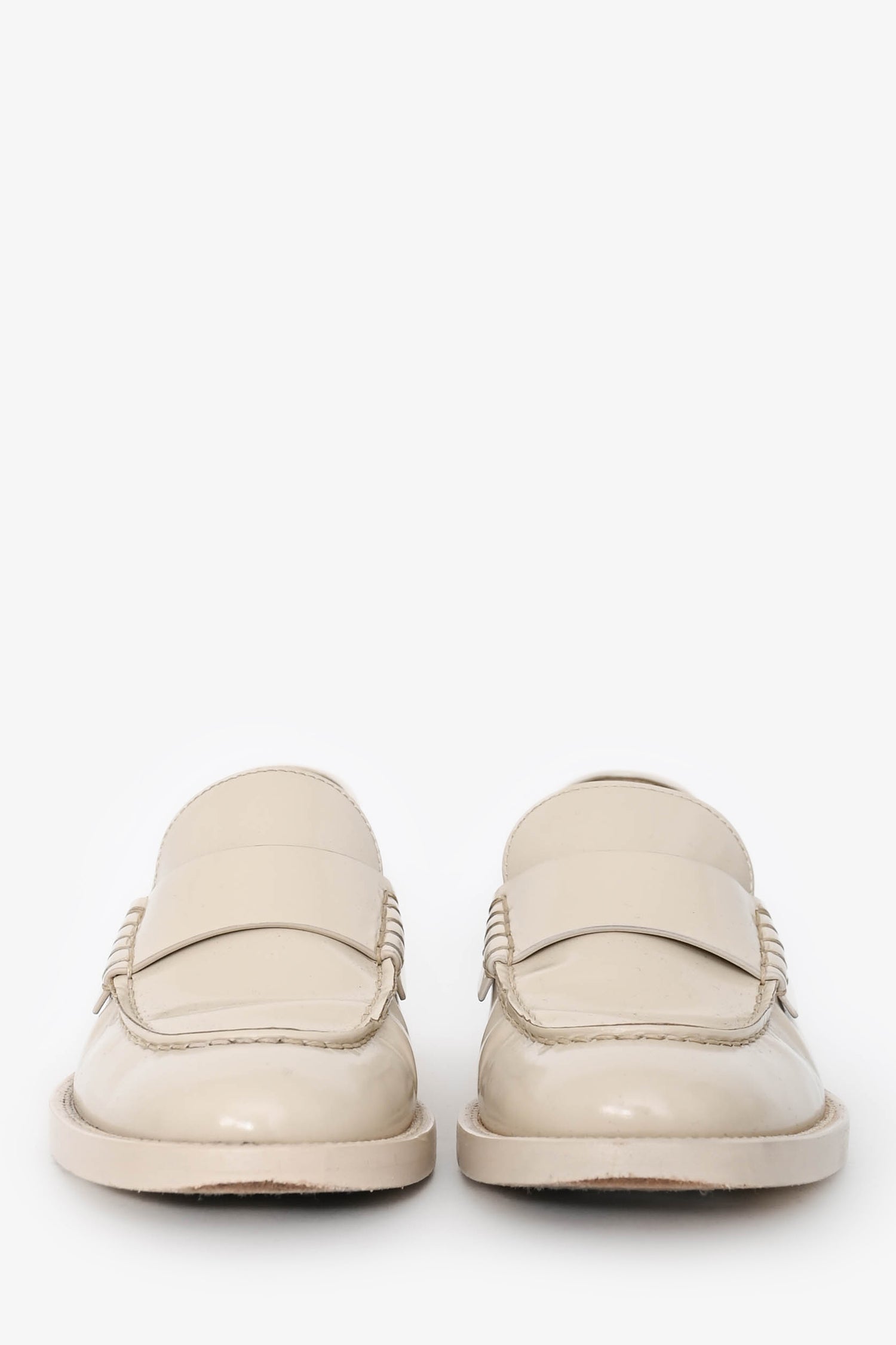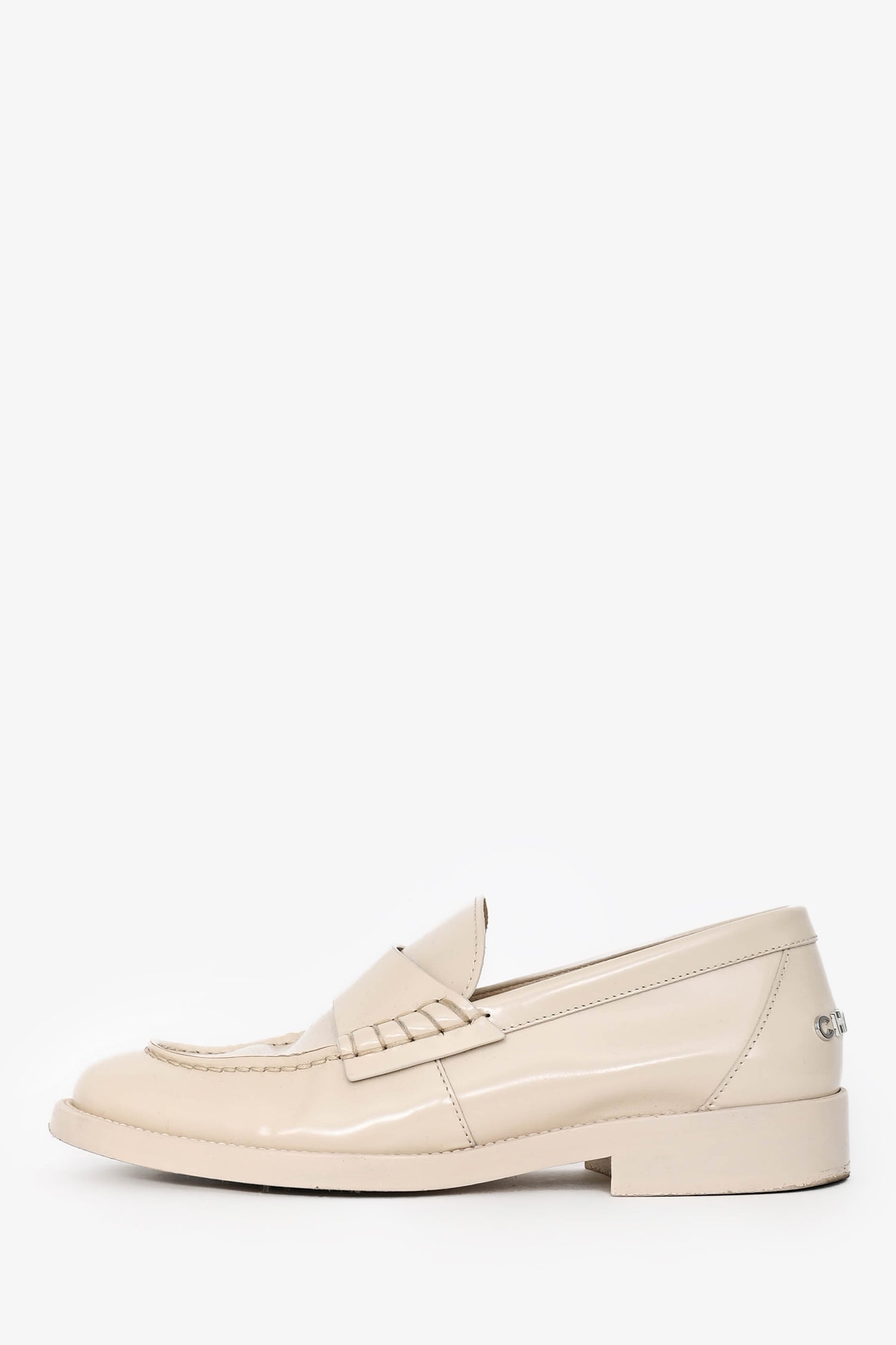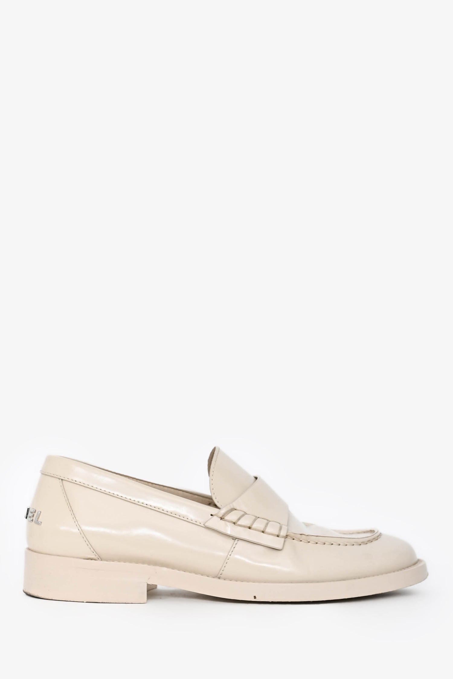 Refresh availabilityPre-Loved Chanel™ Ivory Brushed Leather Logo Loafers. Slip-on. Round toe. Brand logo at the exterior rear.