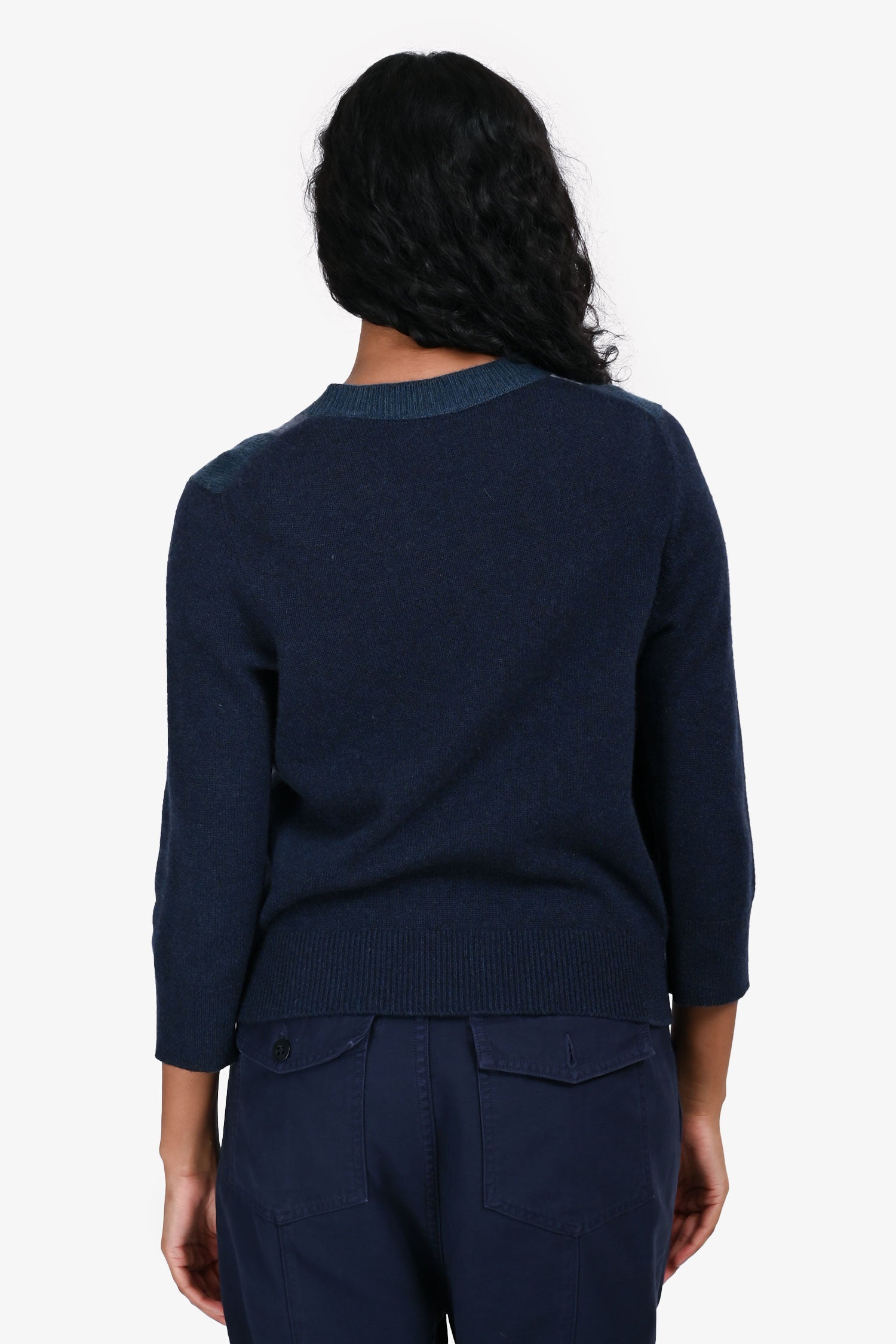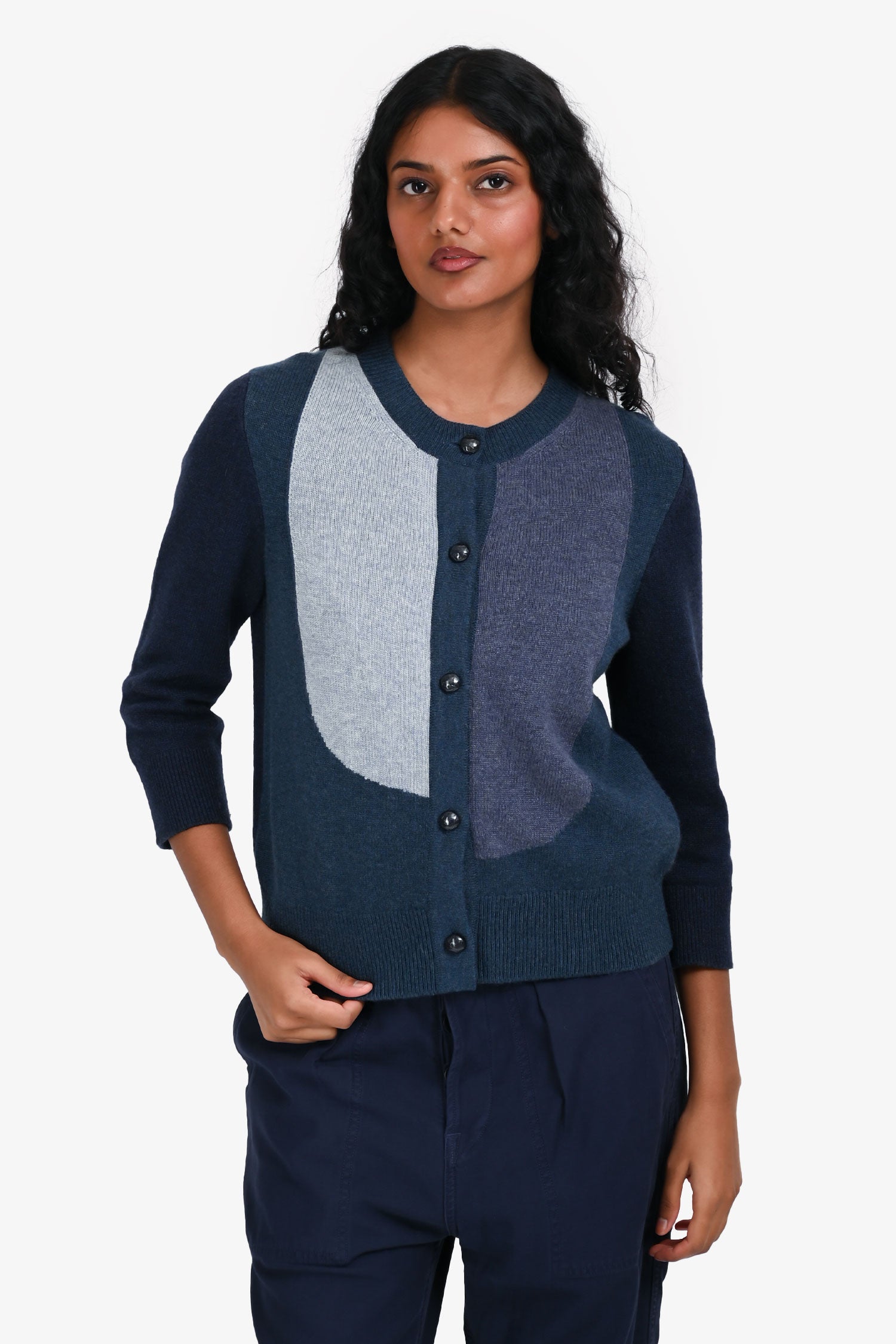 Refresh availabilityPre-Loved Chanel™ Navy/Blue Cashmere Pattern Cardigan. Pull-on. Round neckline. Front button closure. Ribbed fabric detailing at the collar, cuffs, and hem. Tonal stitching.