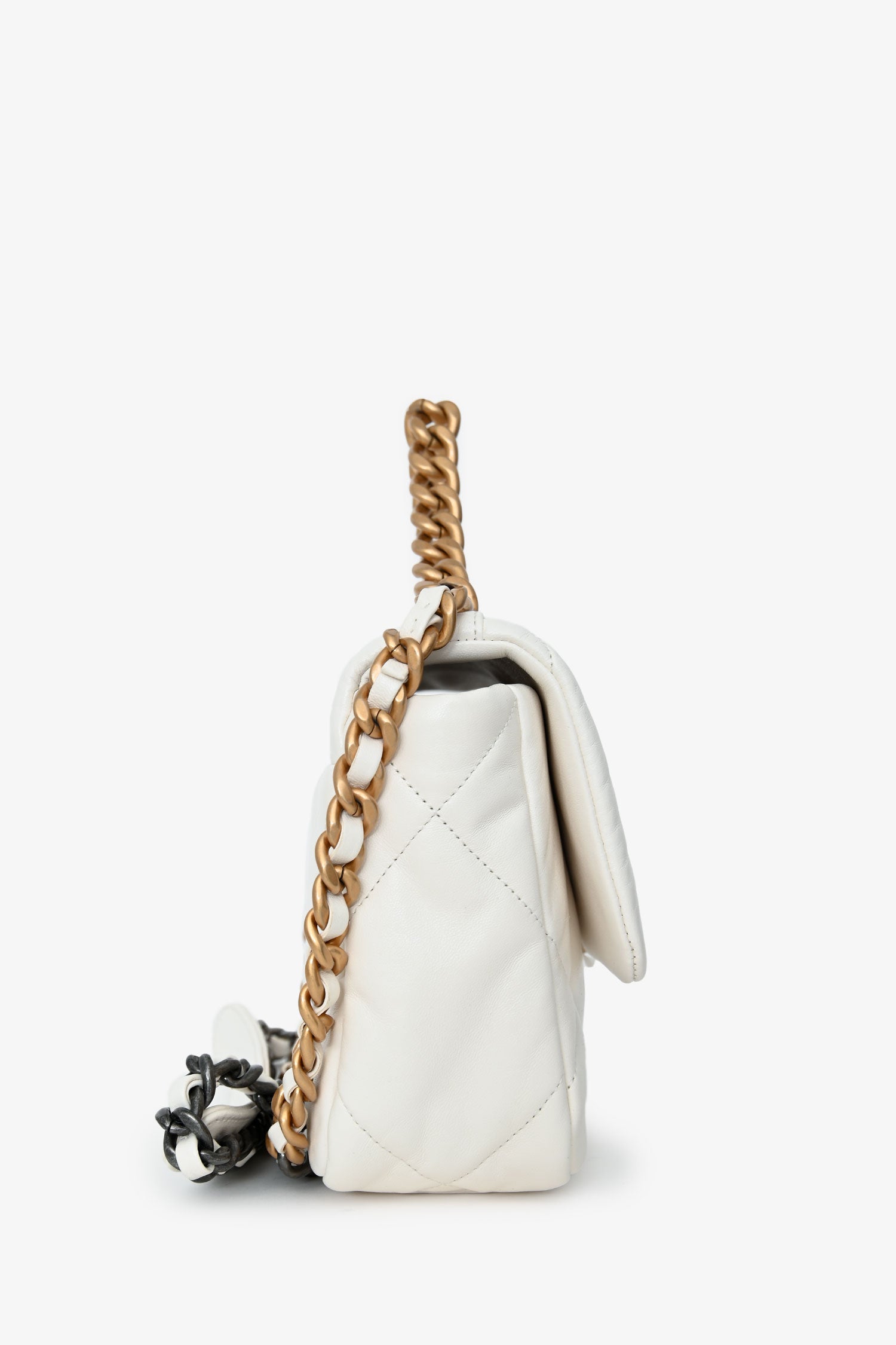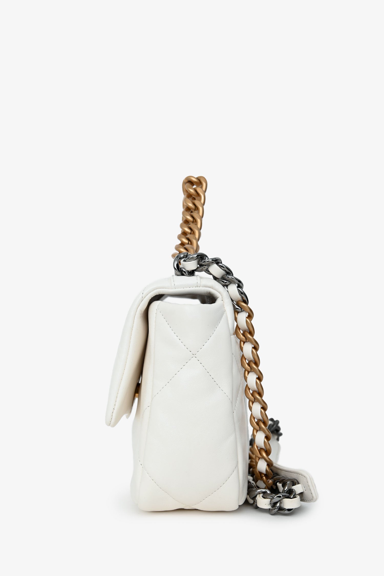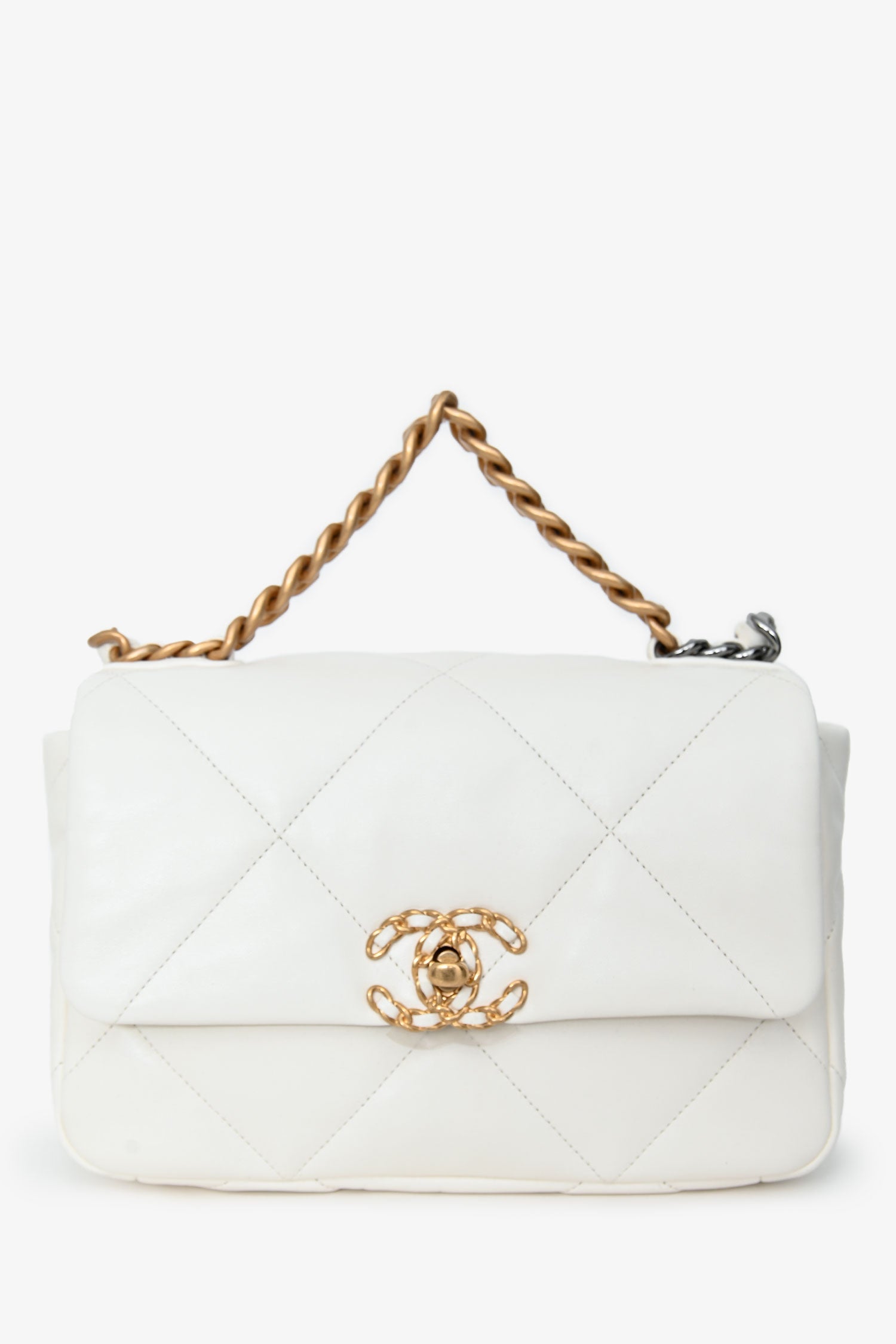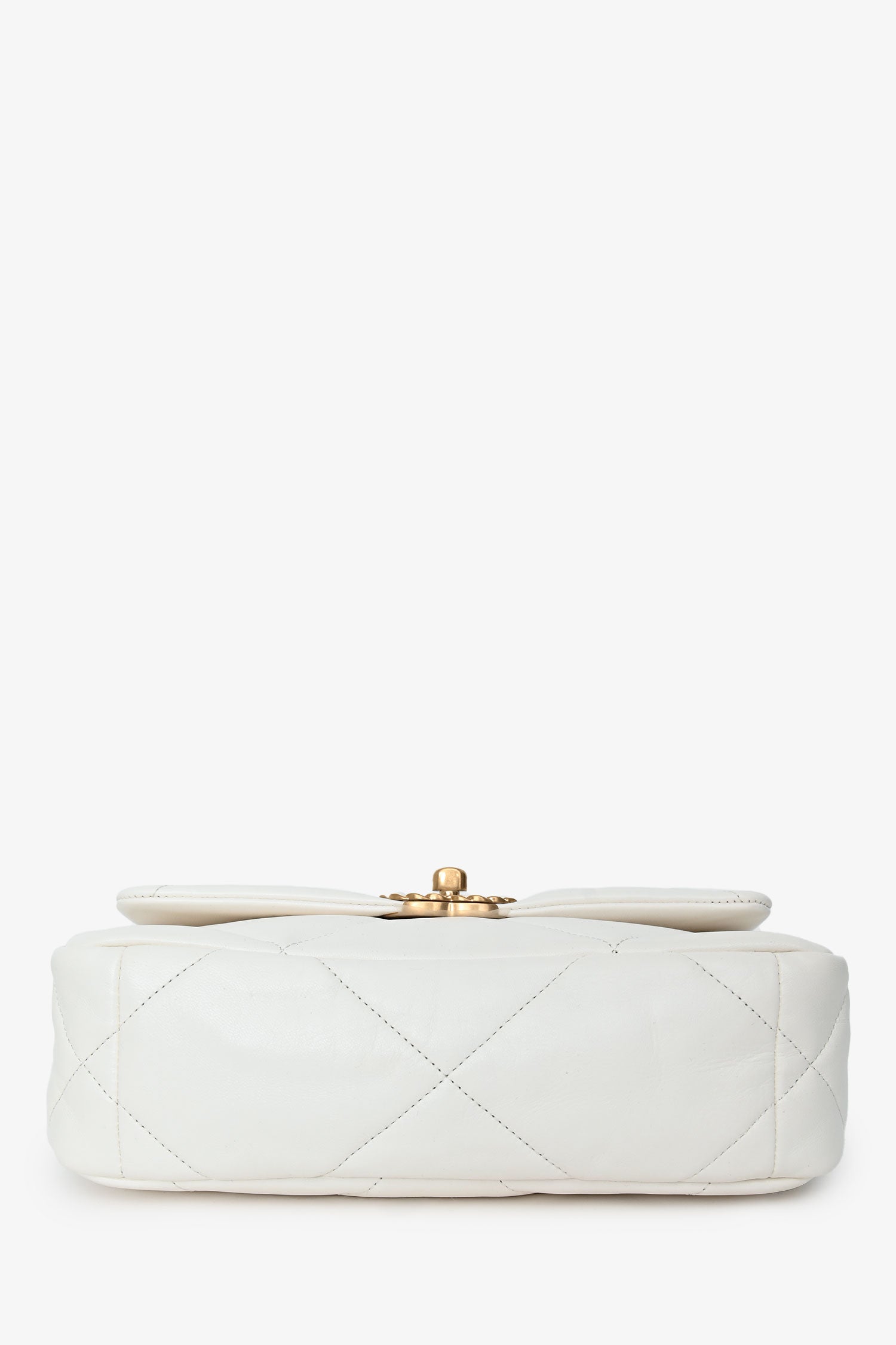 Pre-Loved Chanel™ White Lambskin Leather Quilted CC Small 19 Flap Bag. Front fold-over flap with turn-lock closure. Chain-link strap. Single exterior rear slip pocket. Lined interior. Single interior wall zip pocket. Gold-tone hardware. Tonal stitching.