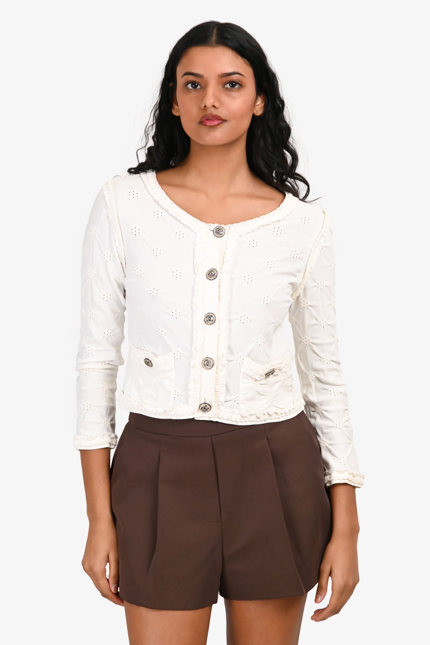 Pre-Loved Chanel™ White Patterned Cropped Cardigan. Round neckline. Front button-up closure. 2 front pockets with button closure. Silver-tone hardware. Tonal stitching.