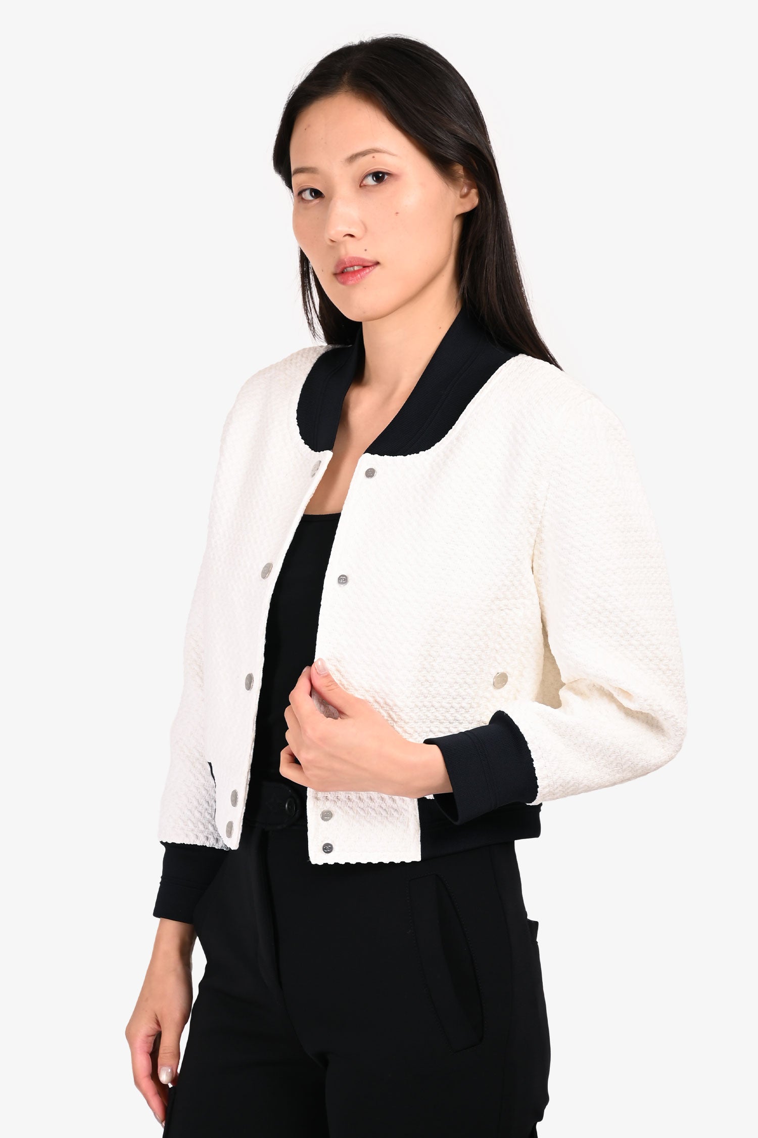 Pre-Loved Chanel™ White/Black Tweed Baseball Style Cropped Jacket. Front snap button-up closure. 2 front pockets with snap-button closure. Unlined.