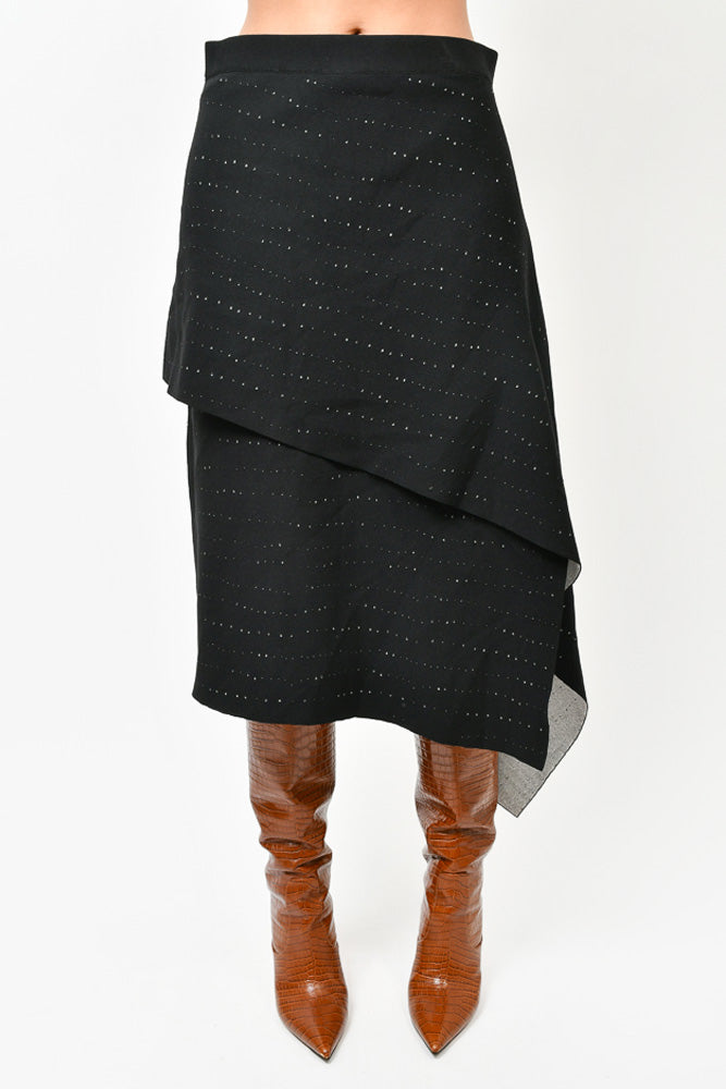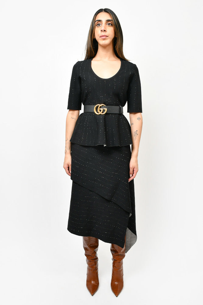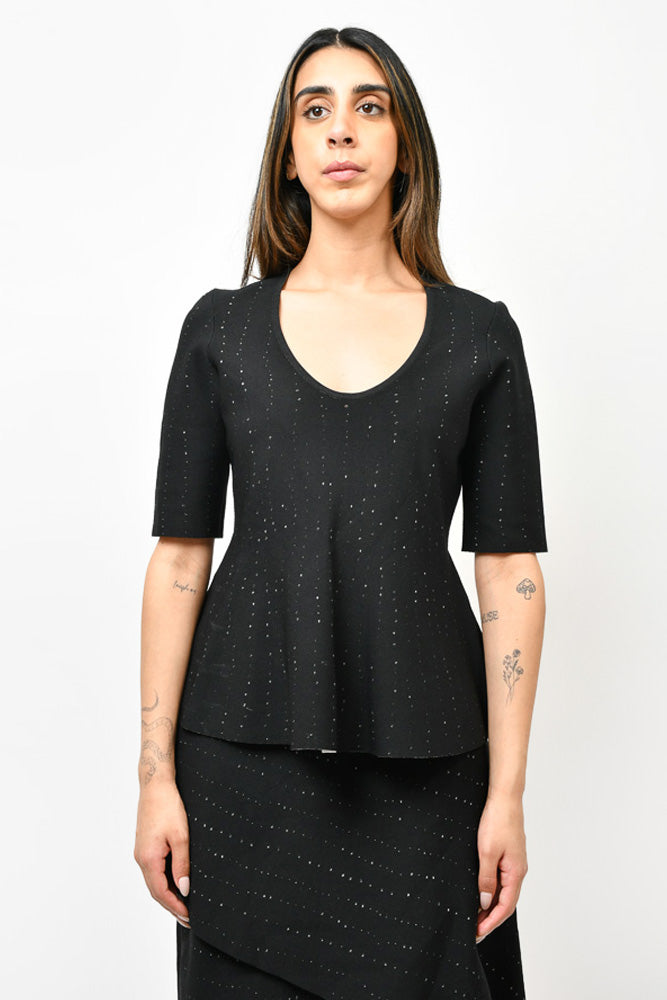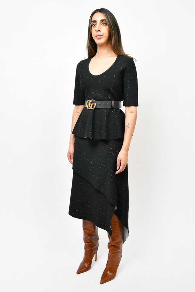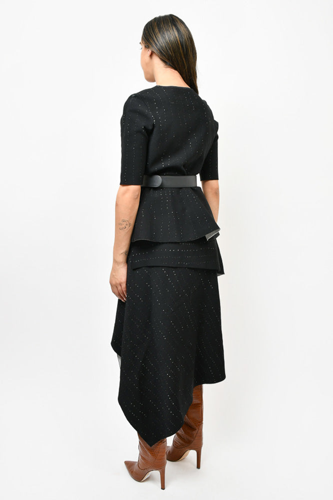 Refresh availabilityProenza Schouler Black Knit Top with Dotted Laser Cut Detailing and Skirt Set. Top: Scoop neckline. Flare shape. Unlined. Tonal stitching. Skirt: Tiered shape. Elastic waistband. Unlined. Tonal stitching.