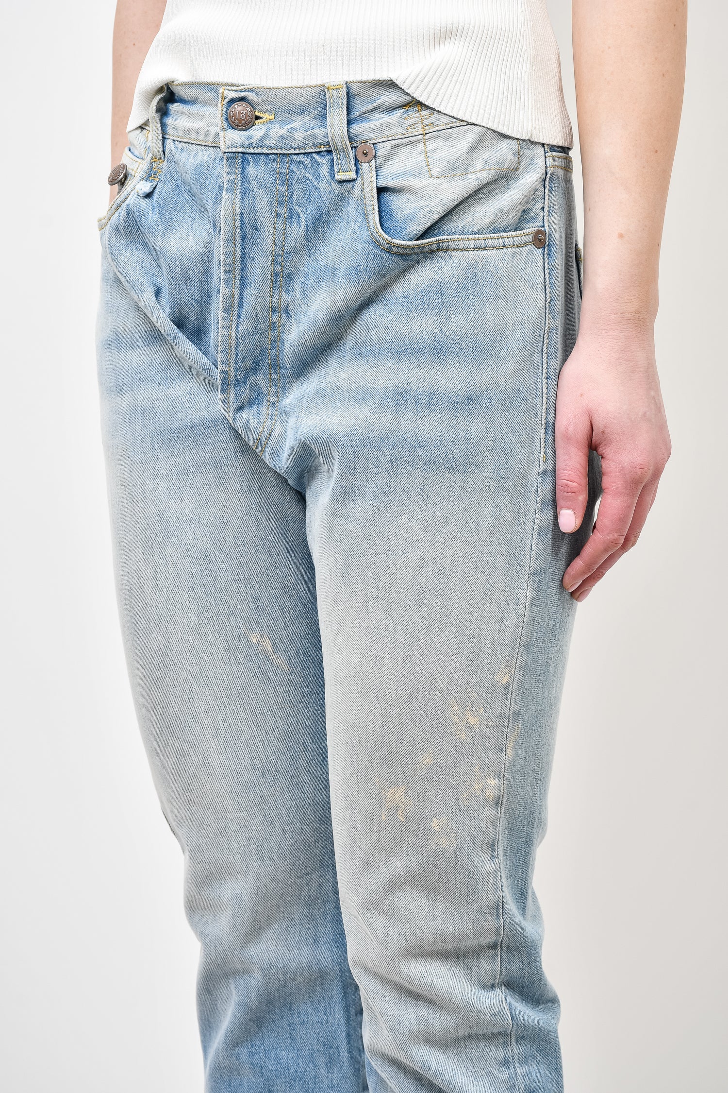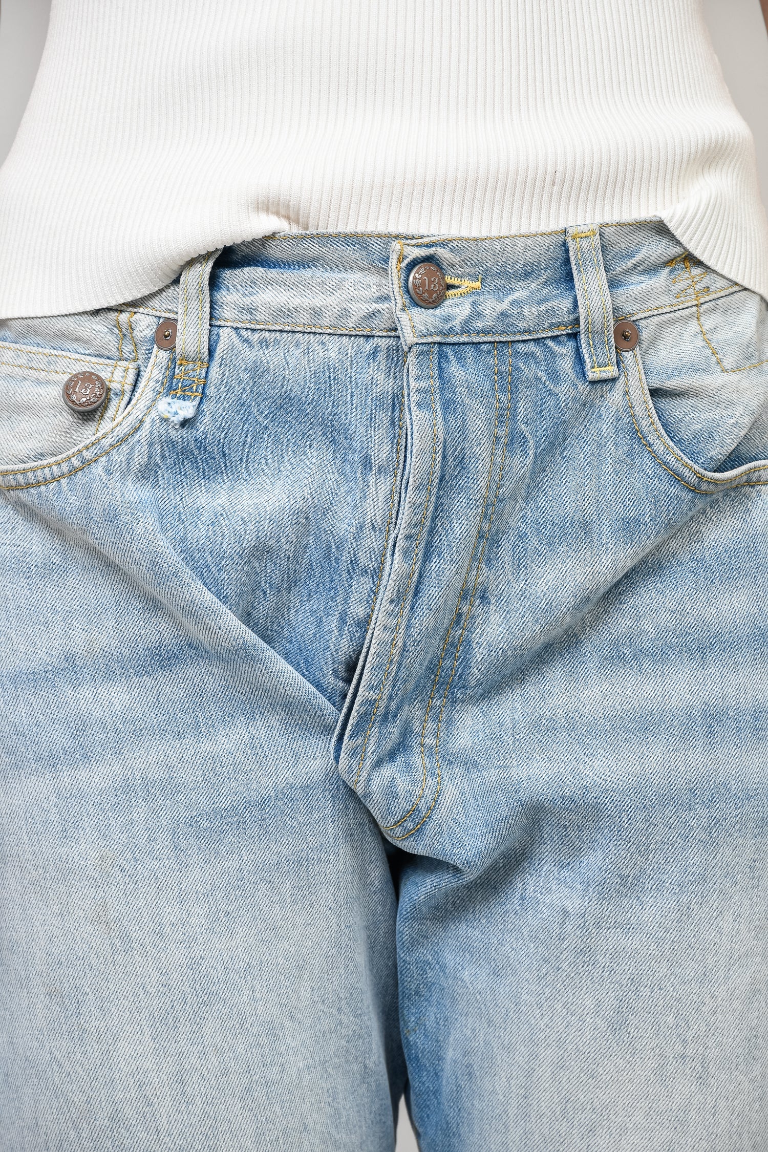R13 Blue Denim Boyfriend Jeans. Front button closure. Open front detail. Distressing details throughout. Silver-tone hardware. Contrast stitching.