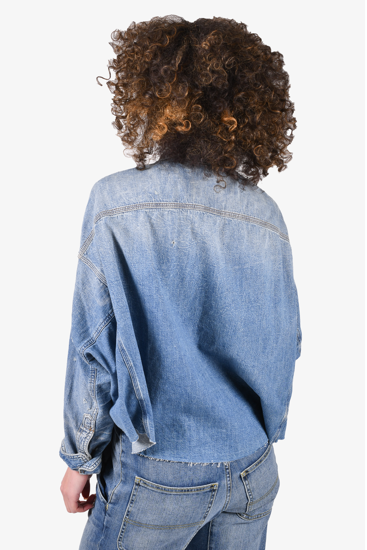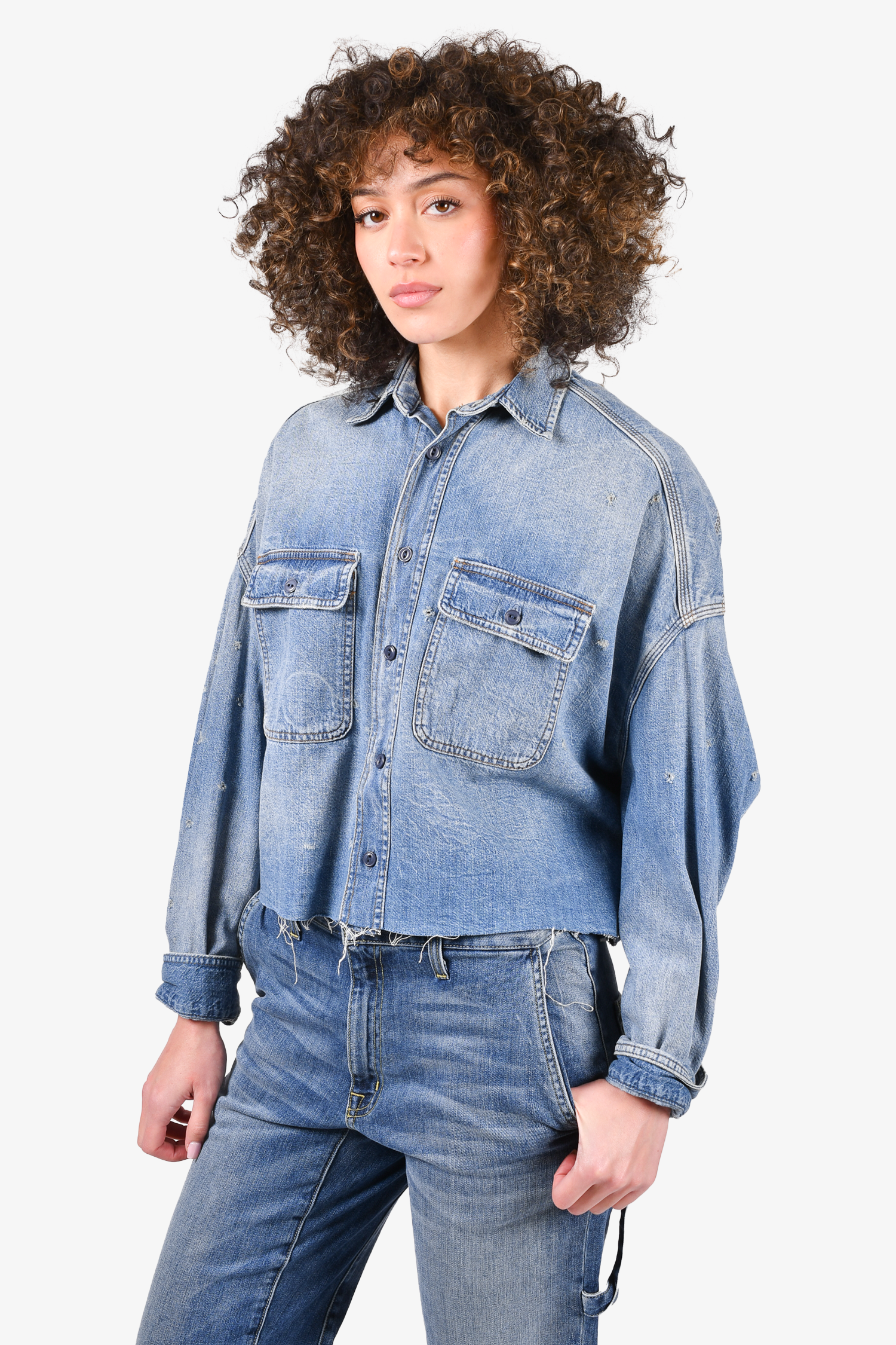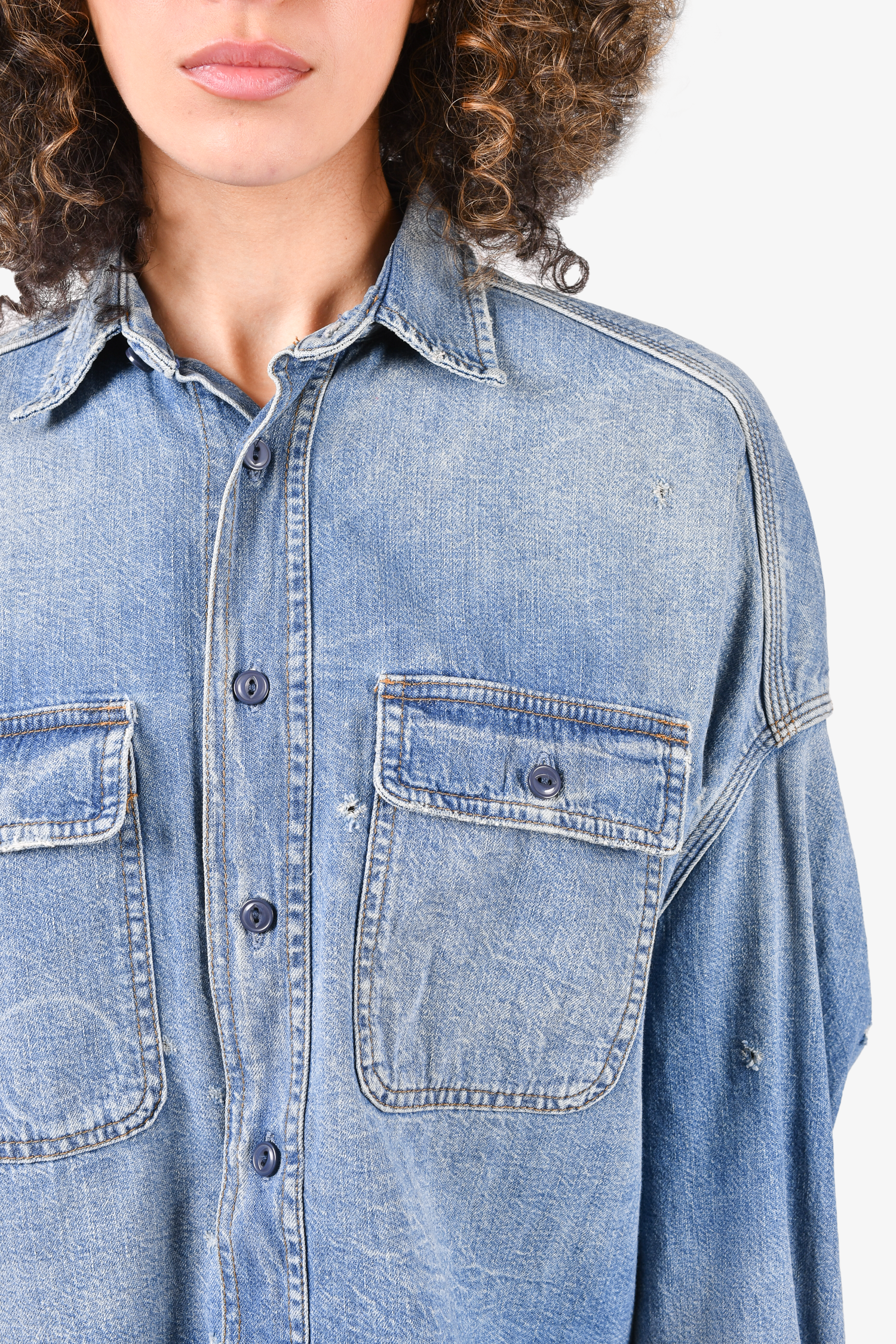 Refresh availabilityR13 Blue Medium Wash Denim Distressed Collared Button Down Top. Front pockets with button closure. Button closure on the cuffs. Contrast and tonal stitching.