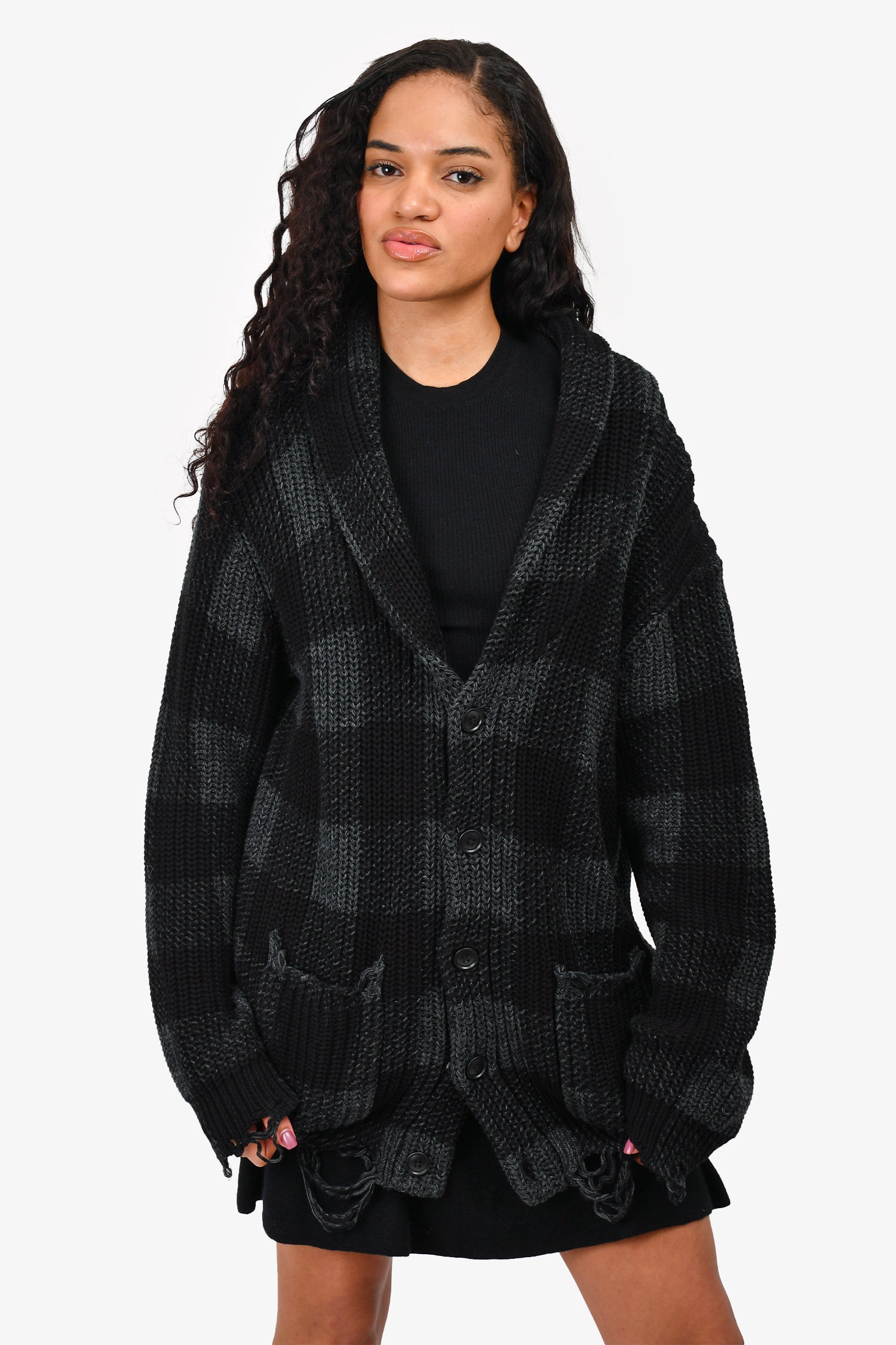 Refresh availabilityR13 F/22 Black/Grey Cotton Knit Plaid Asymmetrical Cardigan. Front button-up closure. Front pockets. Distressed cuffs and hem.