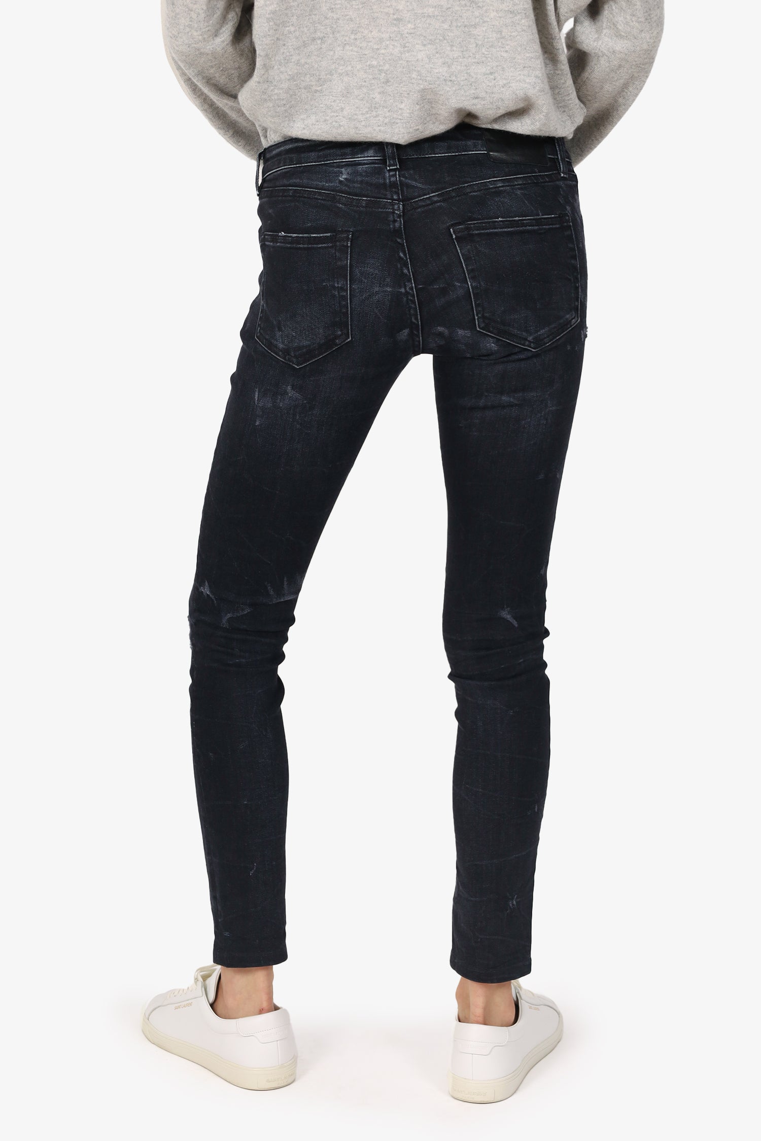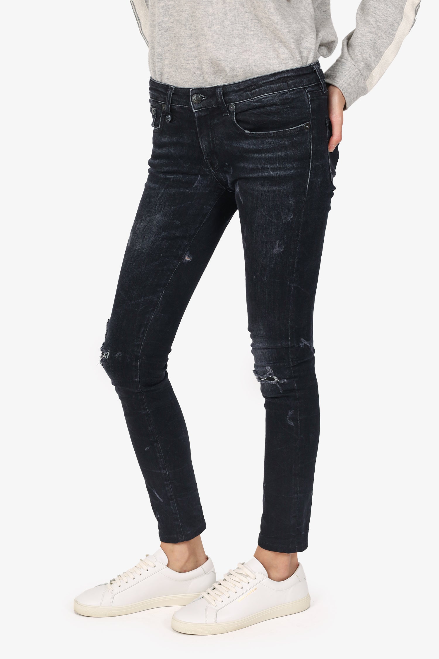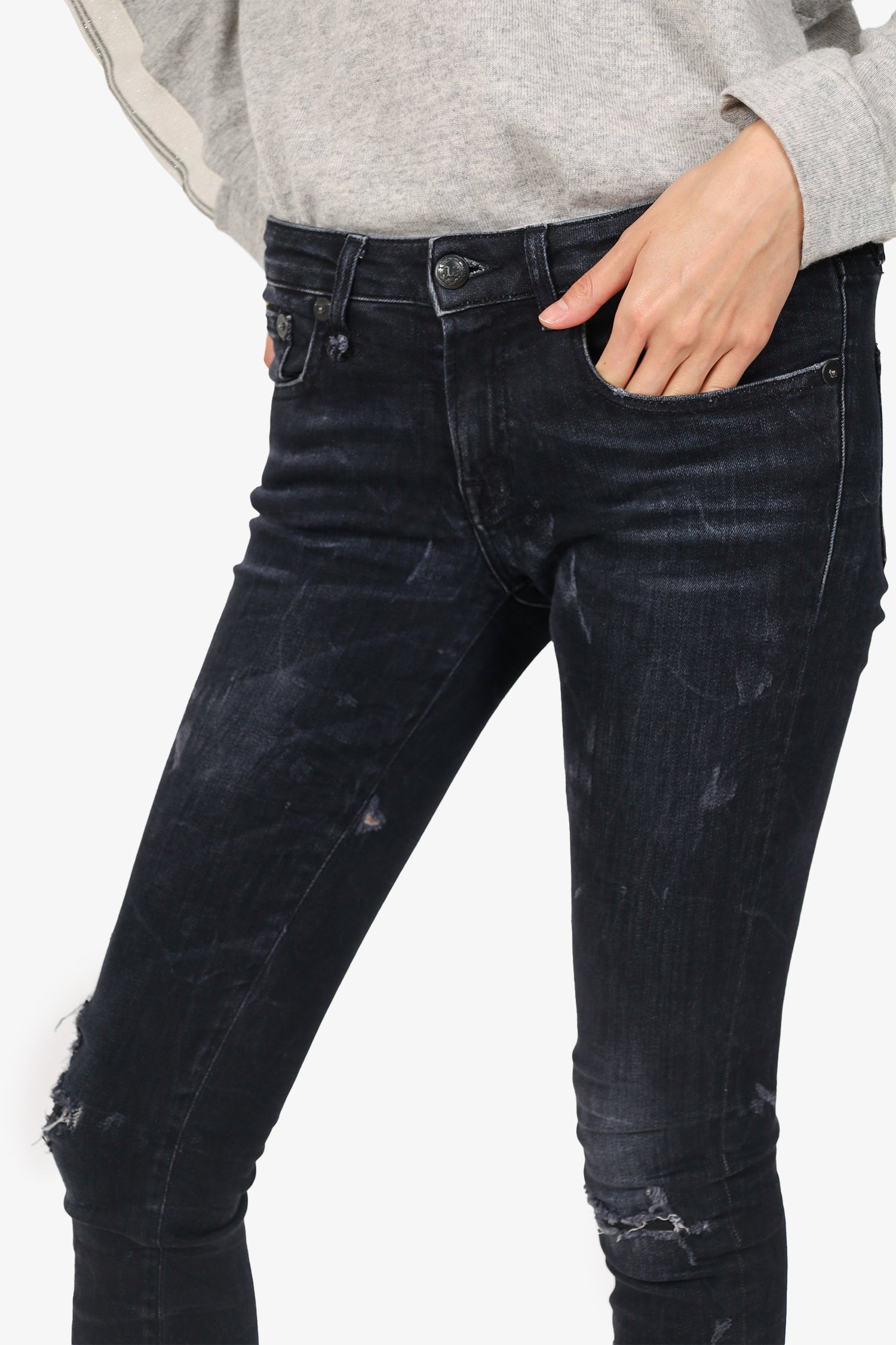 Refresh availabilityR13 Grey Distressed Skinny Jeans. Slip-on. Front zip with button closure. Waistband belt loops. 5 exterior pockets; 2 front side slip and 1 mini compartment, 2 rear slip. Distressing throughout. Dark silver-tone hardware. Tonal stitching.