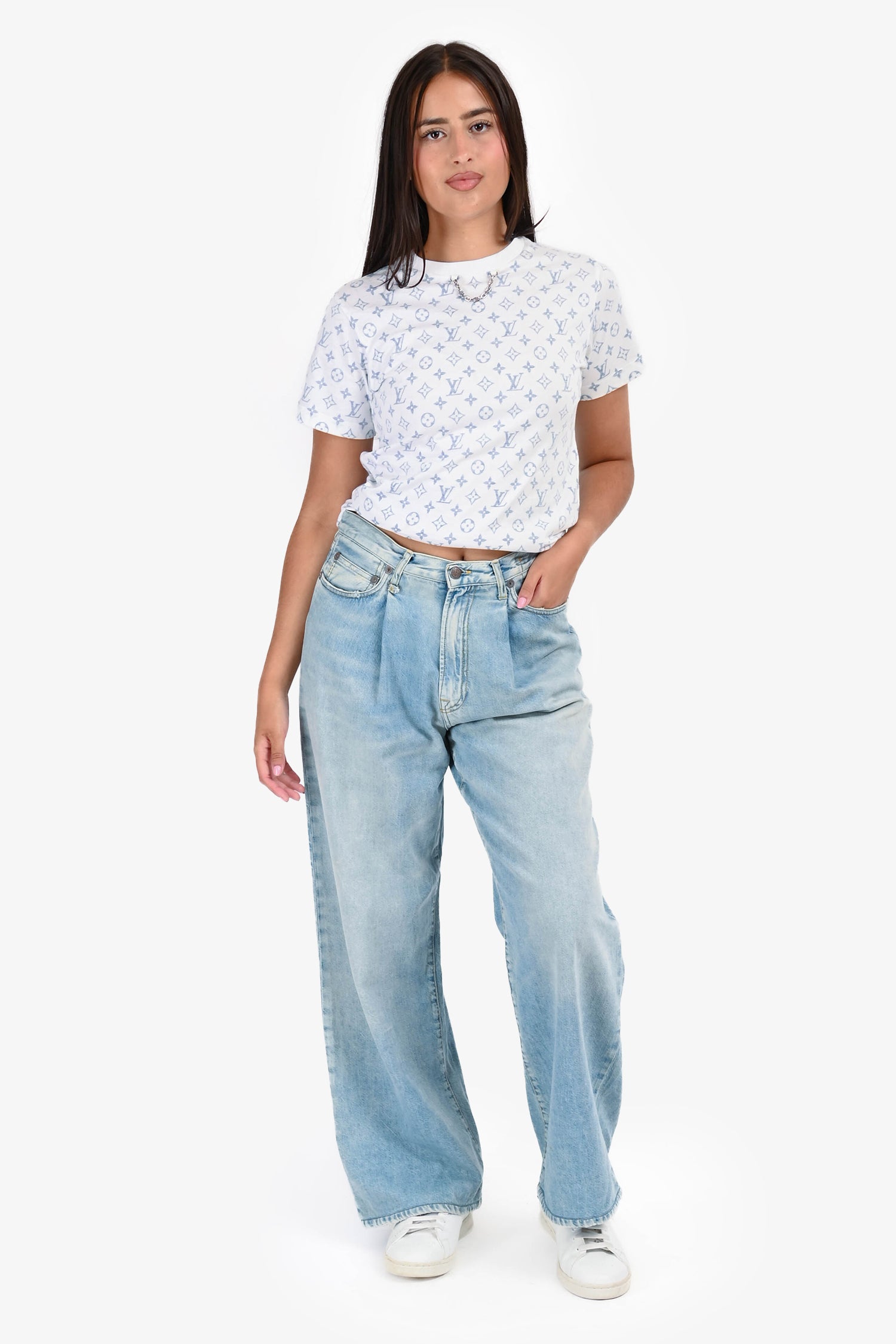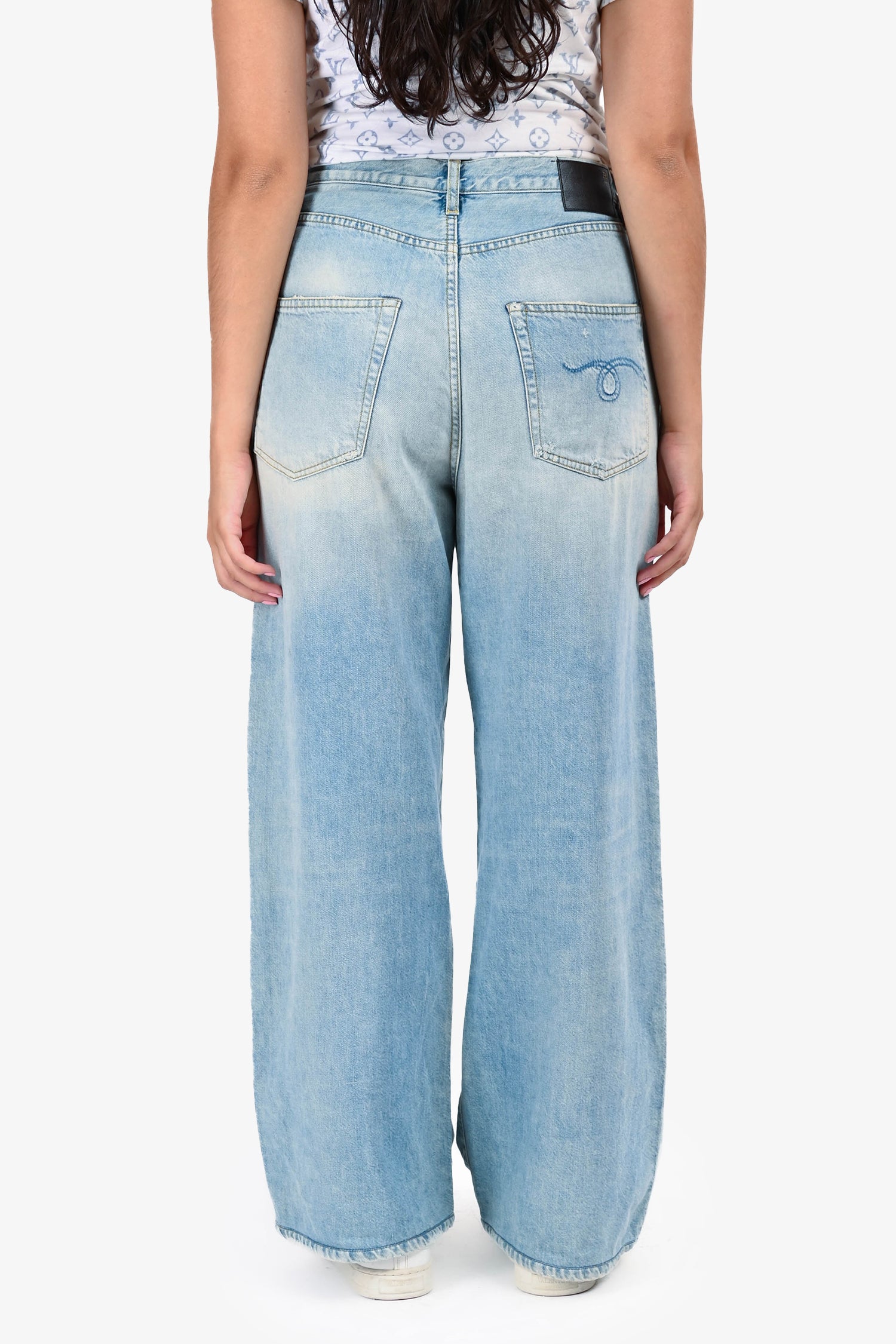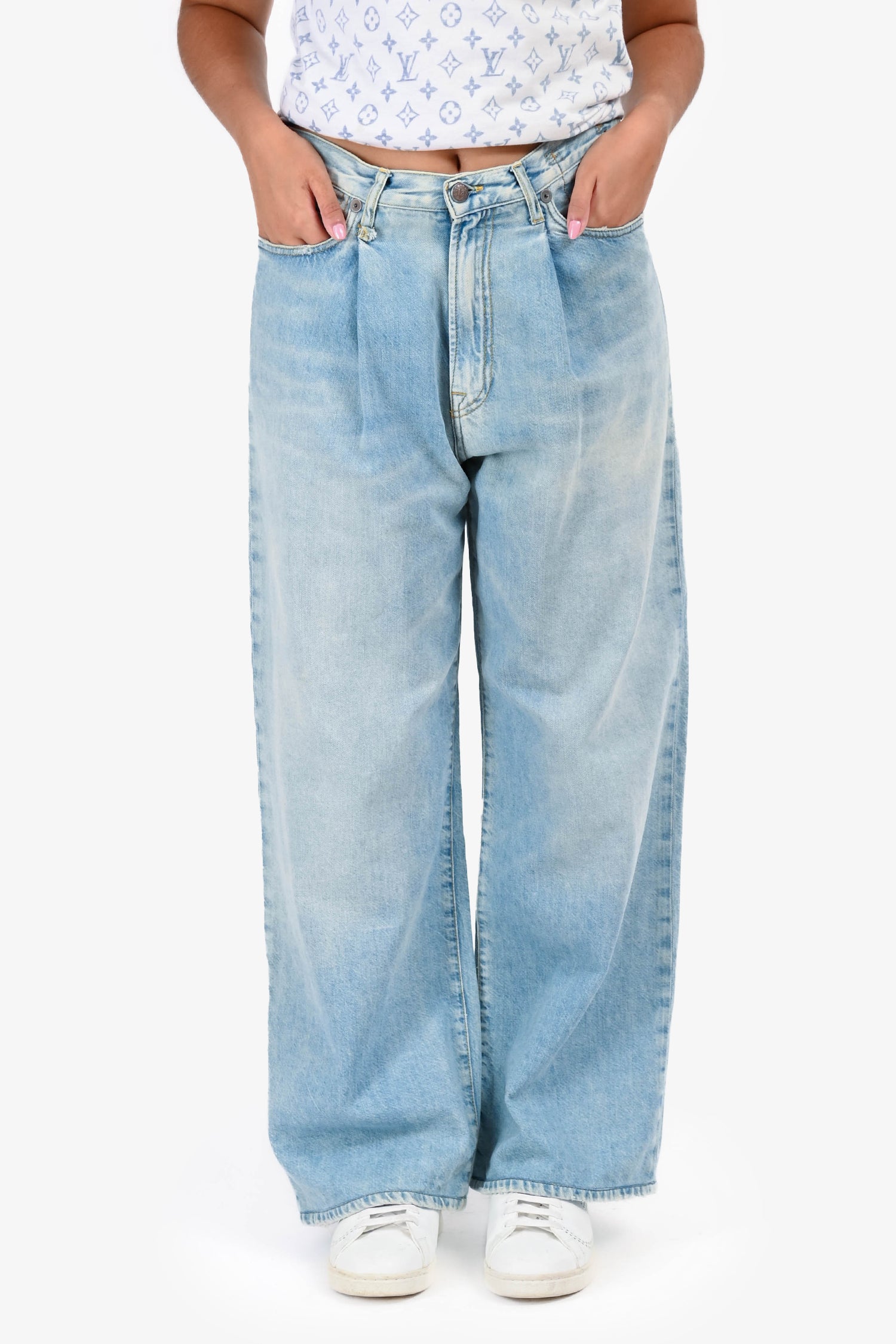Refresh availabilityR13 Light Blue Washed Denim Front Pleated Jeans. Zip-fly with a button closure. 5 slip pockets. Intentional distressing. Contrast stitching.