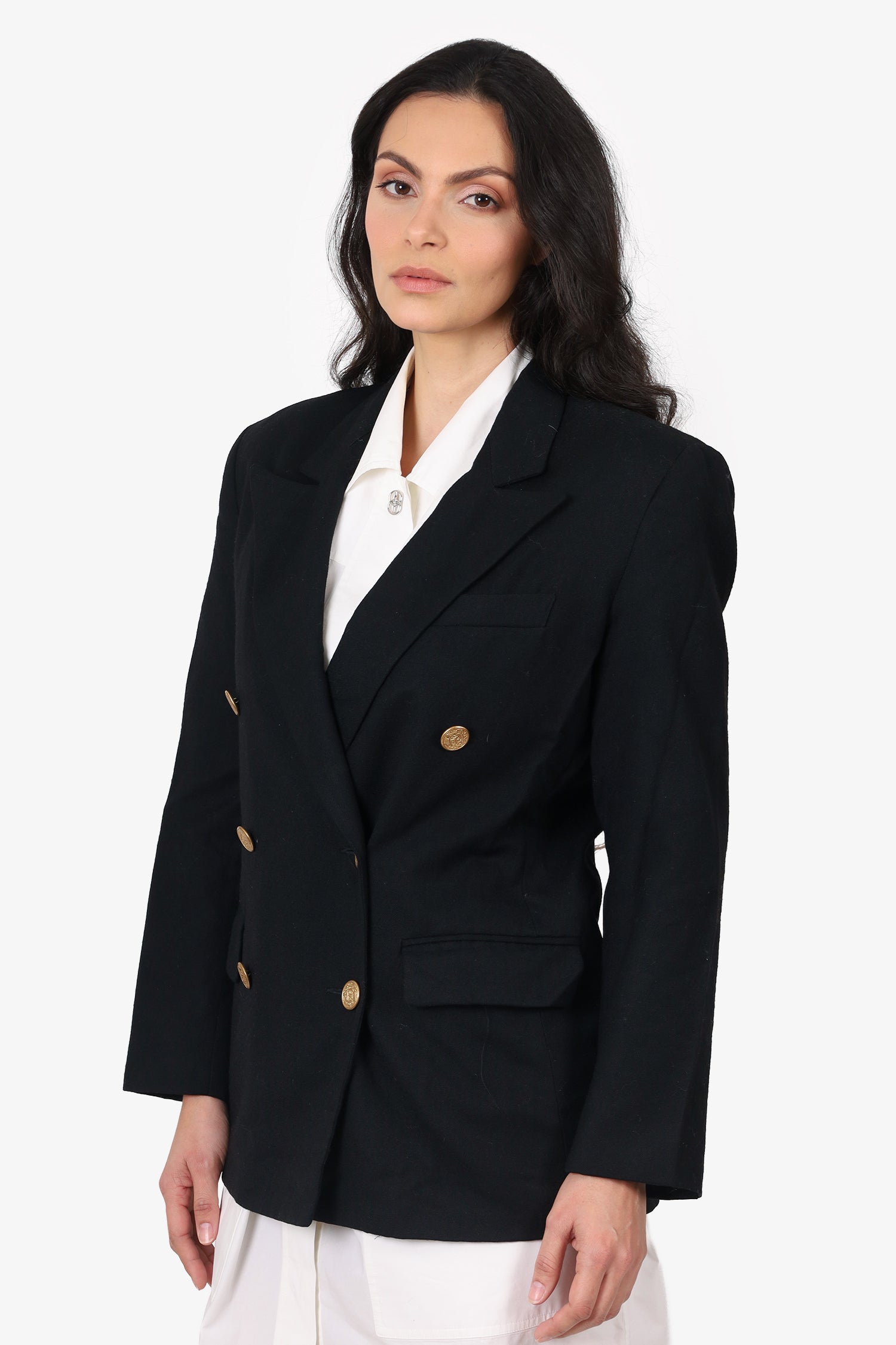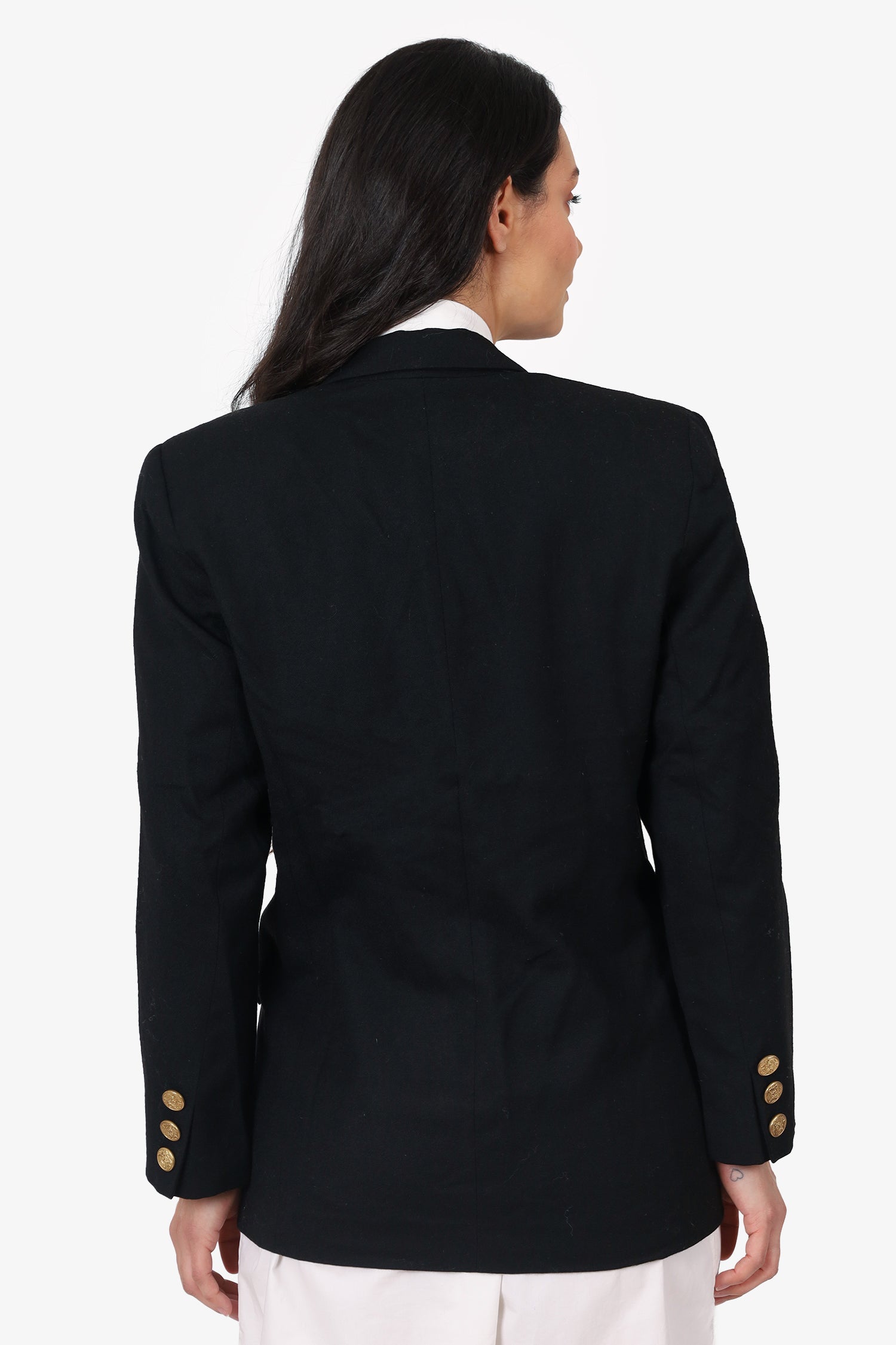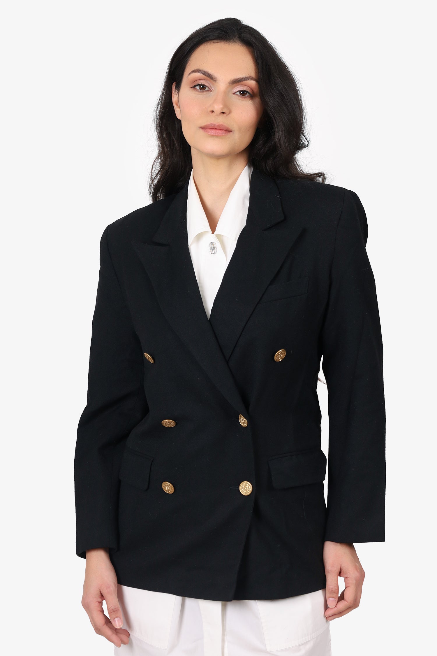 Refresh availabilityRaffella Vintage Navy Blue Wool Gold Button Double Breasted Blazer. Pull-on. Peak lapels. Front button-up closure. 2 exterior side slip pockets with front fold-over flap. Sleeve cuffs with decorative button detail. Lined interior. Gold-tone hardware. Tonal stitching.