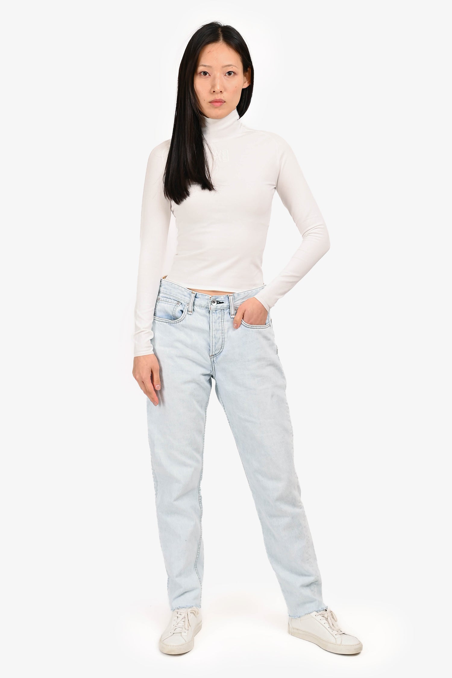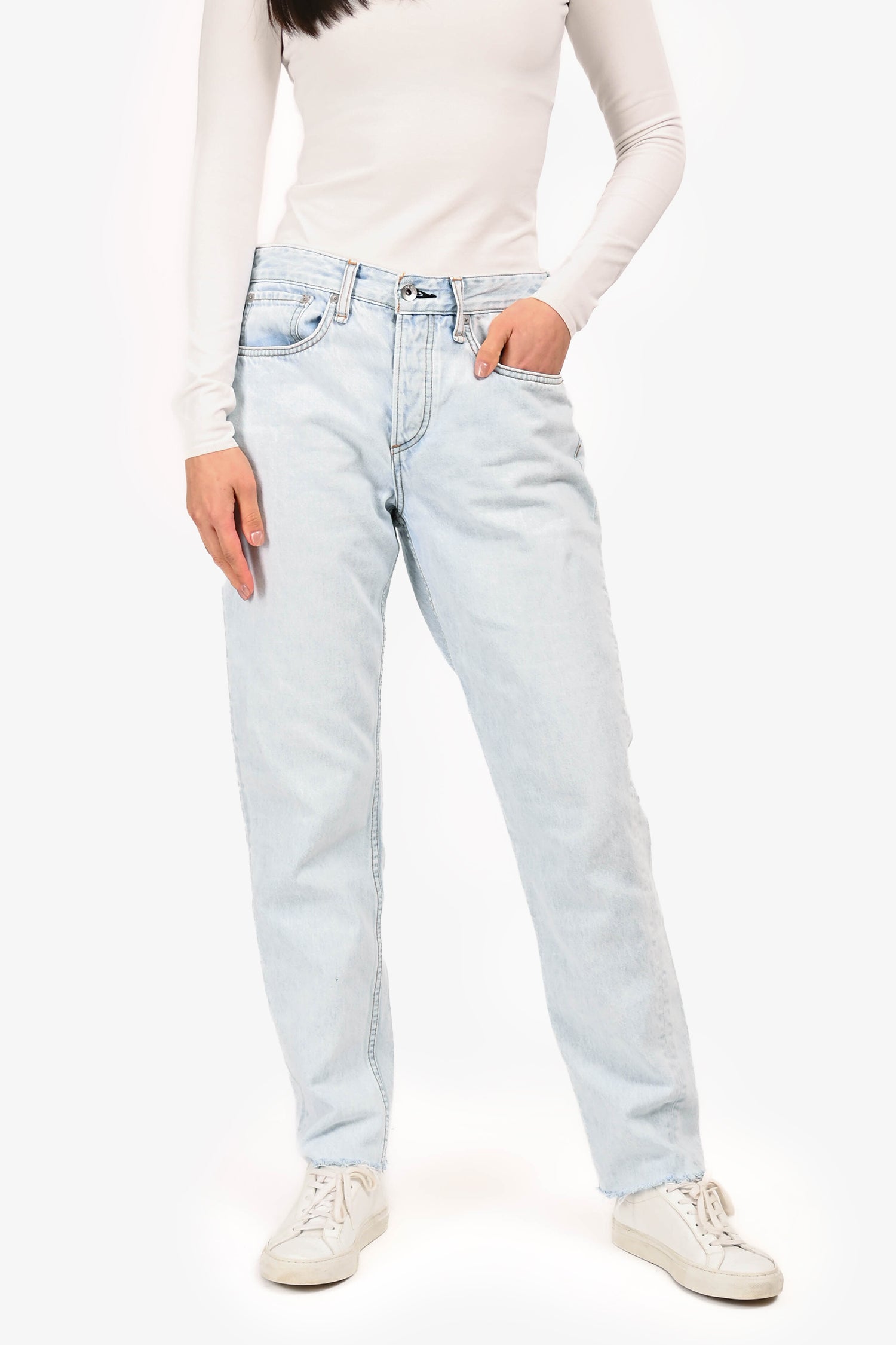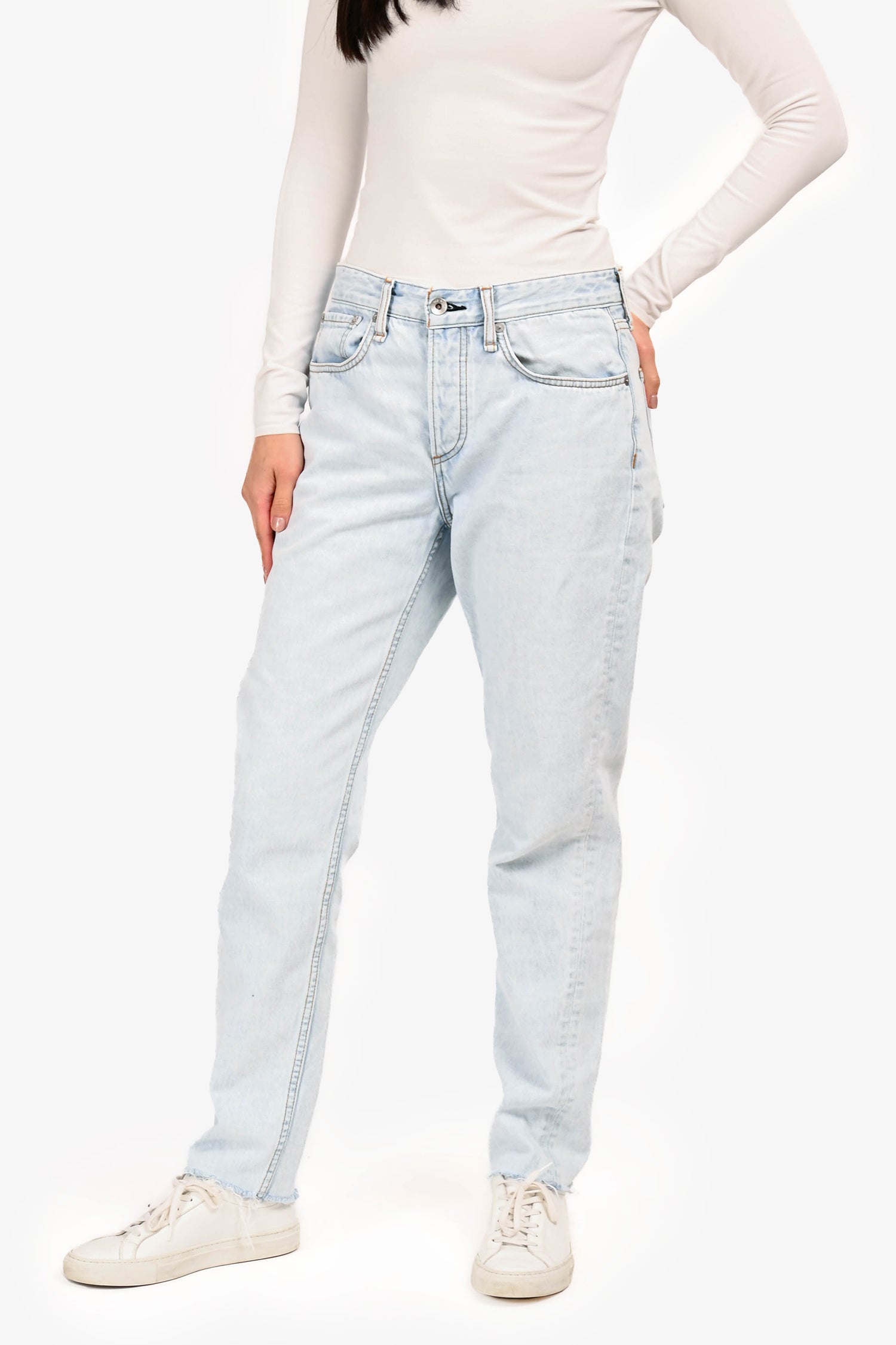 Refresh availabilityRag & Bone Light Blue Denim Distressed Straight Legged Jeans. Pull-on. Button closure in the front. Belt loops. Classic 5-pocket style, 3 slip-in pockets in the front, 2 in the back. Frayed hemline. Contrast stitching.