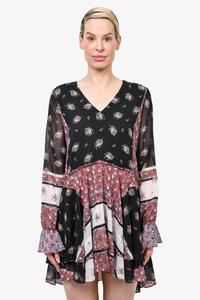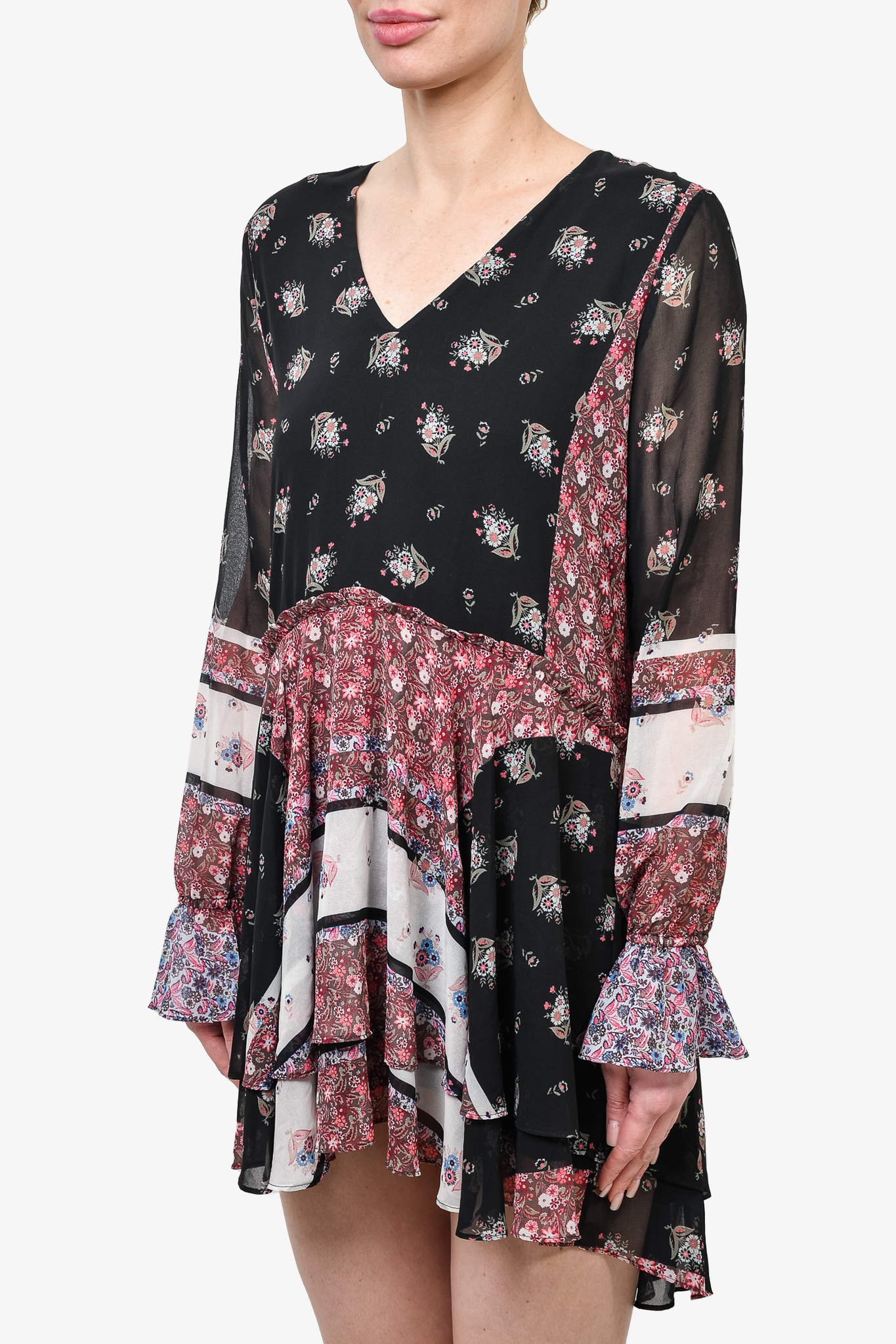 Rebecca Minkoff Black/Pink Floral Patchwork Flowy Dres. V-neck. Long-sleeved. Lined. Tonal stitching.