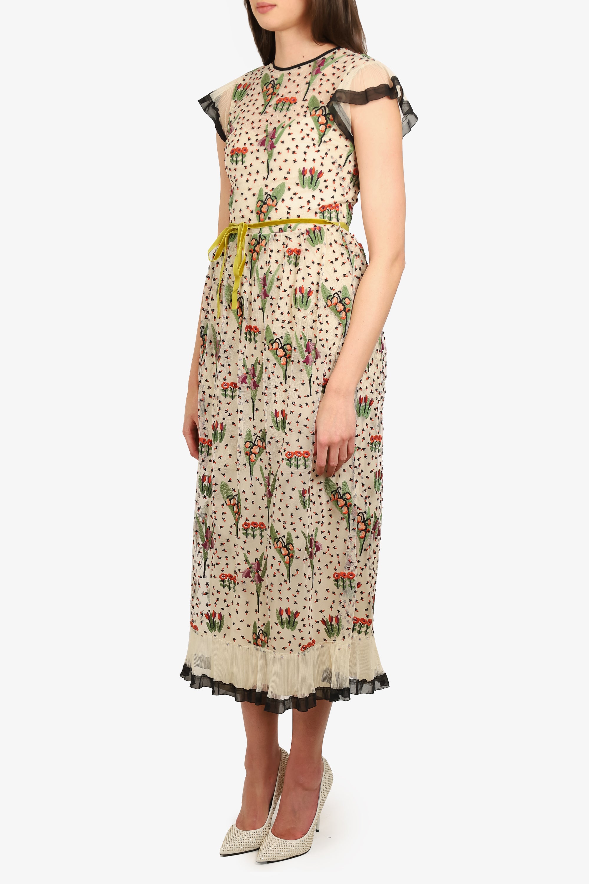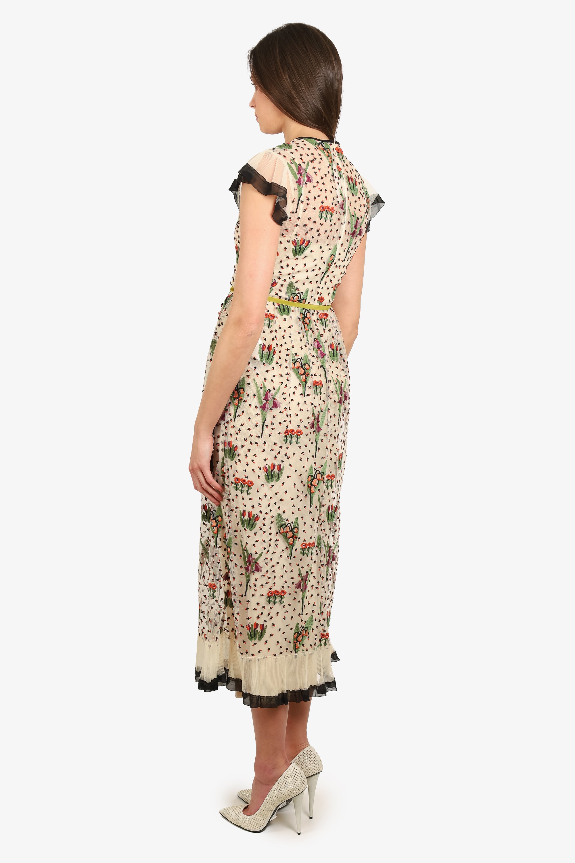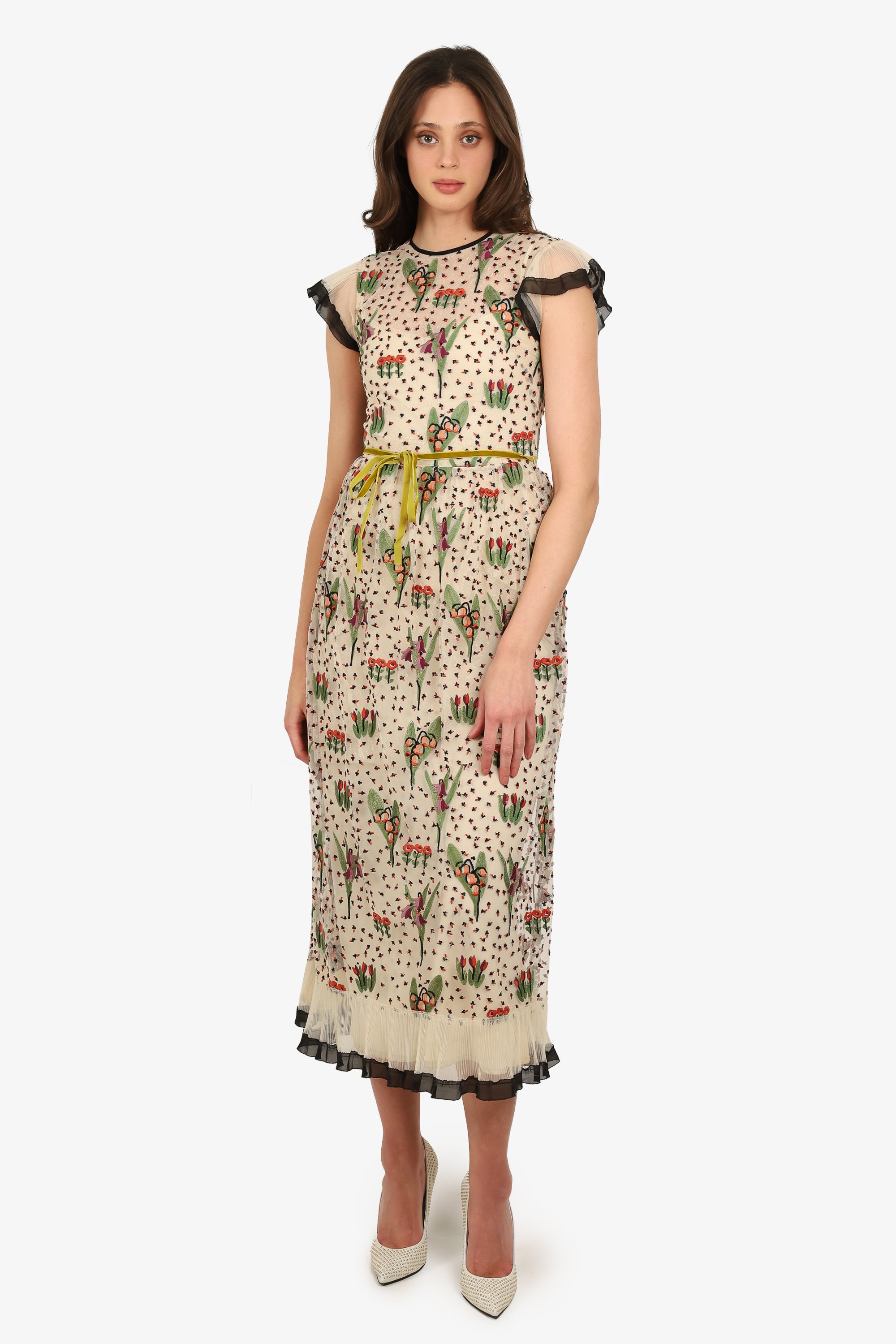 Refresh availabilityRed Valentino Beige/Green Sheer Floral Embroidered Belted Short Sleeve Maxi Dress. Back zipper closure. Lined. Tonal stitching.