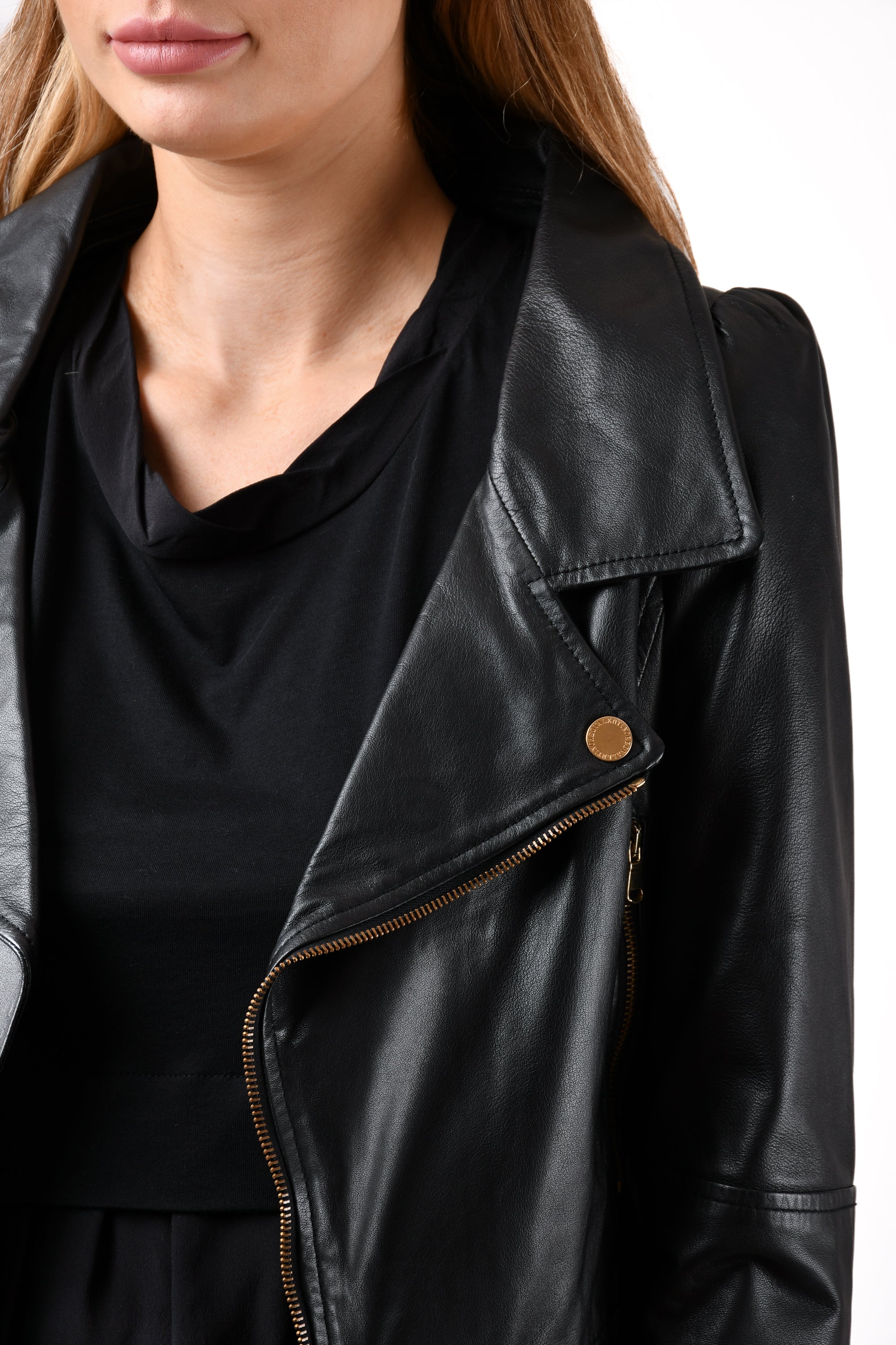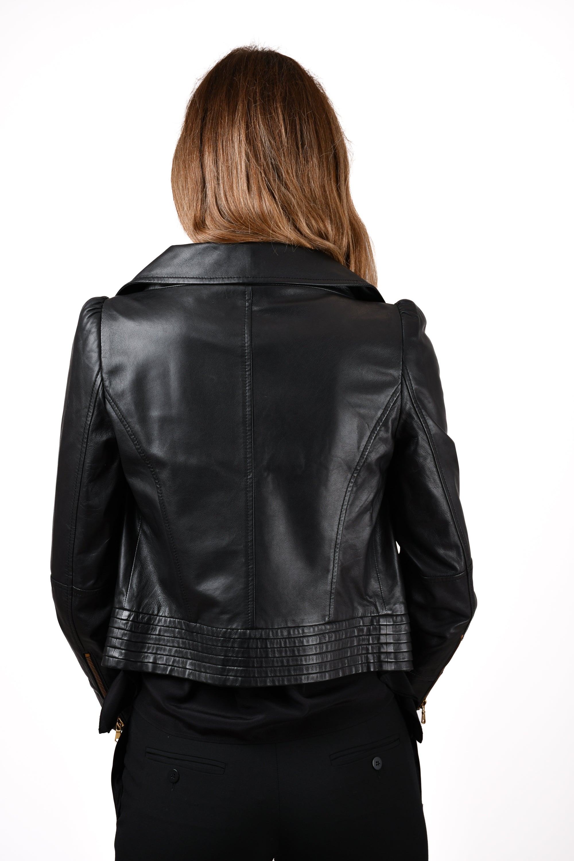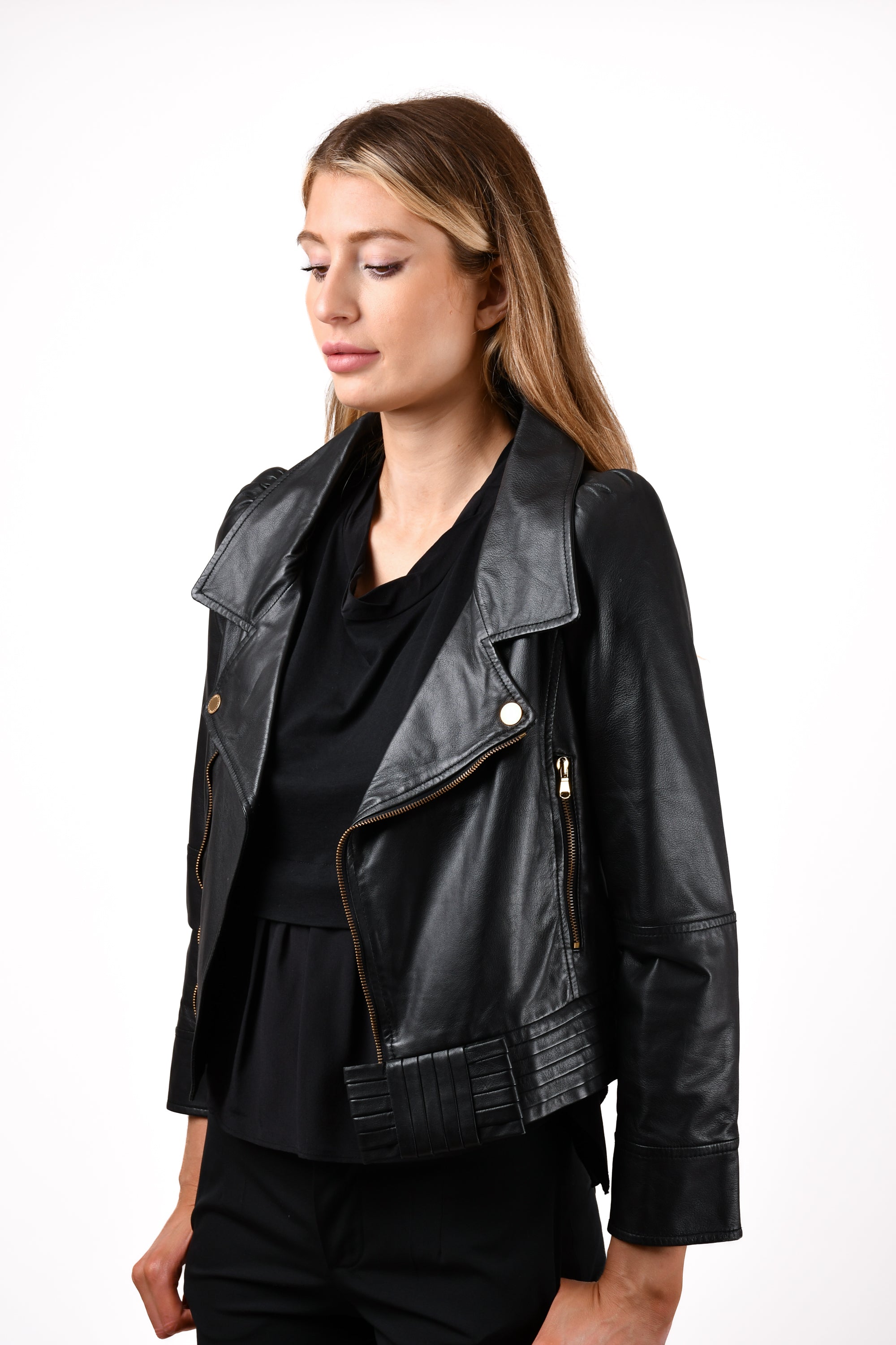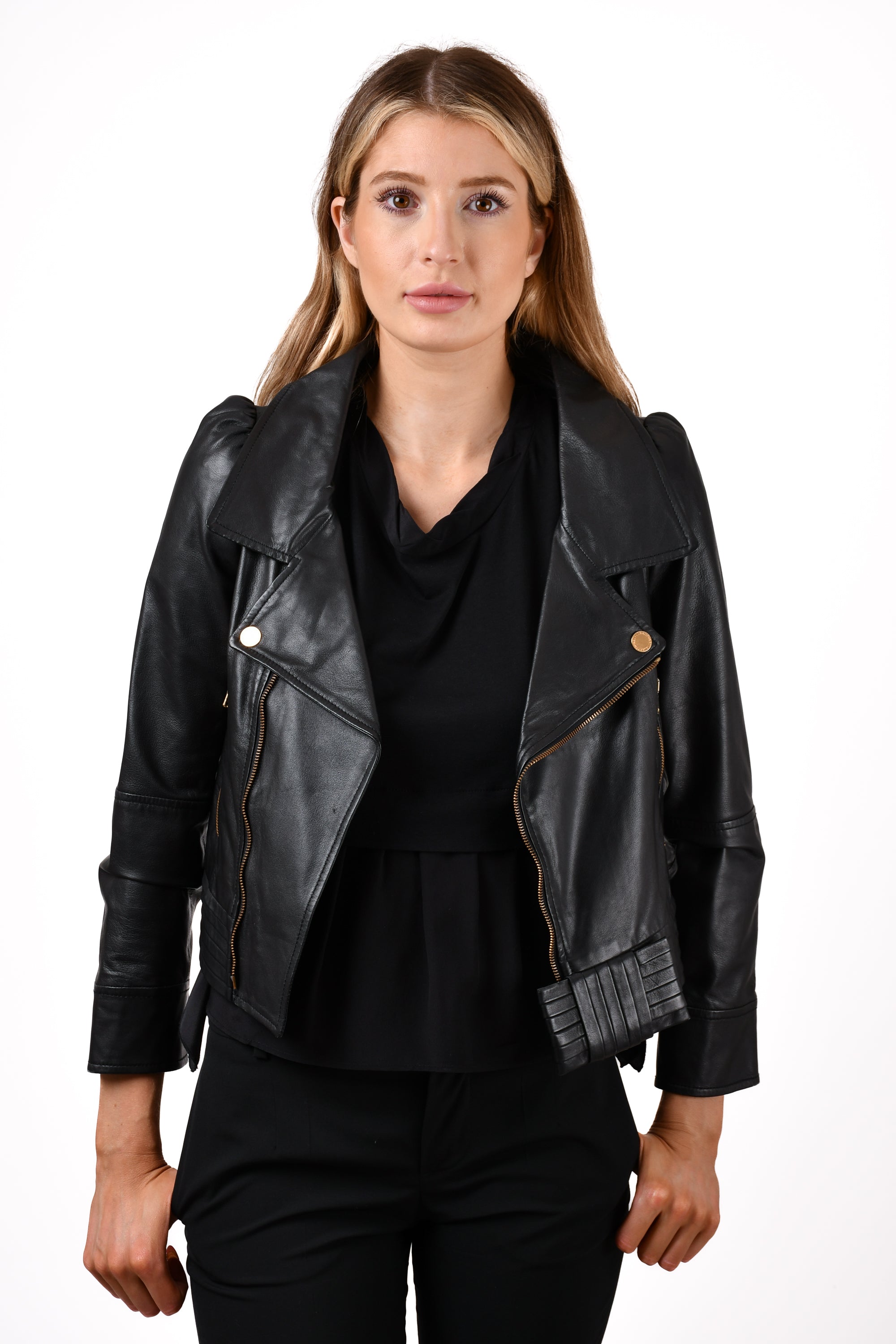 Red Valentino Black Leather Jacket With Bow Detail. Gold zipper closure. Side pockets with gold zipper closure. Gold zipper closure at cuffs. Black lining. Tonal stitching.