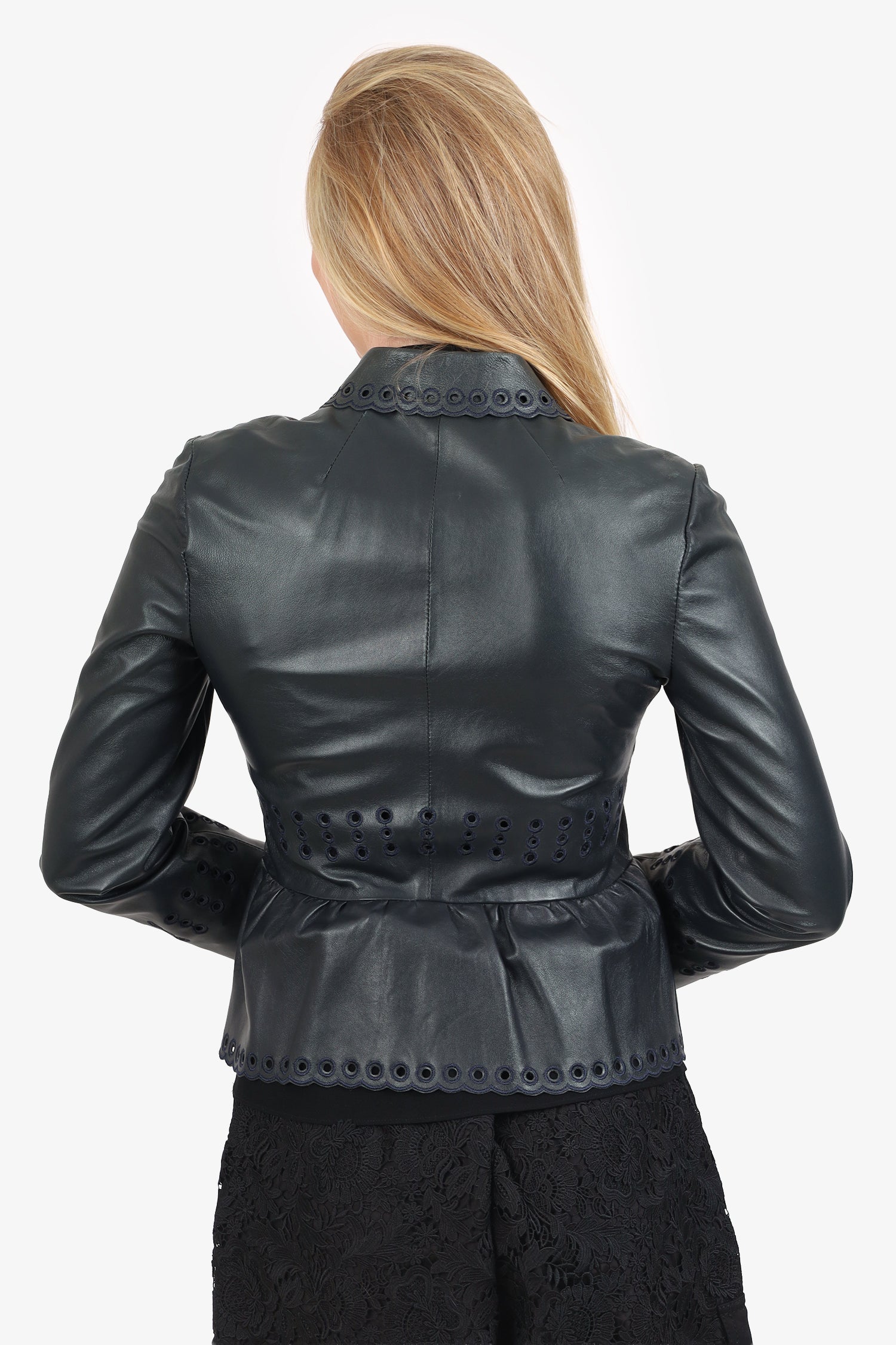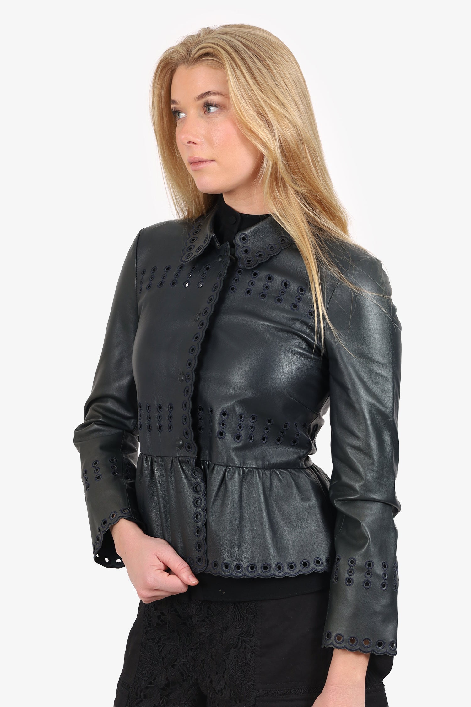 Red Valentino Black Leather Scallop Trim Jacket Size 42