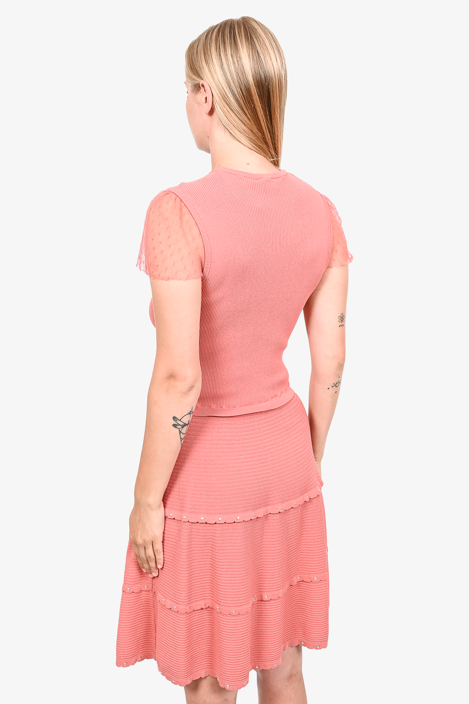 Refresh availabilityRed Valentino Rose Mesh Sleeved Ribbed Midi Dress. Round neck. Pull-on. Tonal stitching.
