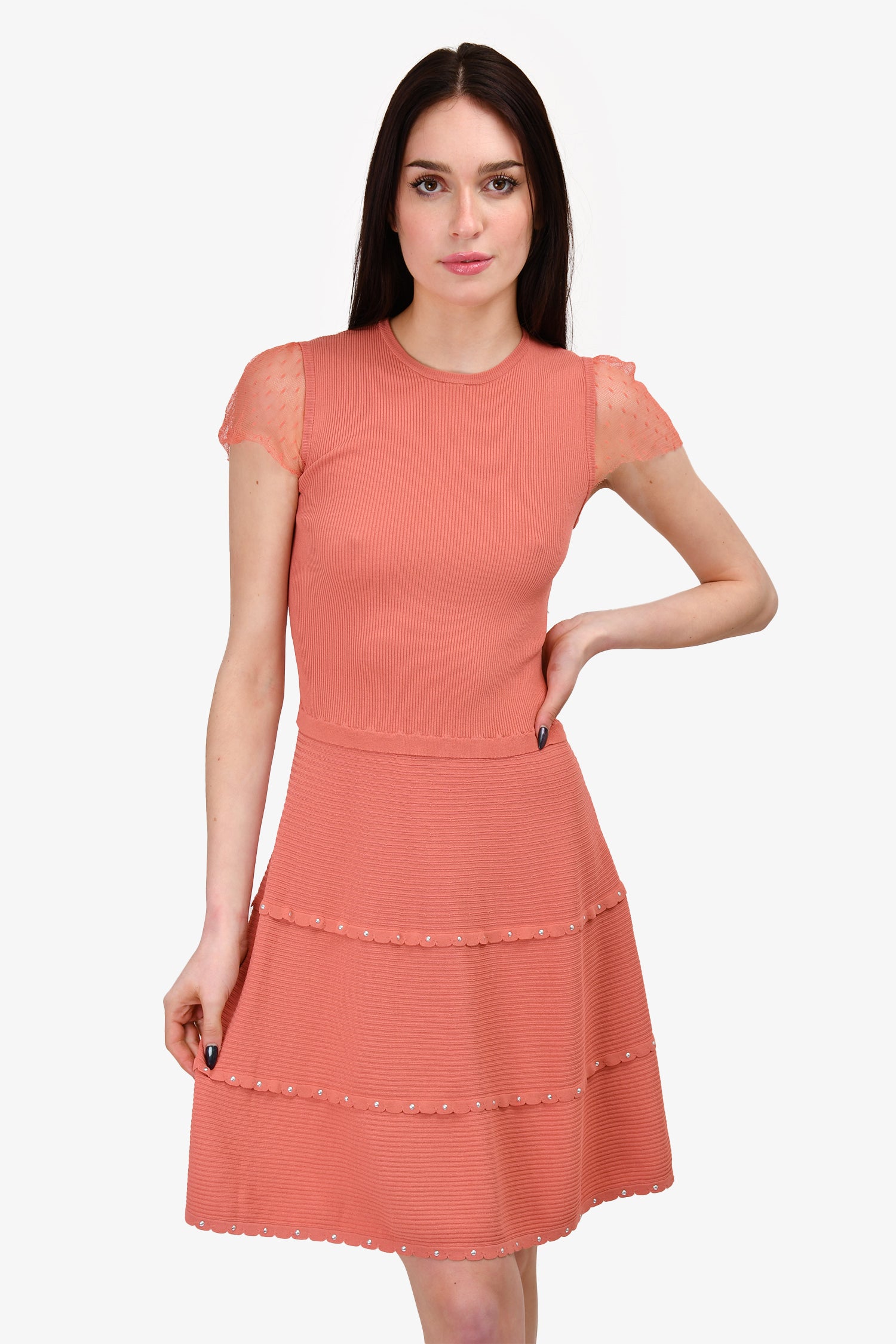 Refresh availabilityRed Valentino Rose Mesh Sleeved Ribbed Midi Dress. Round neck. Pull-on. Tonal stitching.