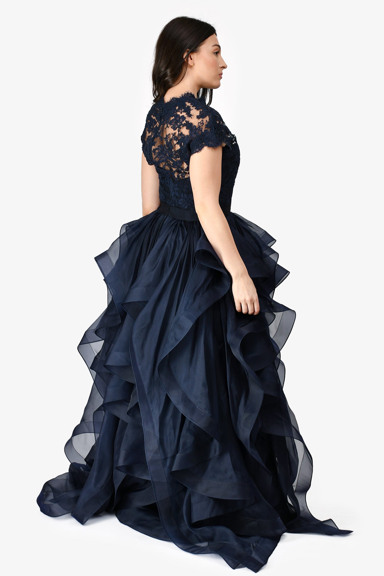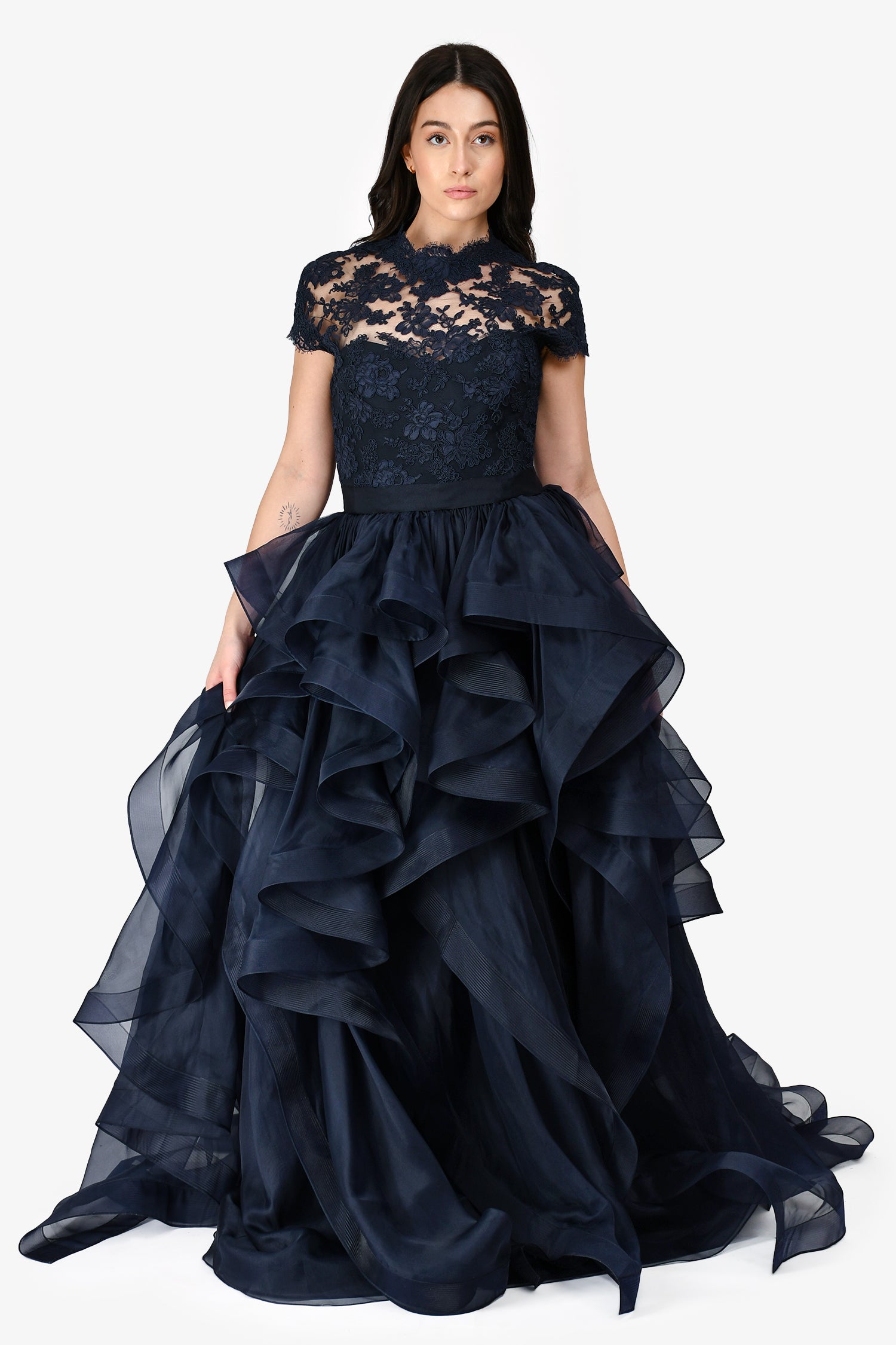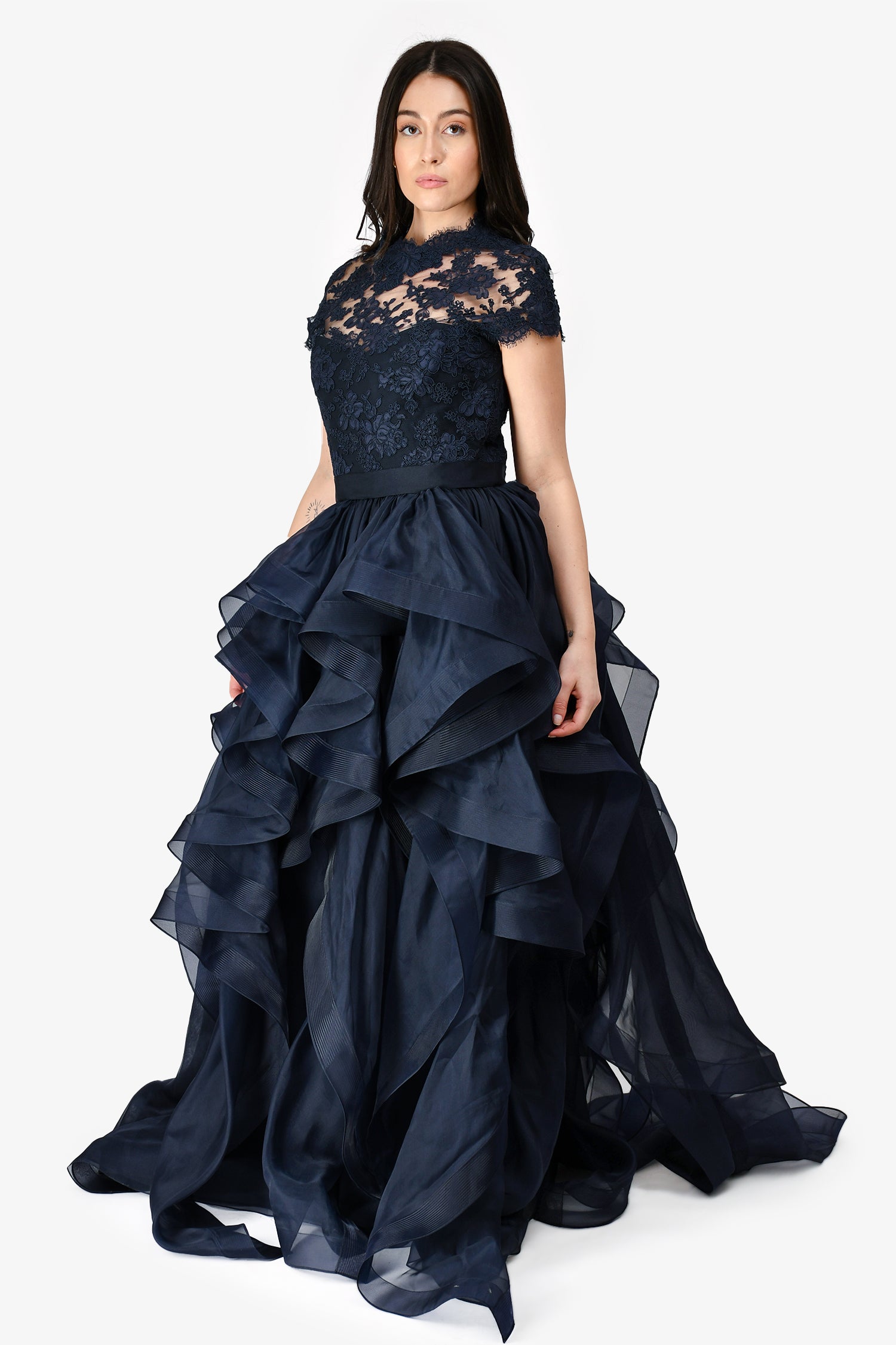 Reem Acra Navy Silk Embroidered Tiered Ruffled Gown. Back double zip closure. Lace detailing on the top. Ruffled with volume skirt. Lined interior. Tonal stitching.