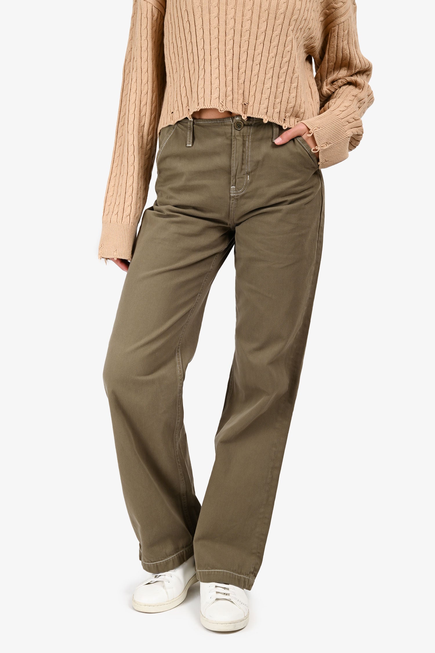 Refresh availabilityReformation Green Twill 'Dorsey' High Rise Relaxed Jeans. Pull-on. Hidden zipper and button closure in the front. Belt loops at the waist. 2 exterior slip pockets. Contrast stitching.