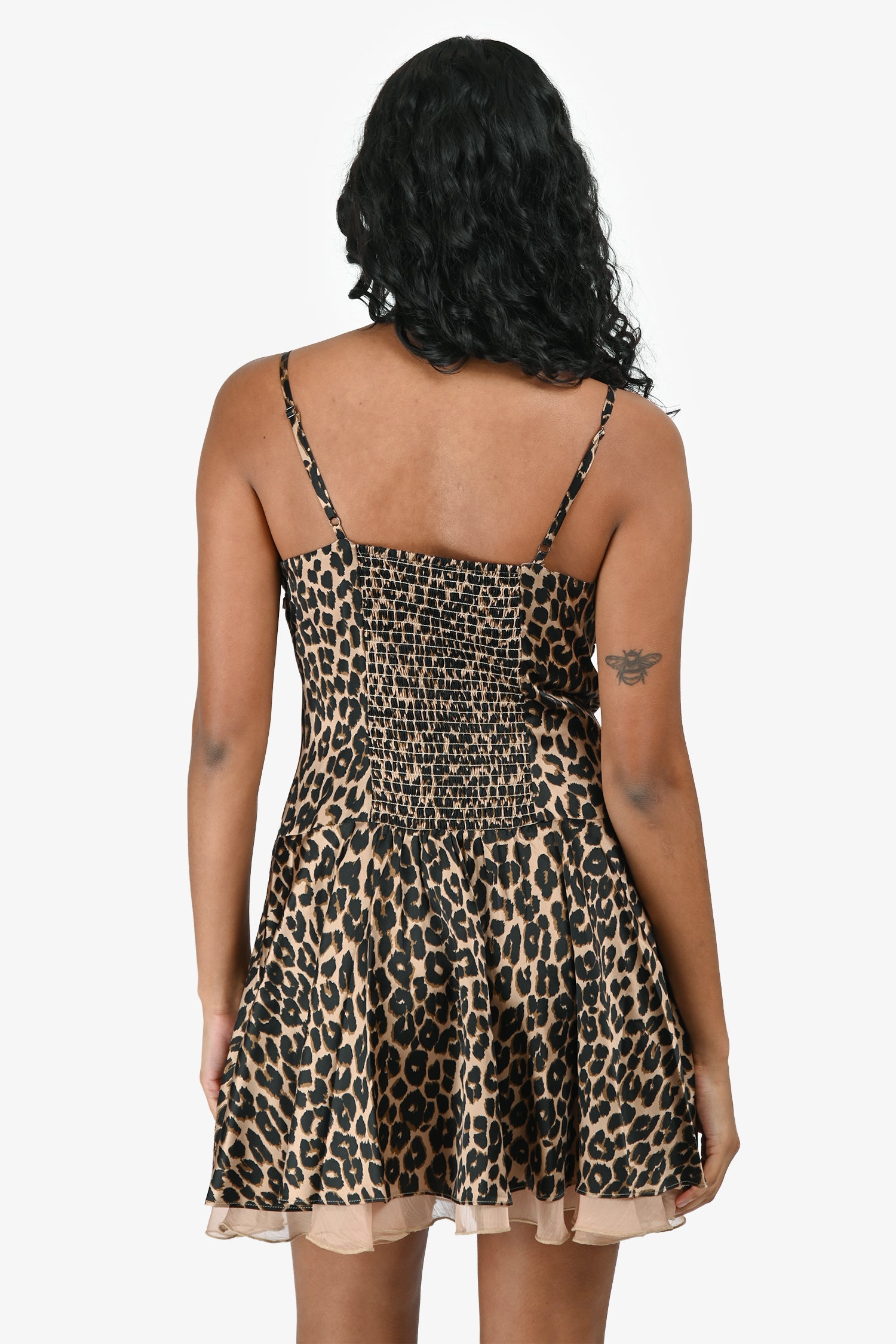 Refresh availabilityReformation Leopard Print Silk Mini Dress. Pull-on. Sweetheart neckline. Side zip closure. Adjustable straps. Lined interior. Tonal stitching.