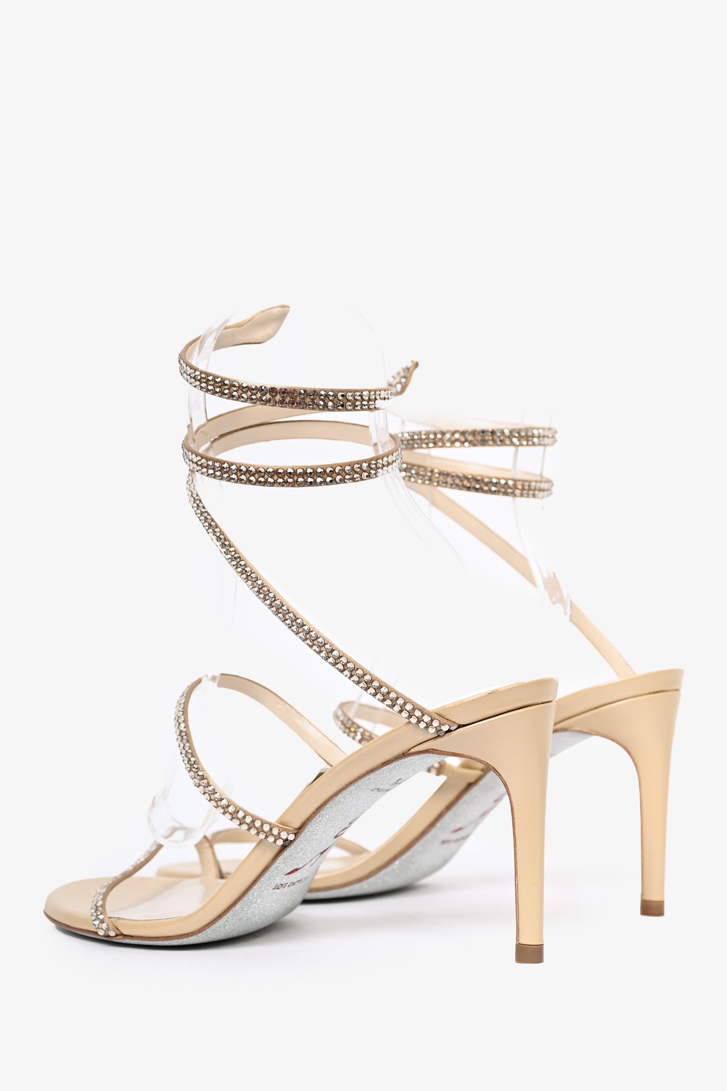 Refresh availabilityRene Caovilla Beige Crystal Cleo Heels. Signature glitter sparkly bottoms. Open toe. Structured ankle wrap.