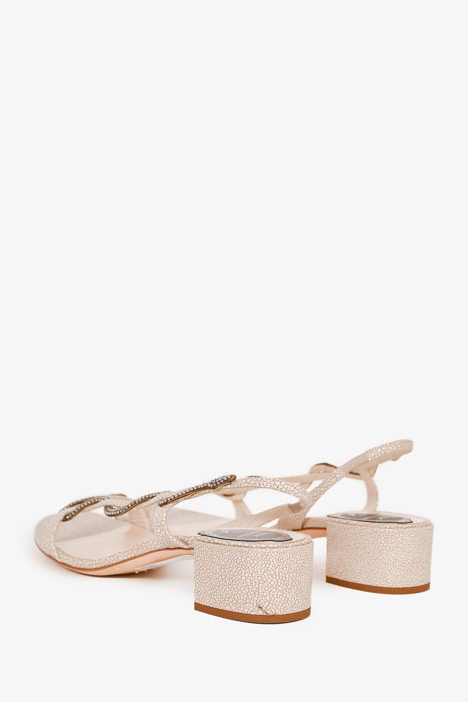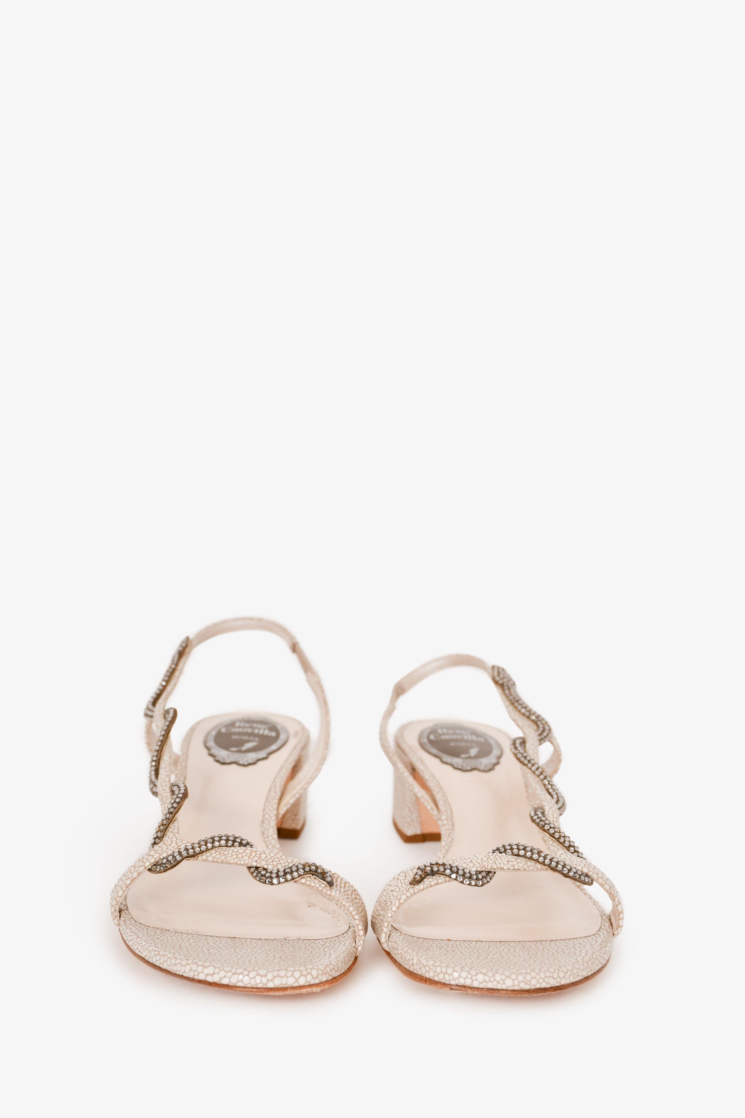 Refresh availabilityRene Caovilla Beige Leather Crystal Embellished Margot Sandals. Rounded toe. Crystal embellishment. Elasticated slingback. Block heel. Tonal stitching.