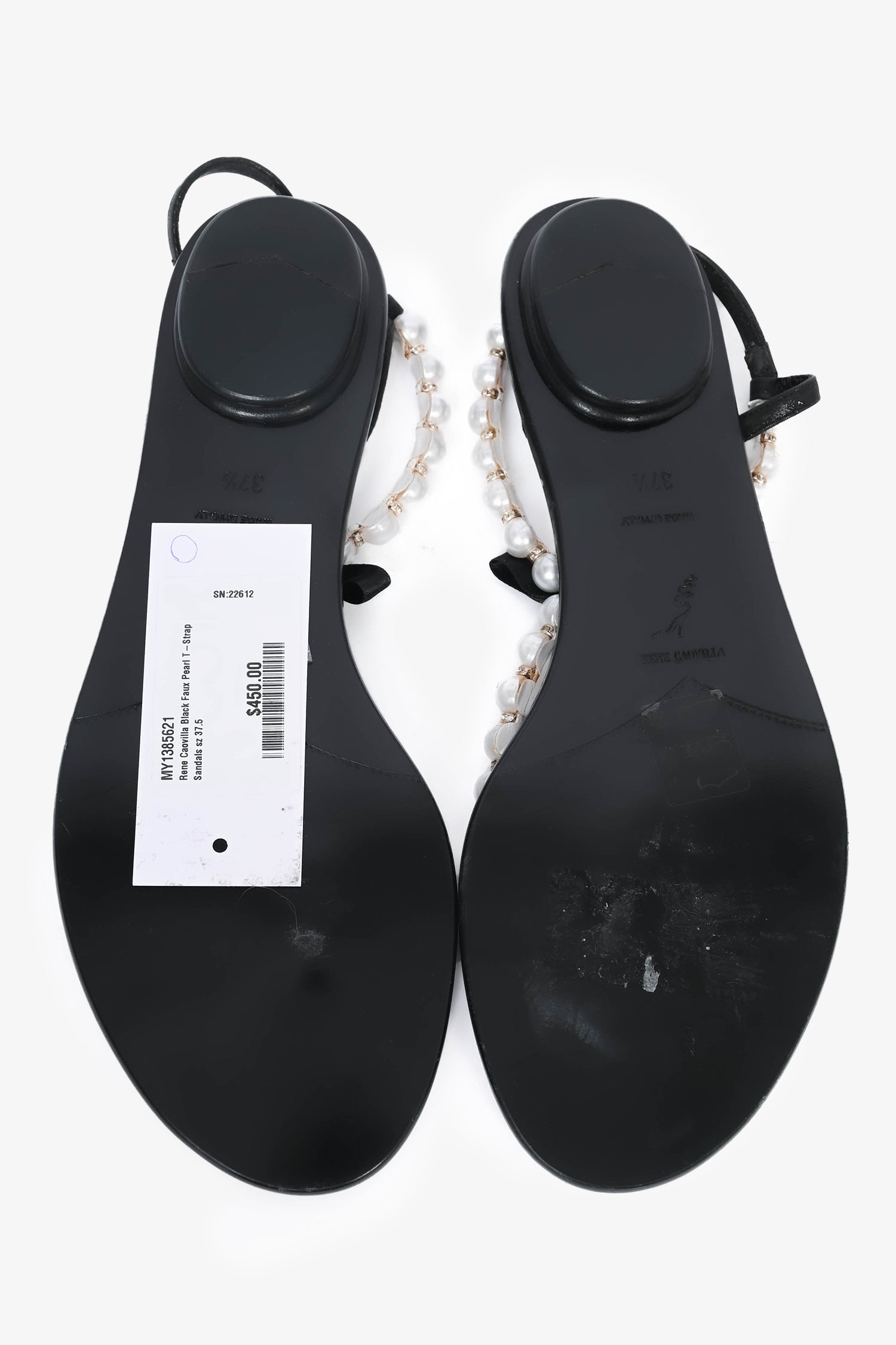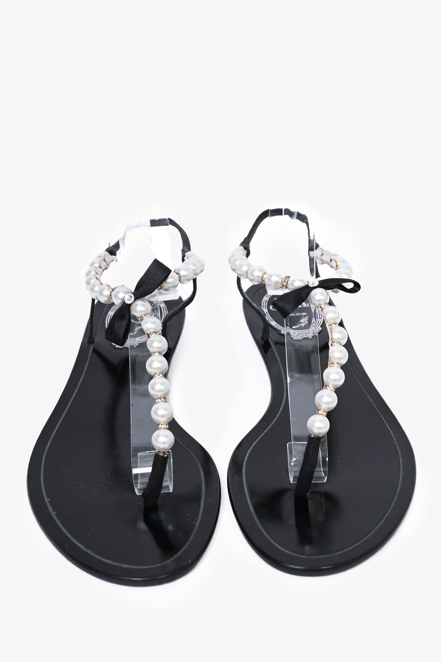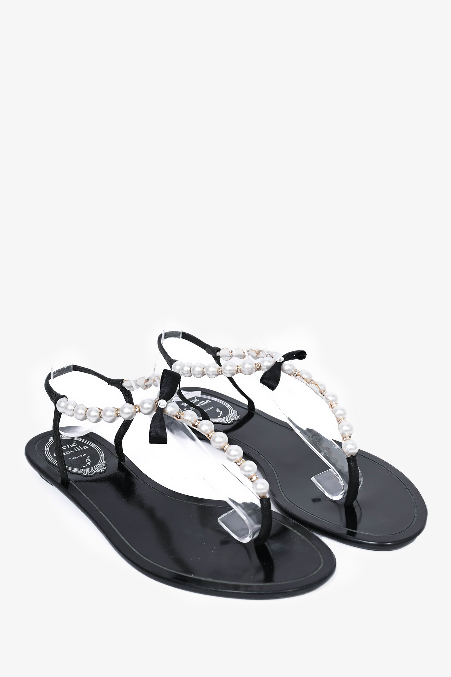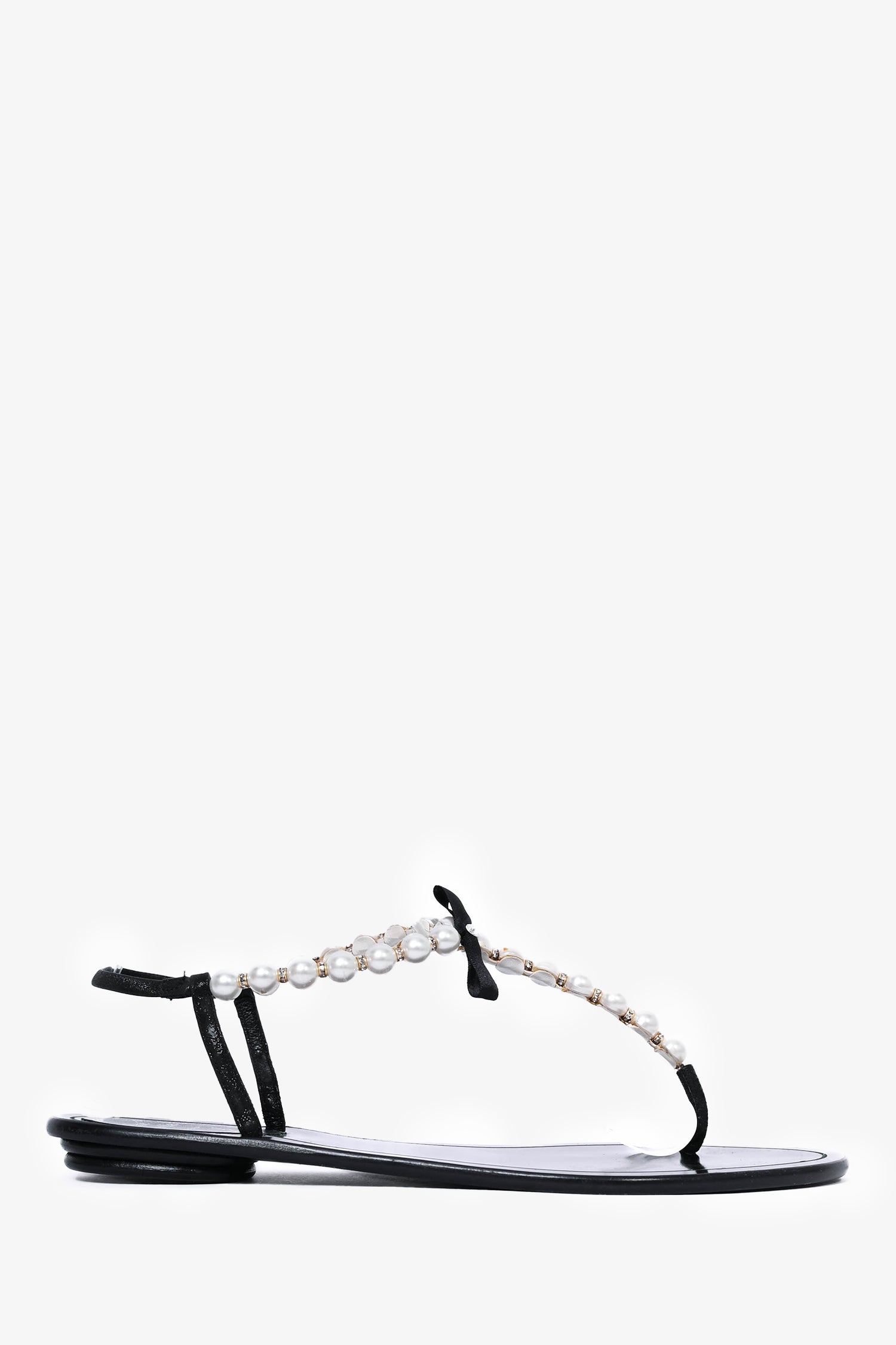 Refresh availabilityRene Caovilla Black Faux Pearl T-Strap Sandals. Round toe. Faux pearl accents with bow detail. Iridescent straps.