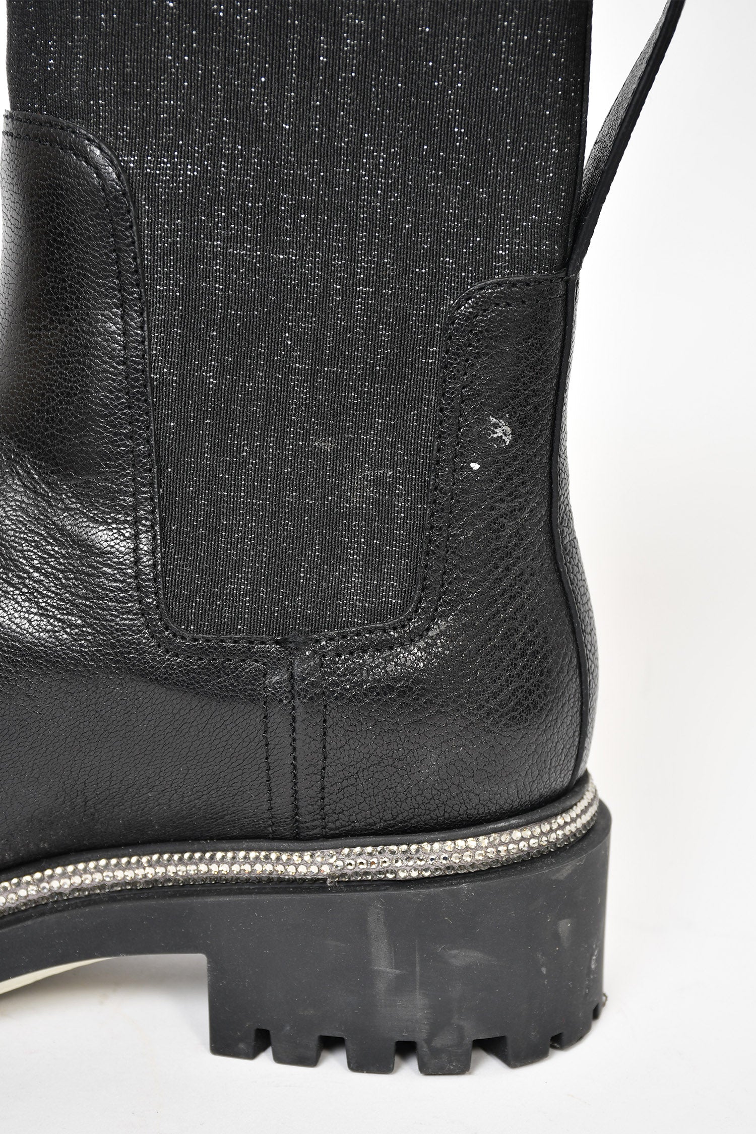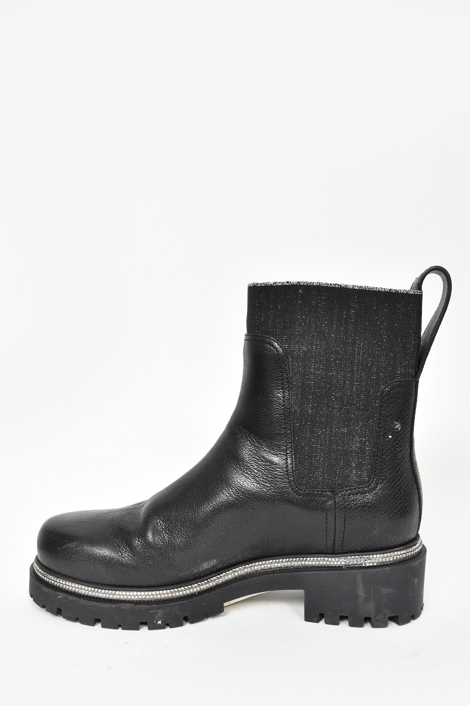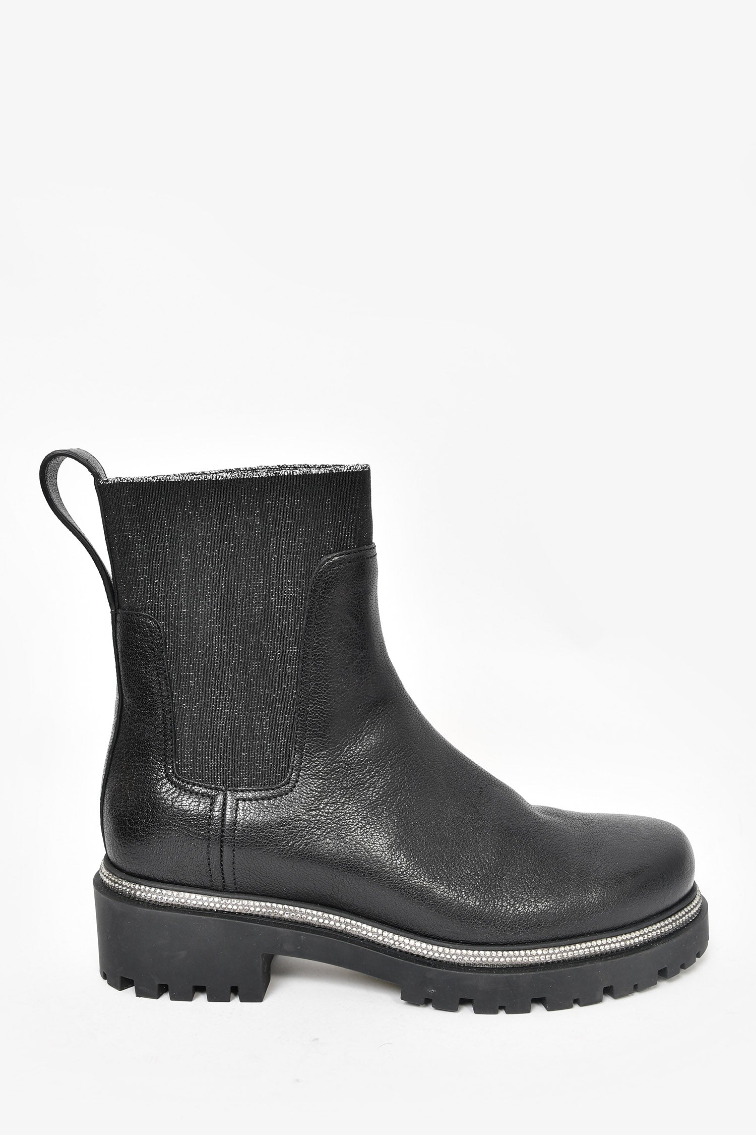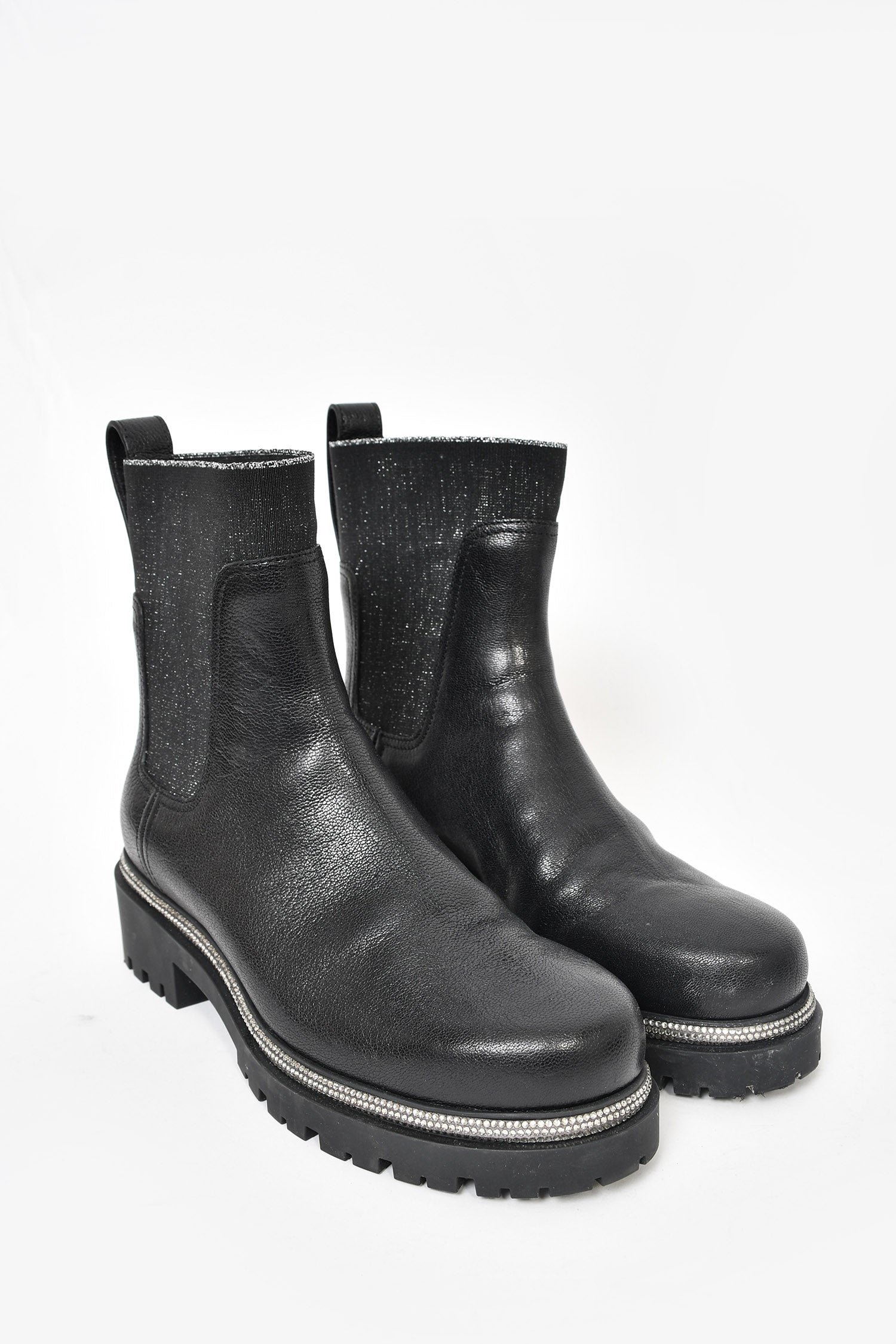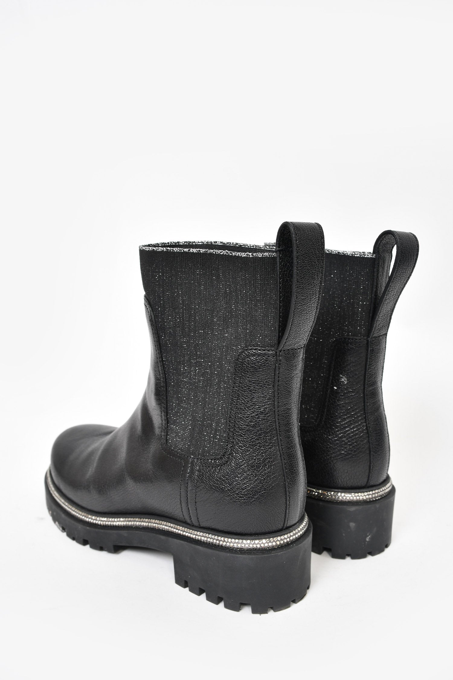 Rene Caovilla Black Leather Chelsea Boots with Crystal Trim Size 37
