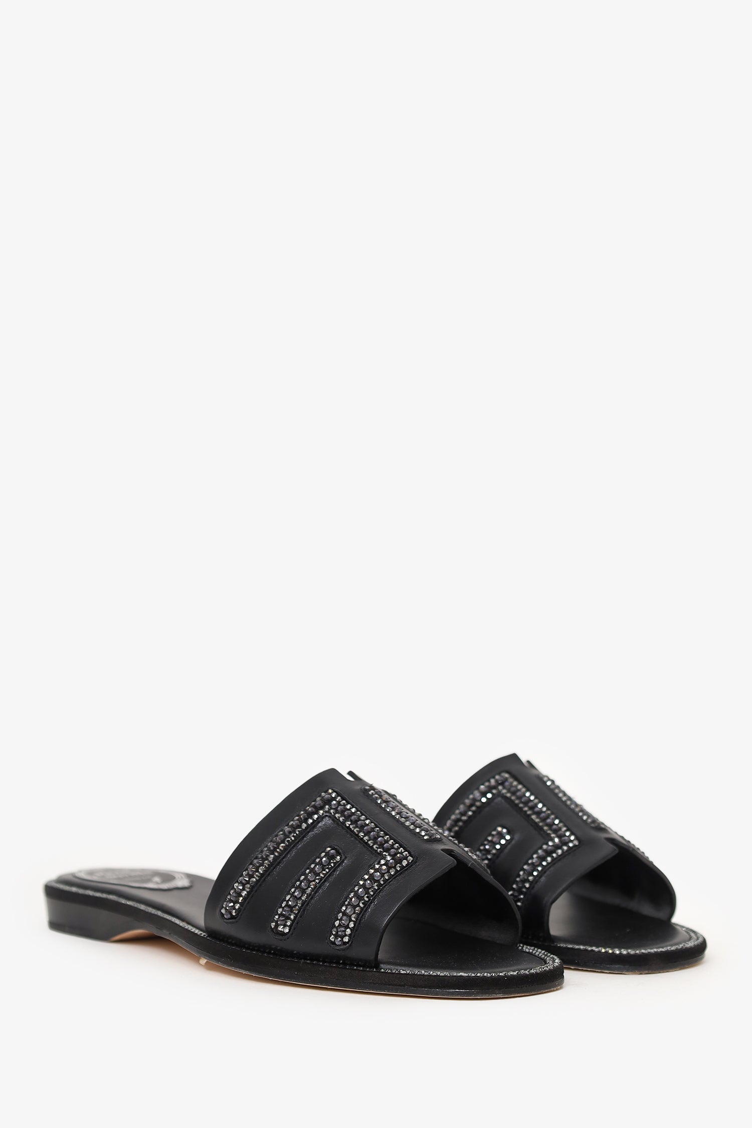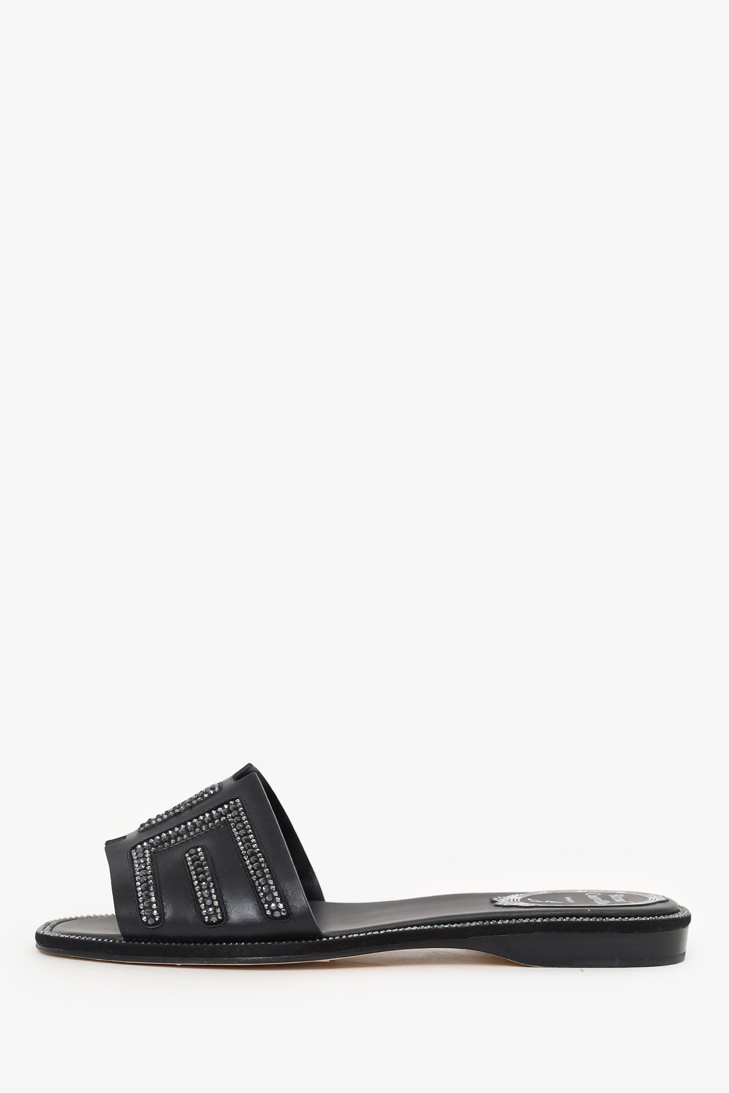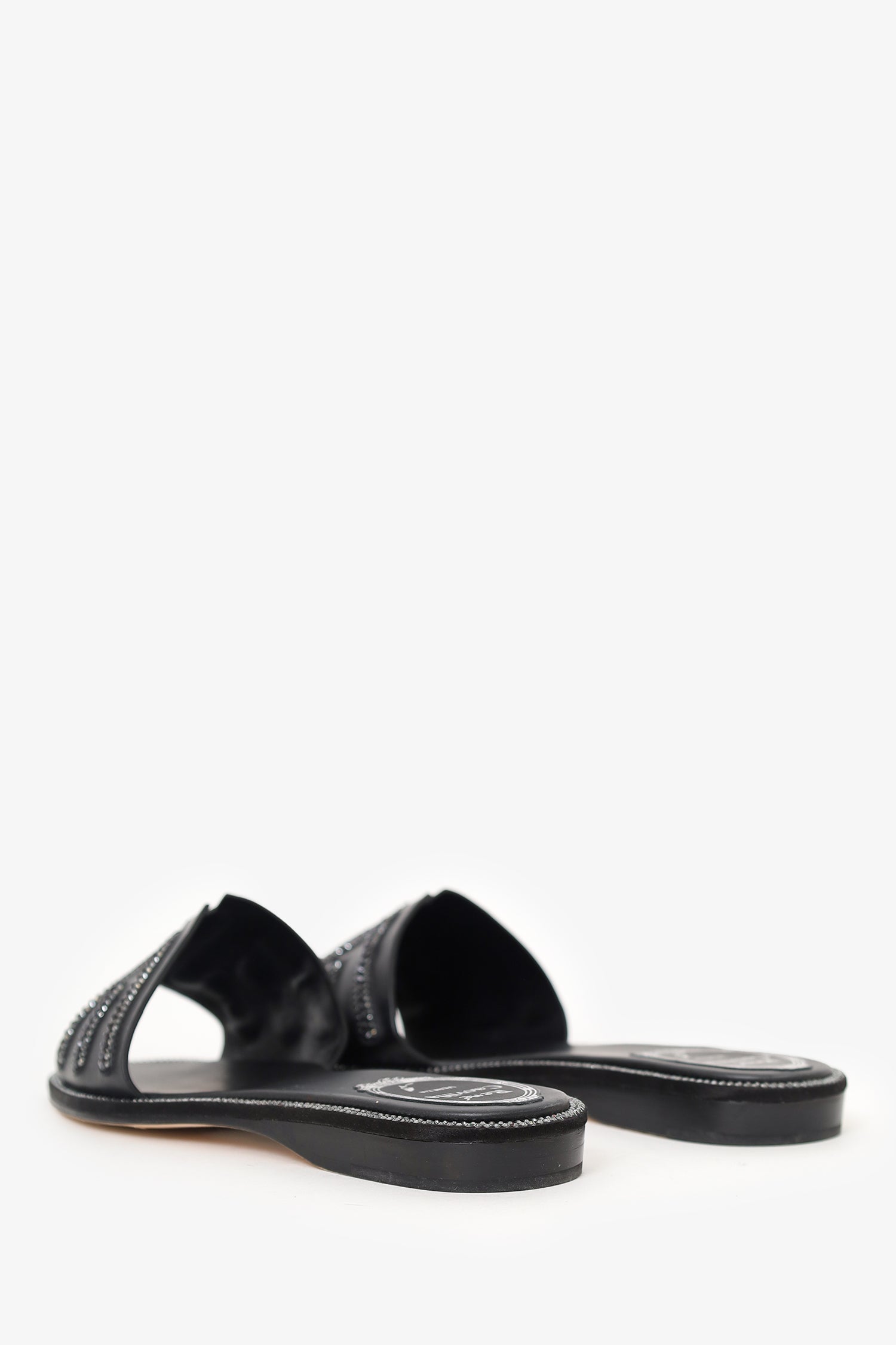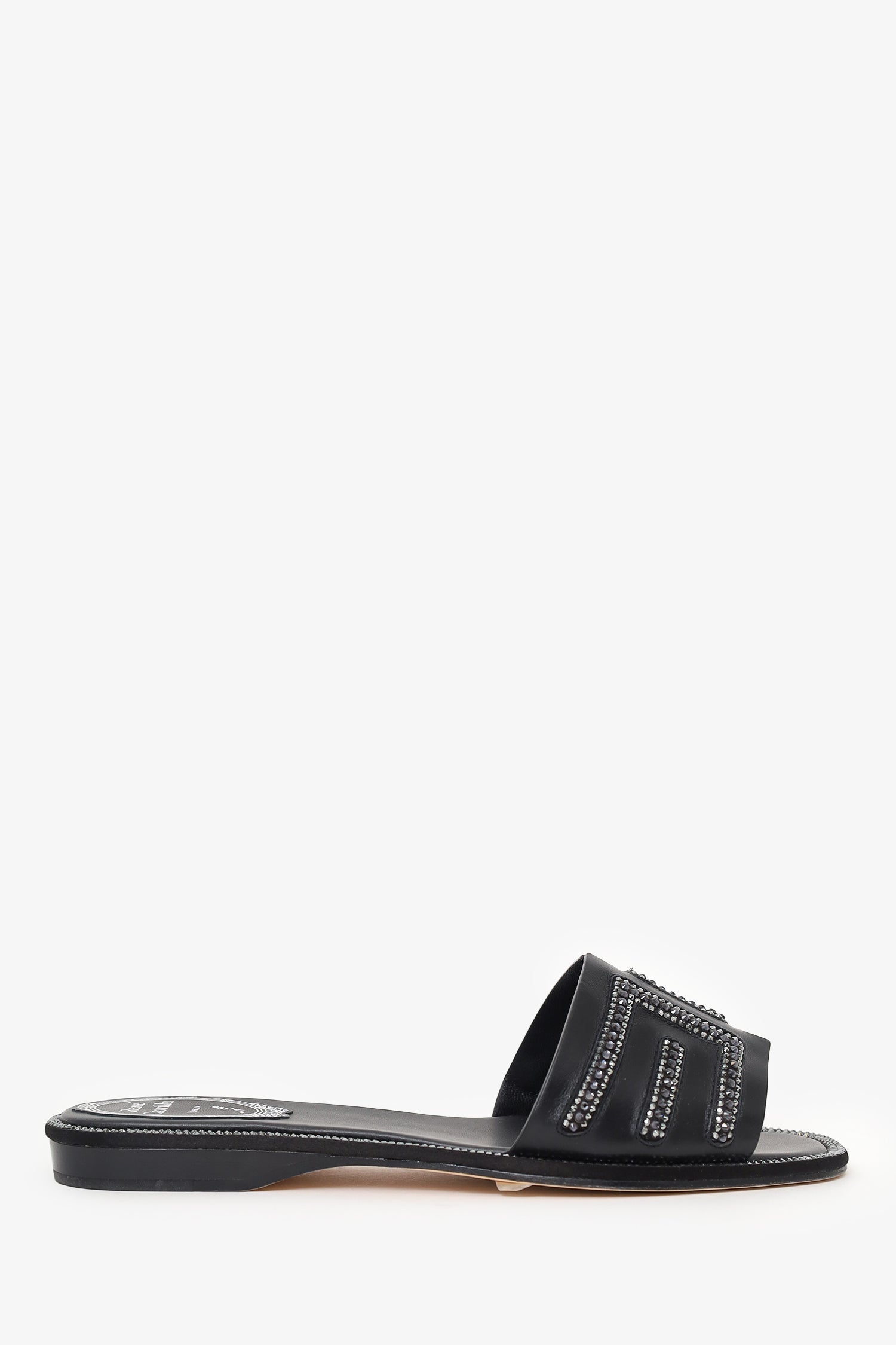 Refresh availabilityRene Caovilla Black Leather Swarovski Crystal Embellished Flat Slides. Slip-on. Round toe. Leather insole. Tonal stitching.