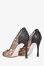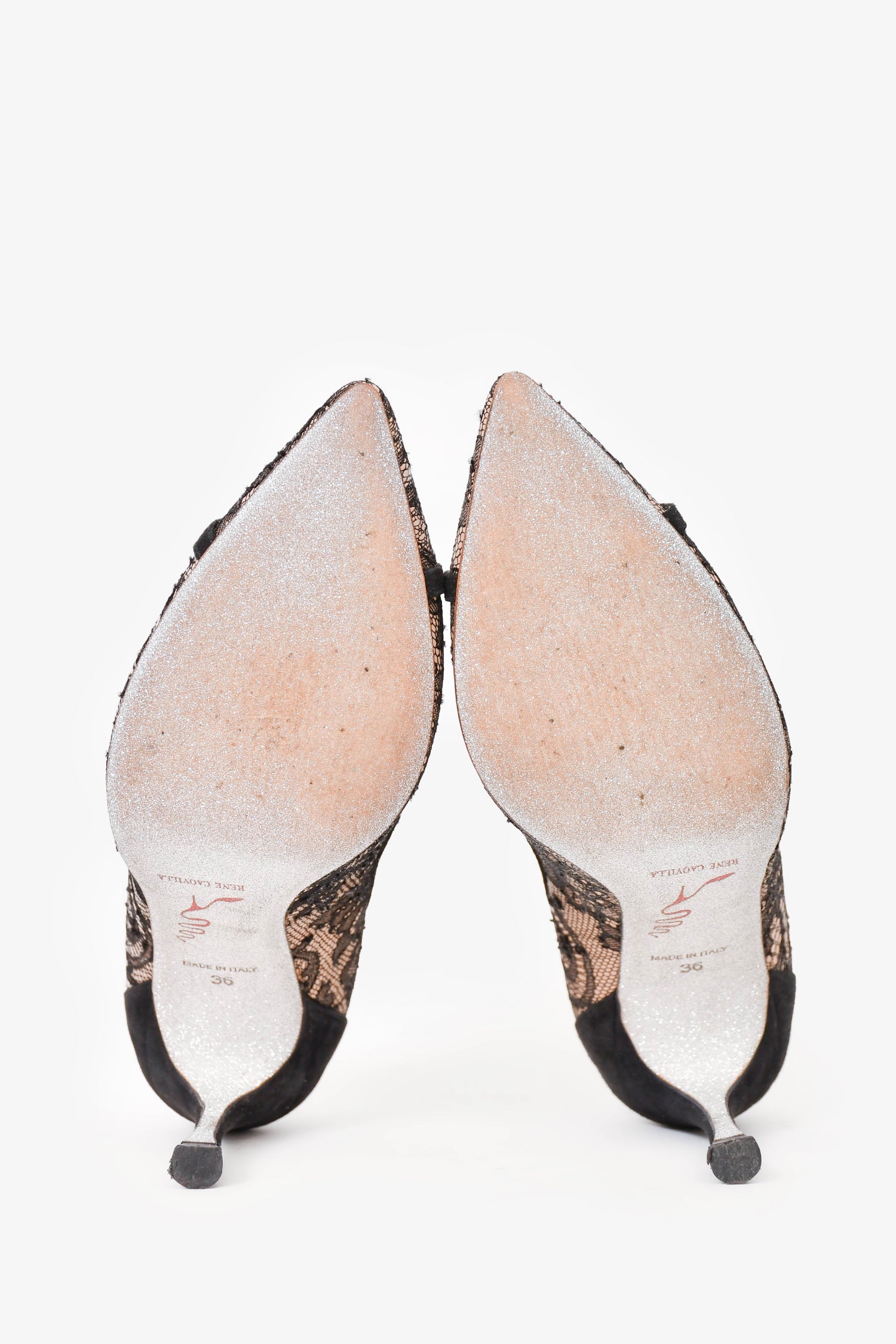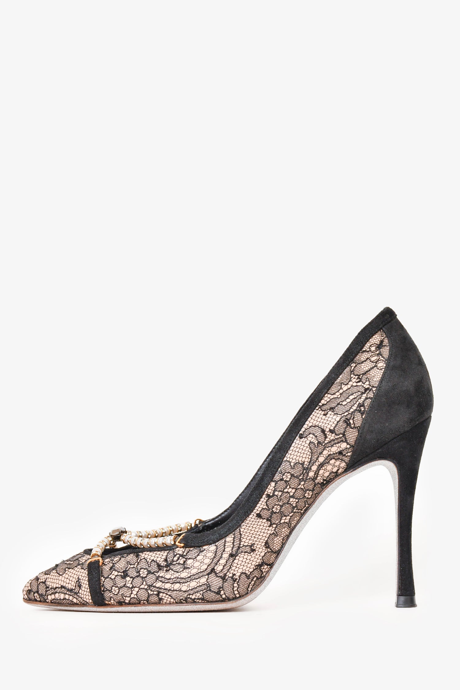 Refresh availabilityRené Caovilla Black/Nude Lace Cross Pearl Pumps. Pointed toe. Gold-tone hardware. Lace overlay. Tonal stitching.