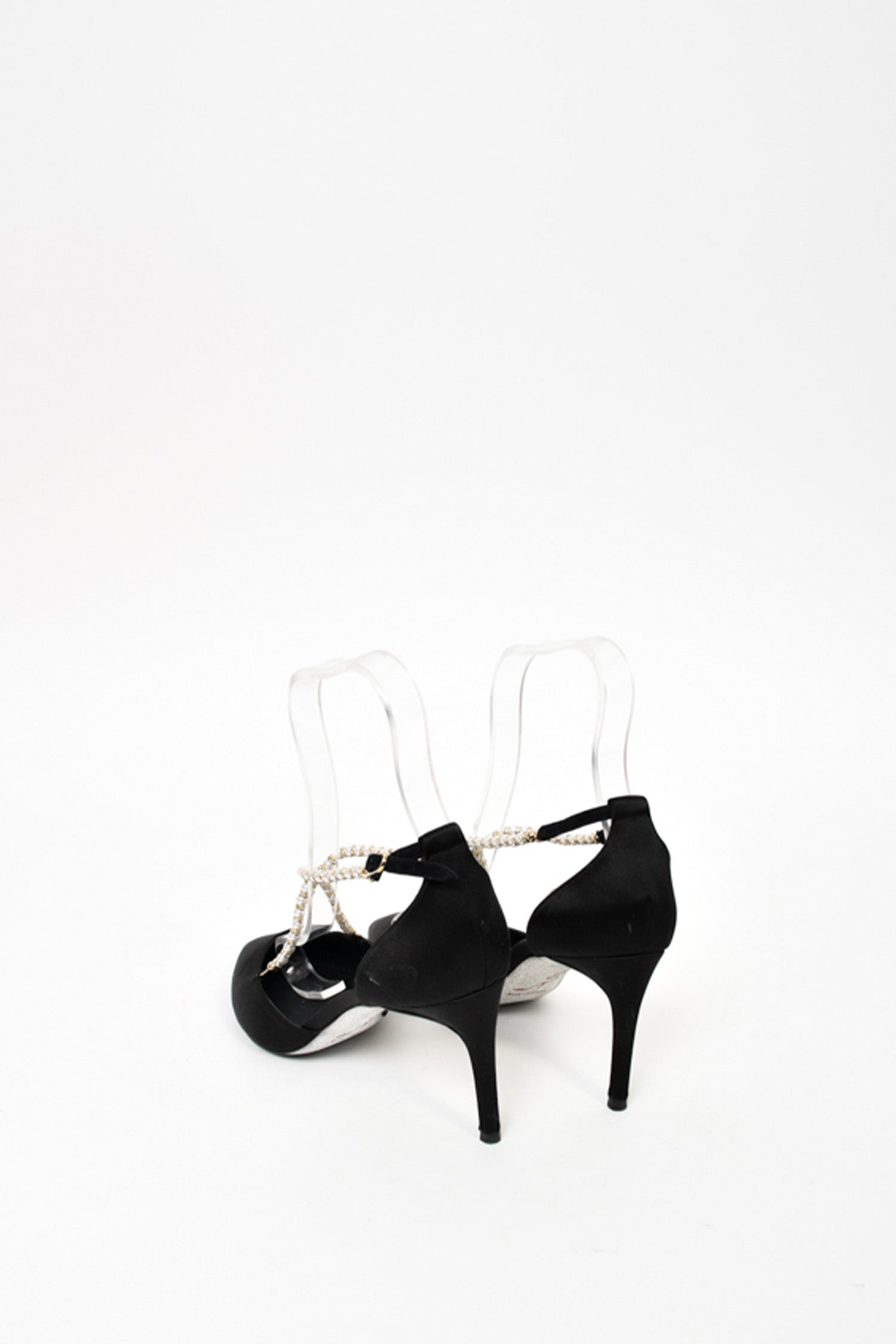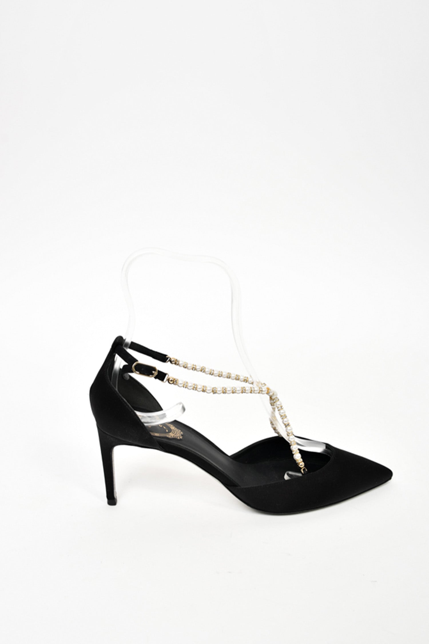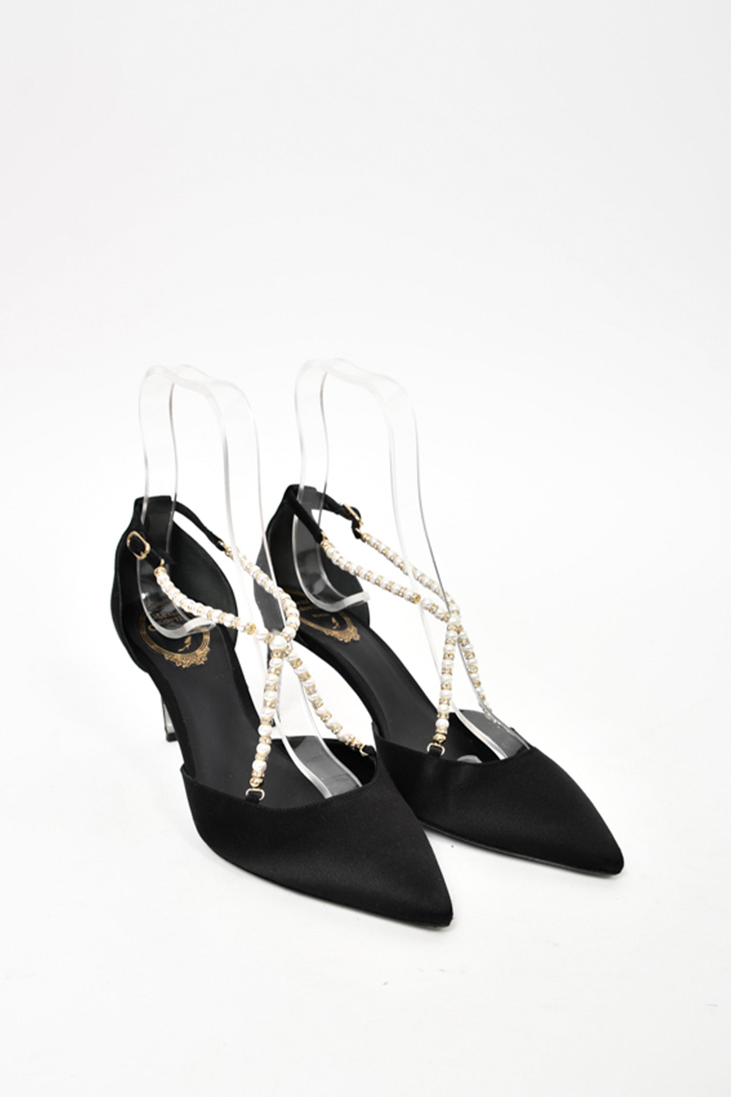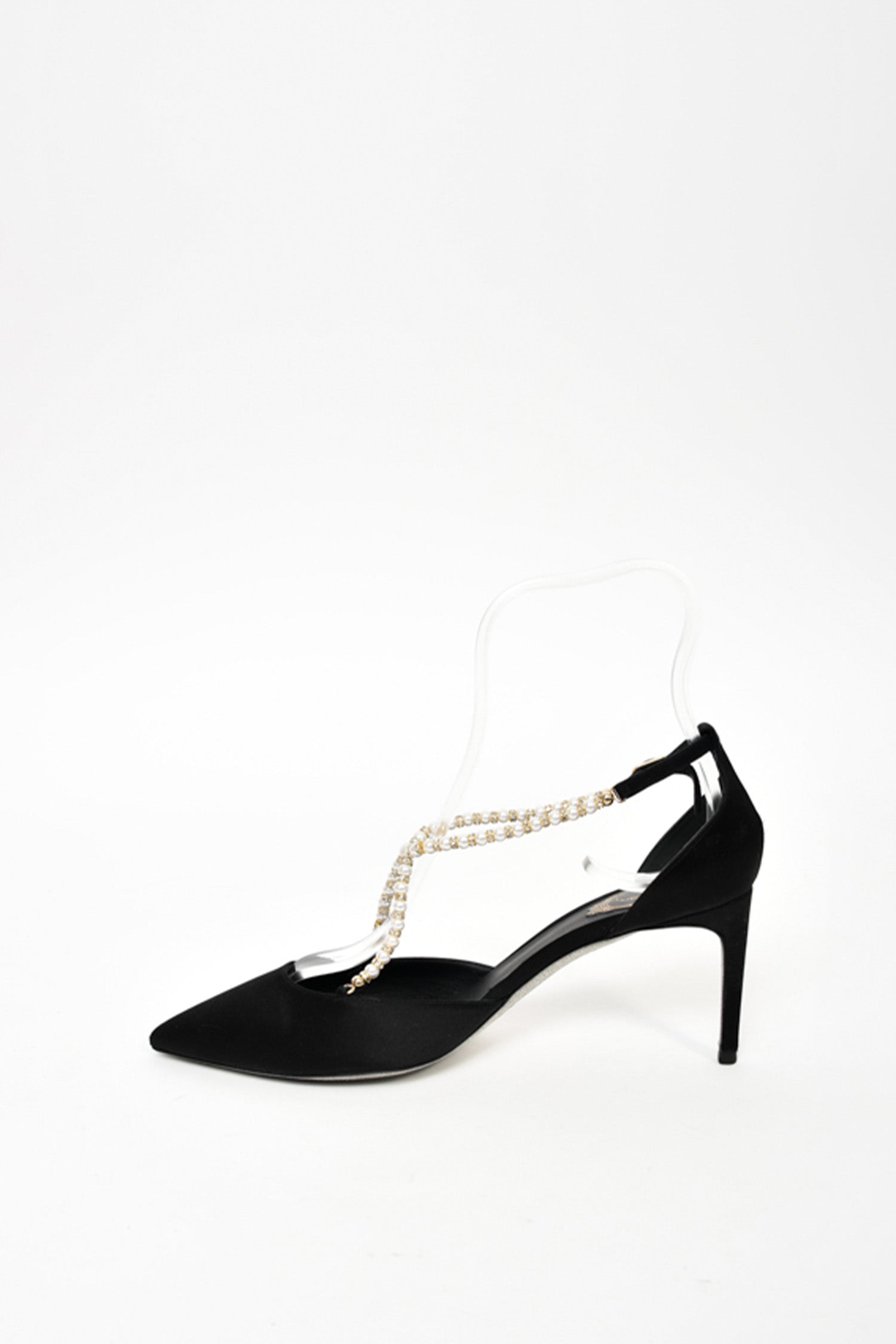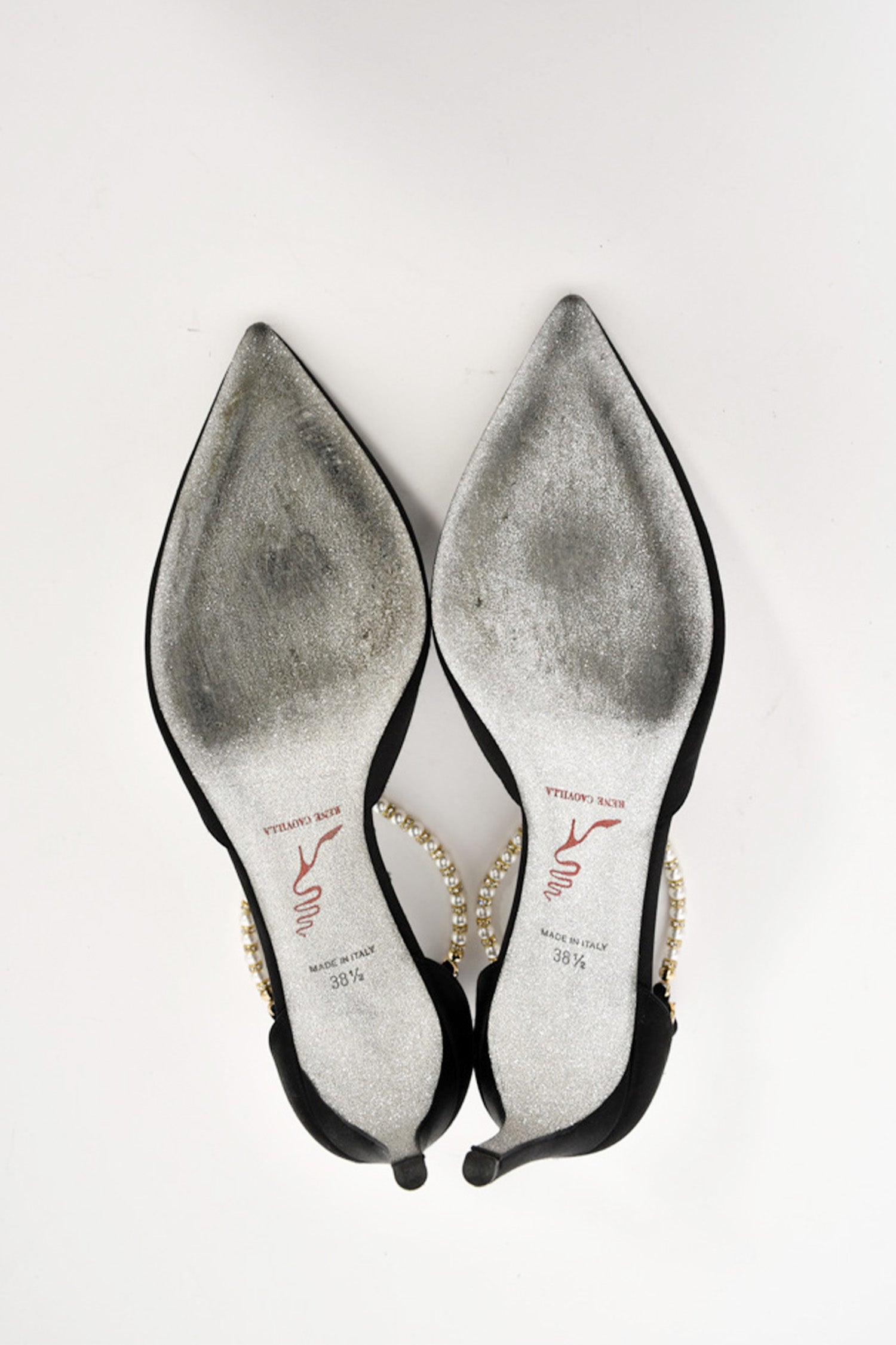 Refresh availabilityRene Caovilla Black Satin Pearl Crossover Strap Kitten Heels. Signature glitter bottoms. Slip-on. Pointed toe. Ankle strap with buckle closure. Tonal stitching.